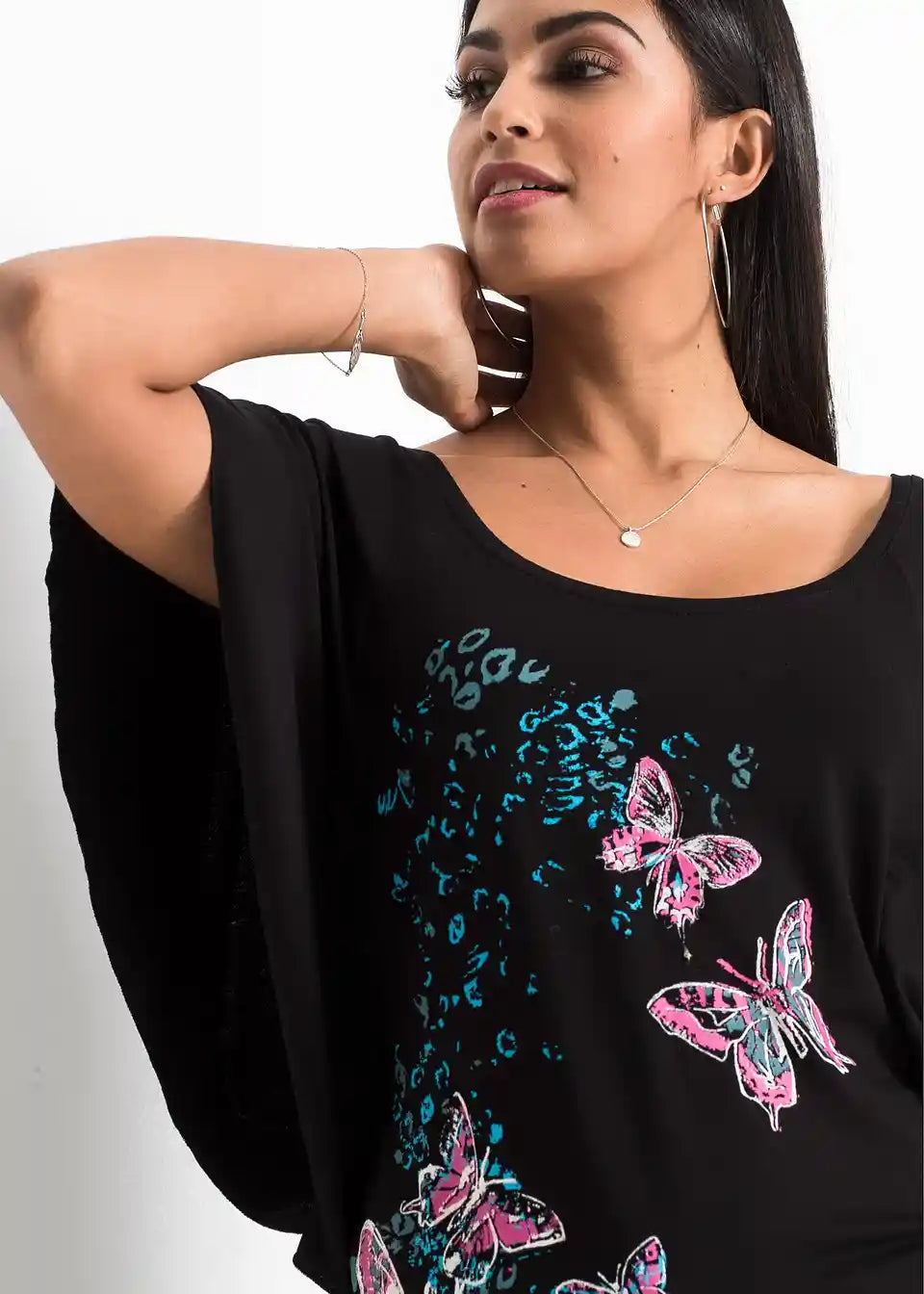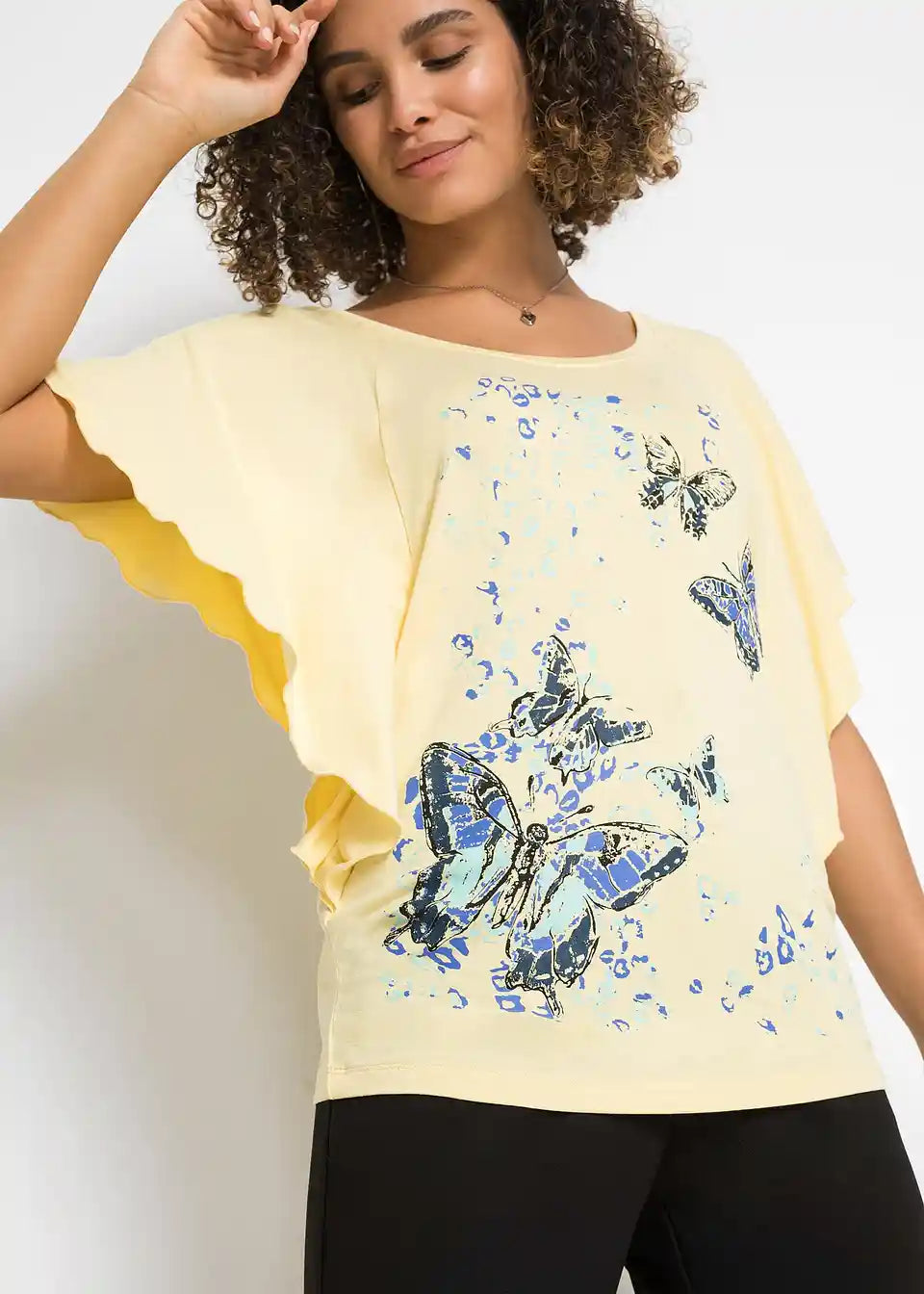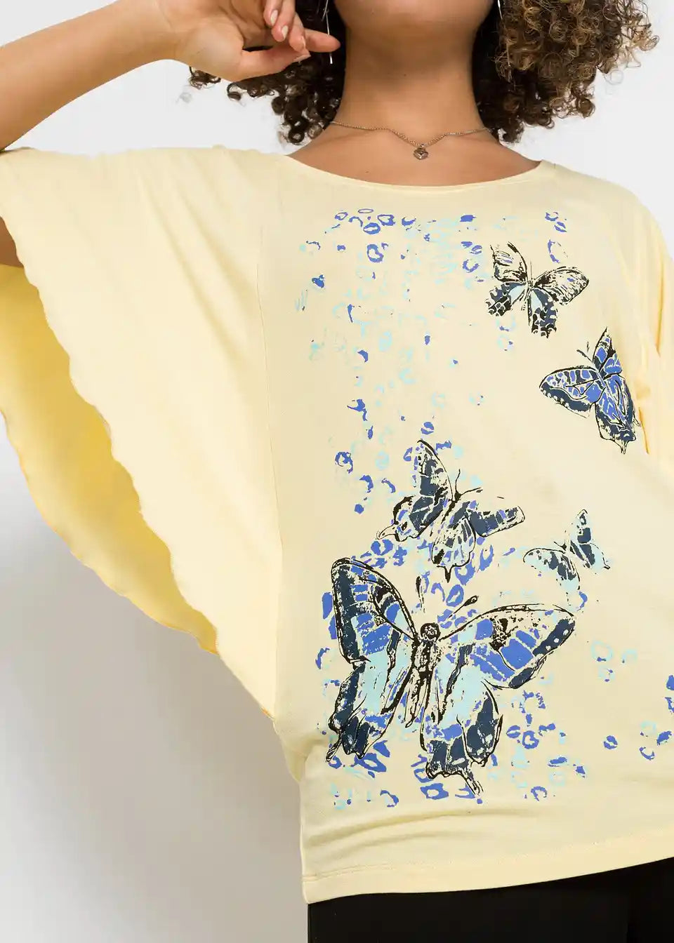 Iz kolekcije znamke BODYFLIRT prihaja ta privlačen netopirski shirt z okroglim izrezom. Različica z modnim metuljevim potiskom je prav tako elegantna kot enobarvni model. Poleti se k zgornjemu delu z netopirskimi rokavi in krojem, ki lepo pade, odlično prilegajo kratke hlače. V kombinaciji s stilskimi sandali in lepo torbico je videz za modno ozaveščeno damo popoln.