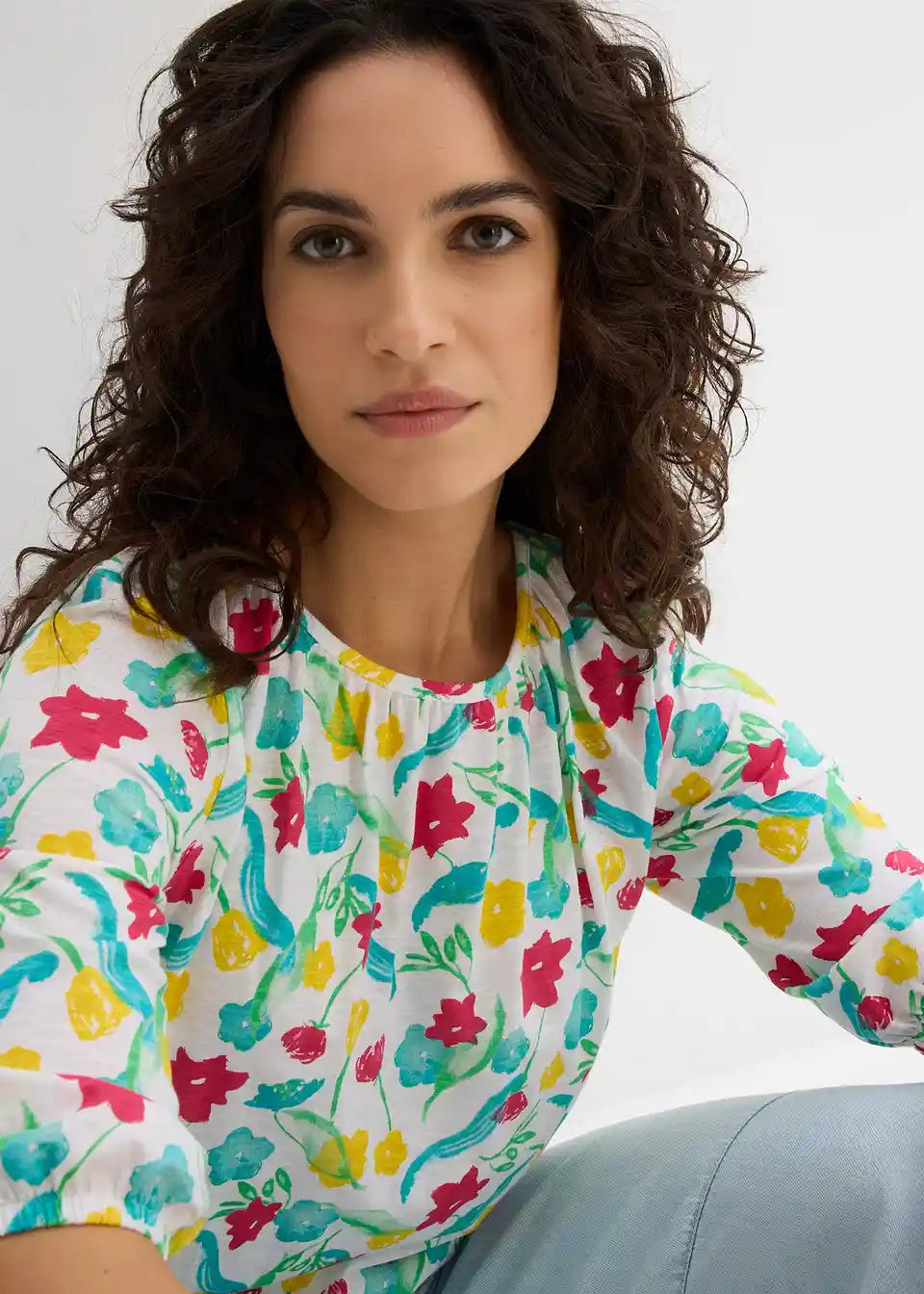 T-Shirt iz čistega bombaža. Z elastičnimi robovi rokavov in cvetličnim potiskom.