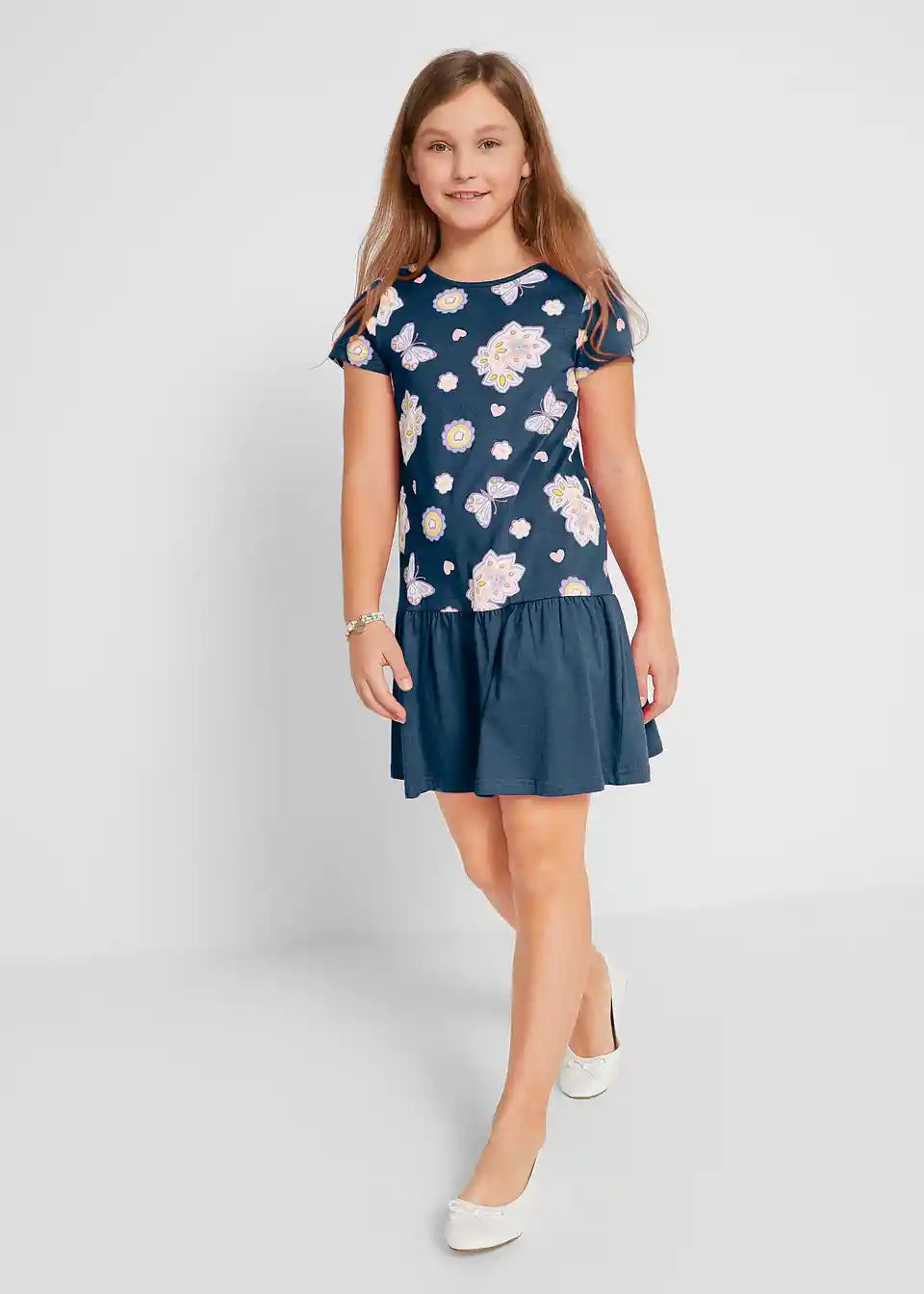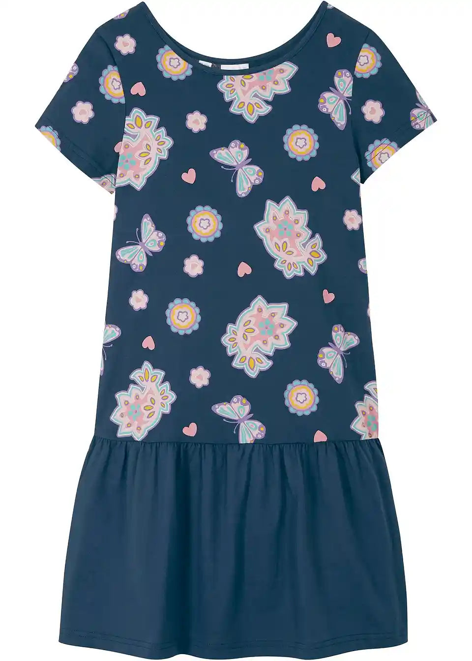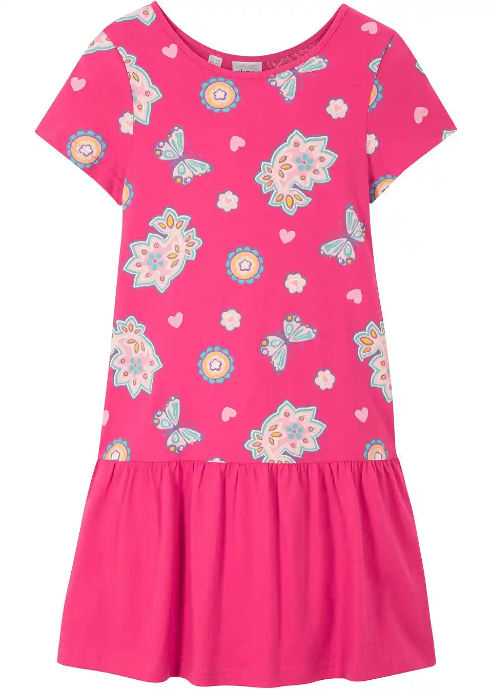Ta čudovita obleka s kratkimi rokavi navduši predvsem s svojim cvetličnim potiskom in barvno kontrastnim krilnim delom. Mehka ekološka bombažna tkanina zagotavlja prijetno udobje pri nošenju.