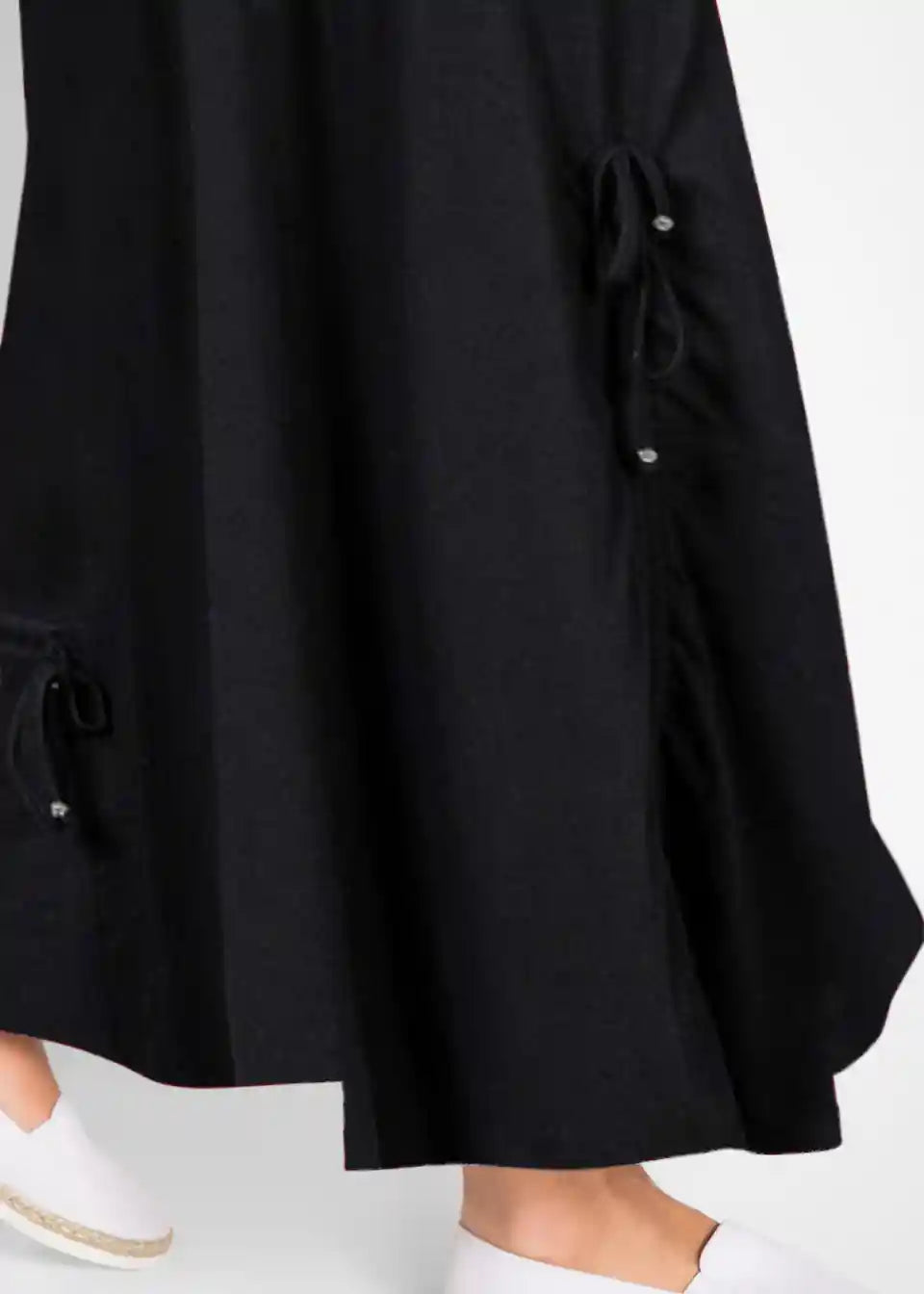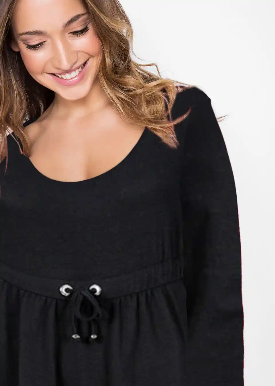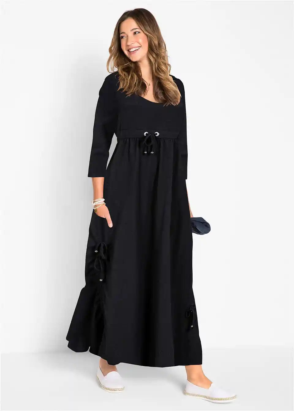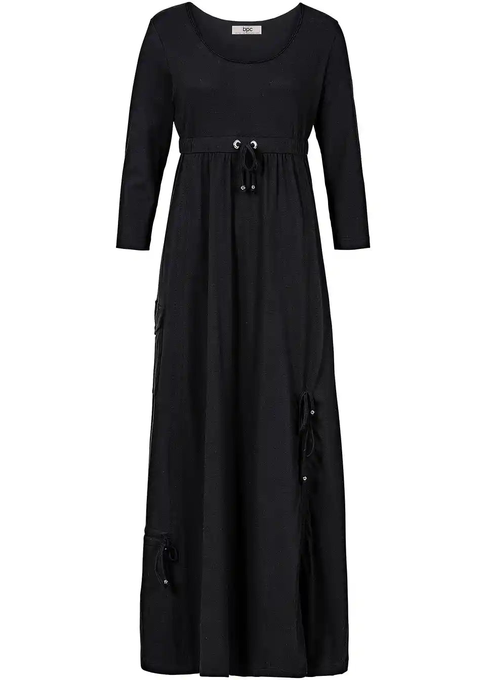 Ta modna maksi shirt-obleka s 3/4 rokavi stavi na prav poseben učinek. Tunelski vrvici z vezalkami uravnavata širino pasu ali stransko višino roba. Model iz kolekcije bpc tako dobi poseben preobrat. Privlačen dizajn omogoča različne kombinacije. Naj gre za balerinke, ogrlico iz steklenih perlic in slamnik ali tekstilne čevlje z vezalkami in jeans jakno: Shirt-obleka s 3/4 rokavi je atraktiven poudarek.