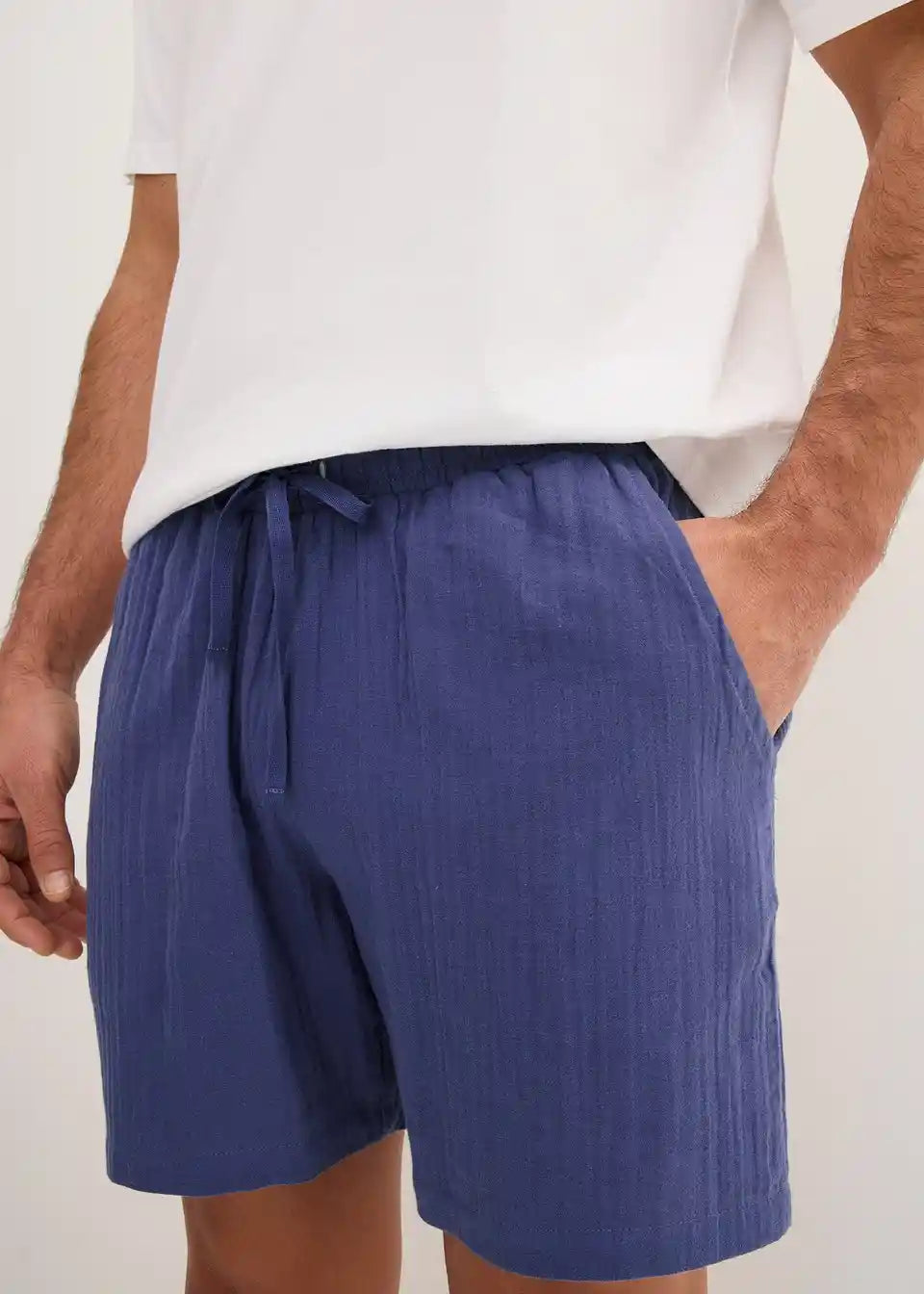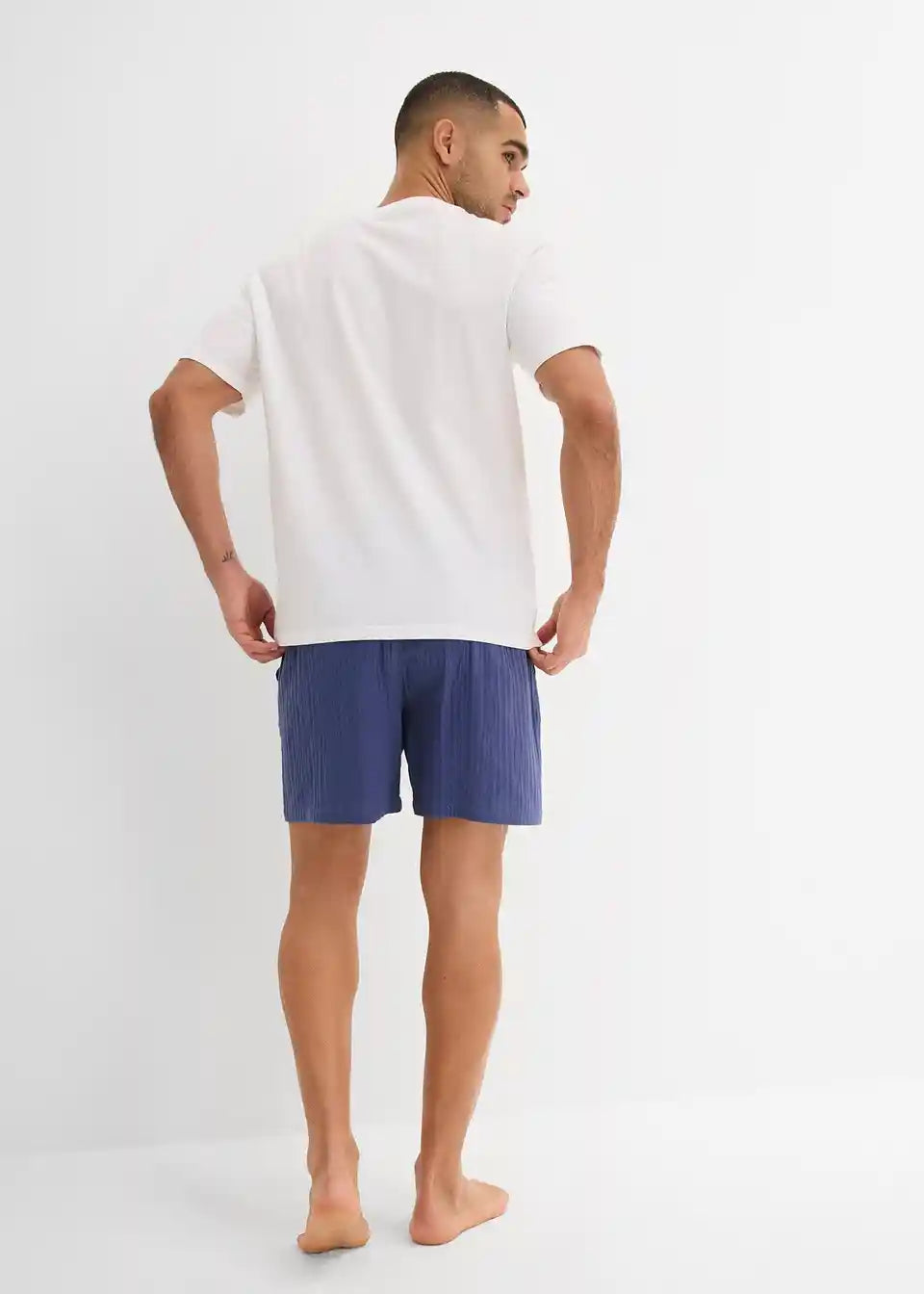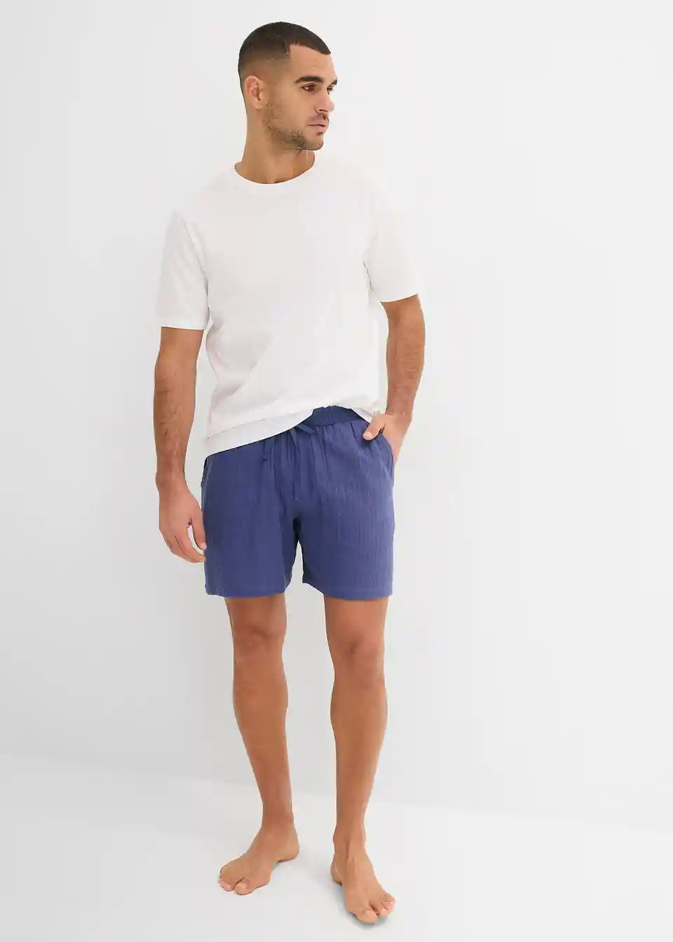Udoben moški Shorty. Sestavljen iz klasične bombažne majice in udobnih kratkih hlač iz muslina.