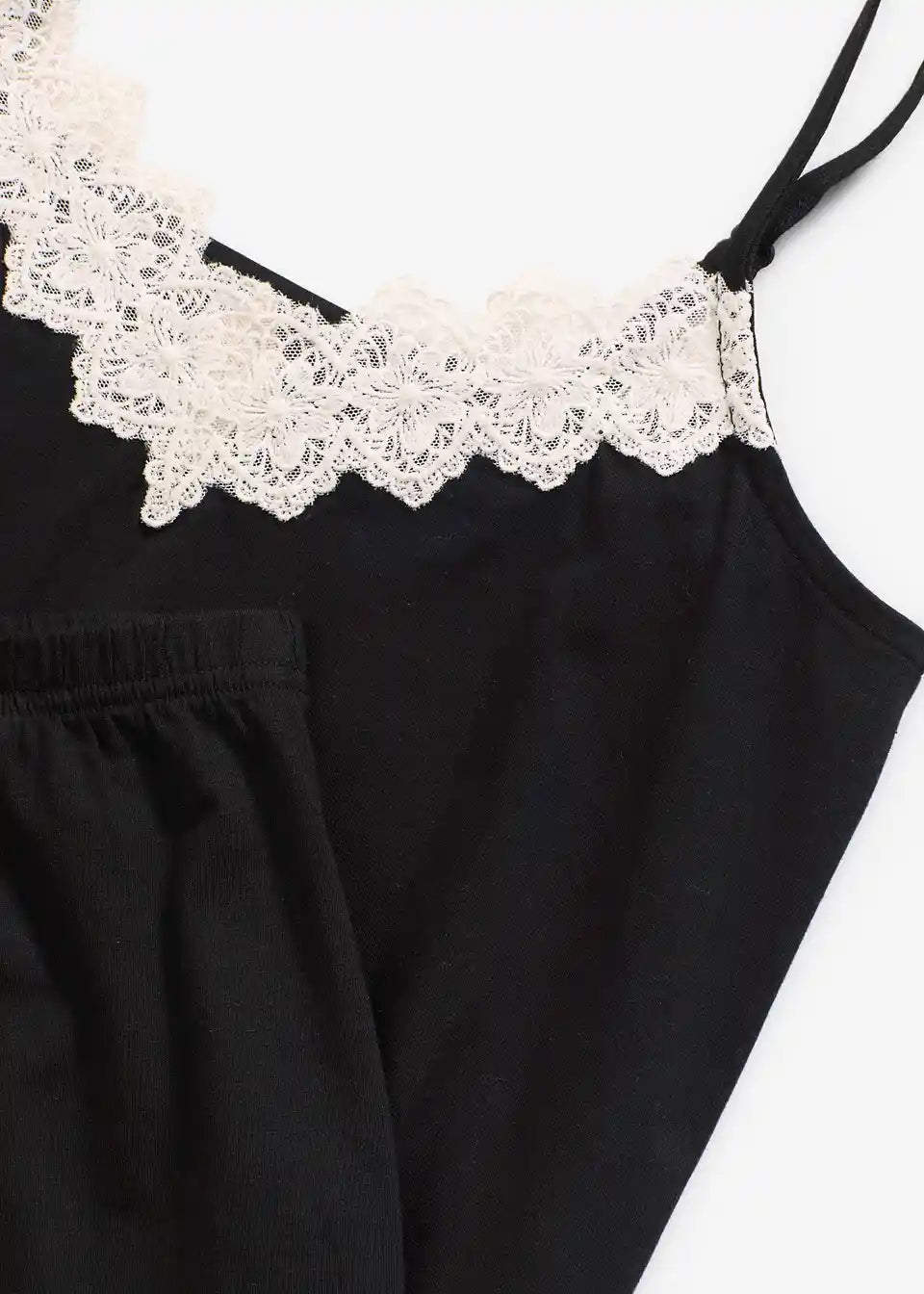 Ženski kratki komplet s prilagodljivimi špageti naramnicami in globokim V-izrezom z izjemno lepo čipko