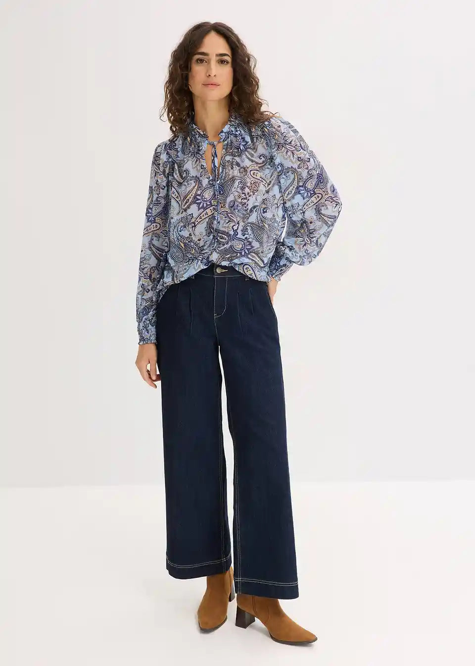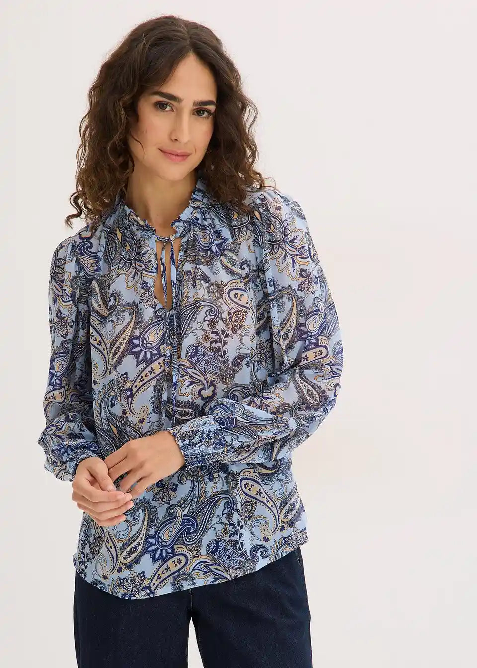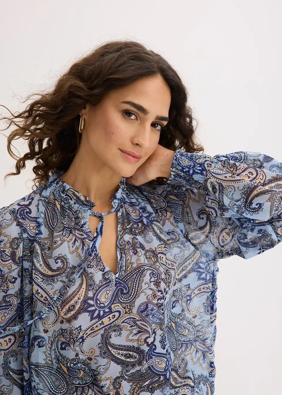 Modno potiskana bluza iz šifona z gostim naborkom na robu rokavov in detajlom vozla spredaj na izrezu.