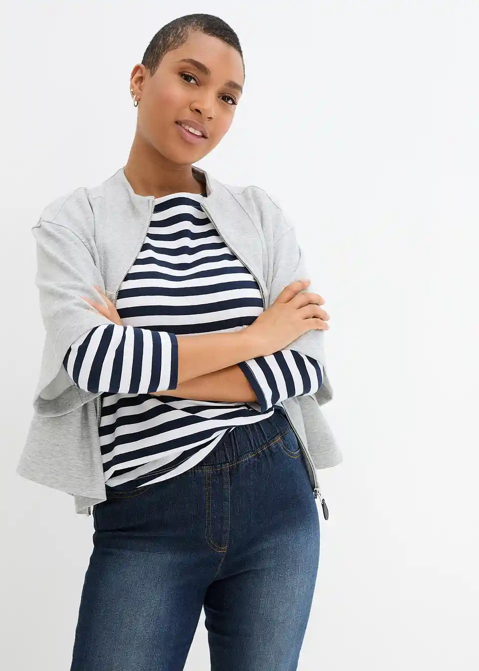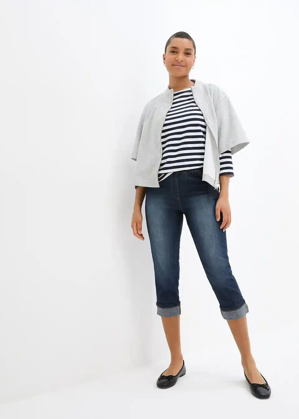 3/4-jeggings znamke bpc dopolnjujejo sproščen videz s potiskano majico in supergami. Na robu spodaj so hlače ohlapno zavihane, kar daje športni pridih, ki ga dopolnjujeta dva našita žepa na zadnji strani. Udobje pri nošenju je odlično. Elastični pas zagotavlja optimalno prileganje.