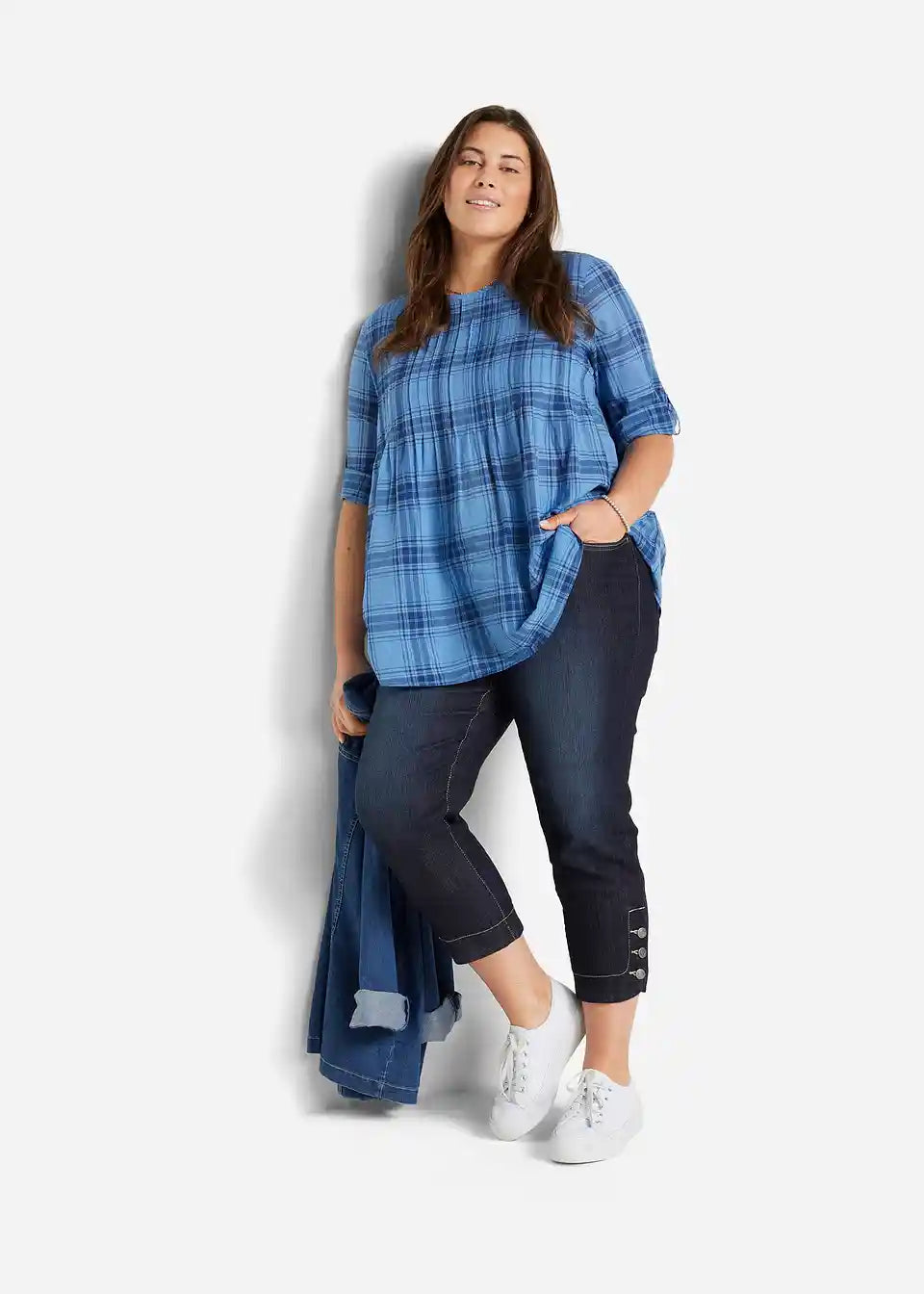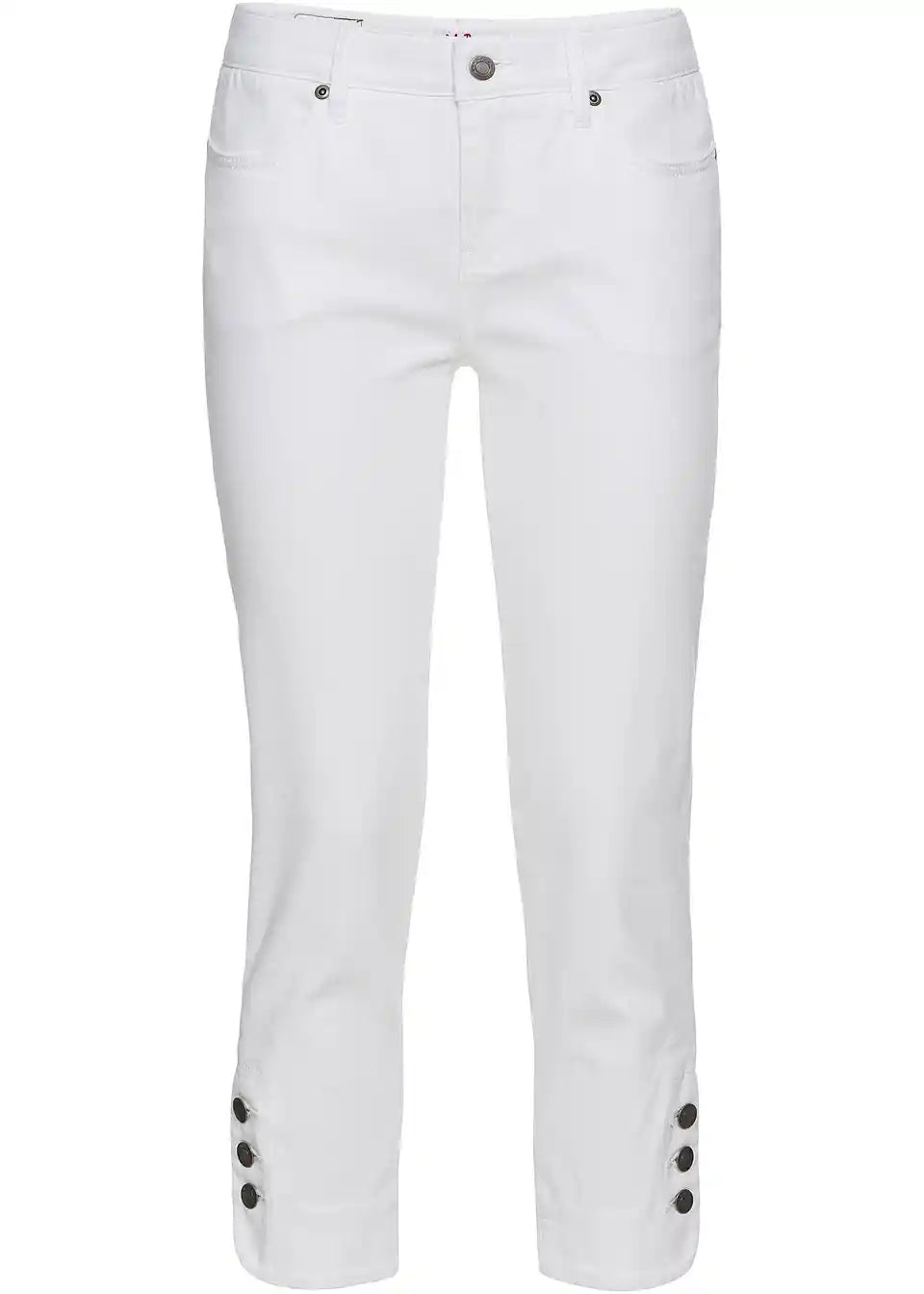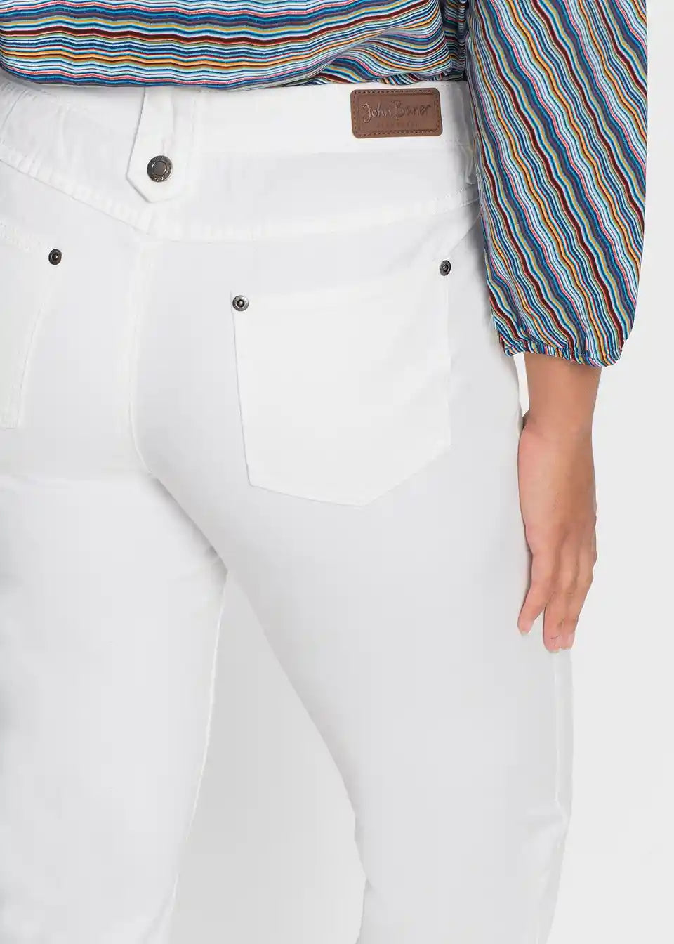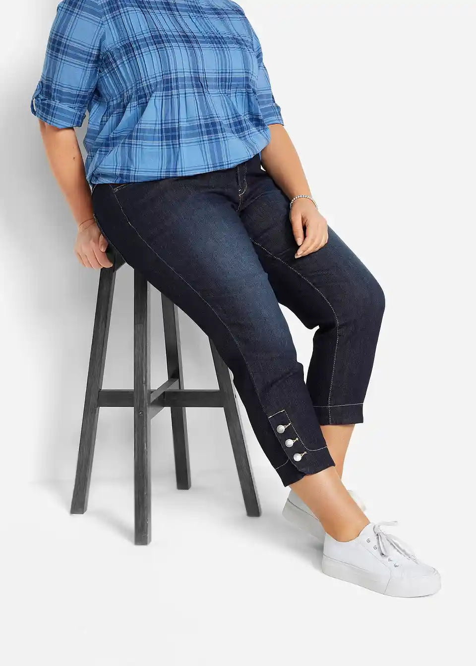 V teh udobnih raztegljivih kavbojkah dolžine 3/4 bodo trendovske dame videti odlično. Slim Fit kavbojke iz aktualne kolekcije John Baner so krojene v 4-žepnem videzu in se zapenjajo z gumbom in zadrgo. Prefinjeni z gumbi okrašeni stranski razporki in zelo oprijet kroj poudarjajo modni slog raztegljivih kavbojk SLIM z gumbi.