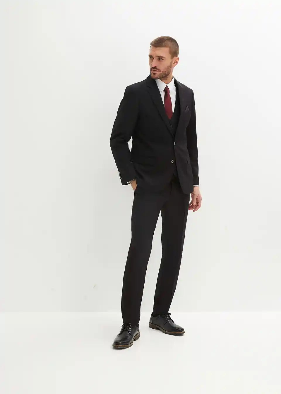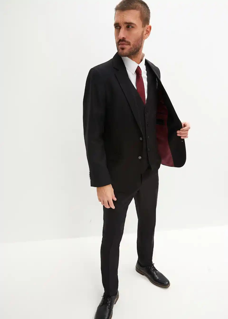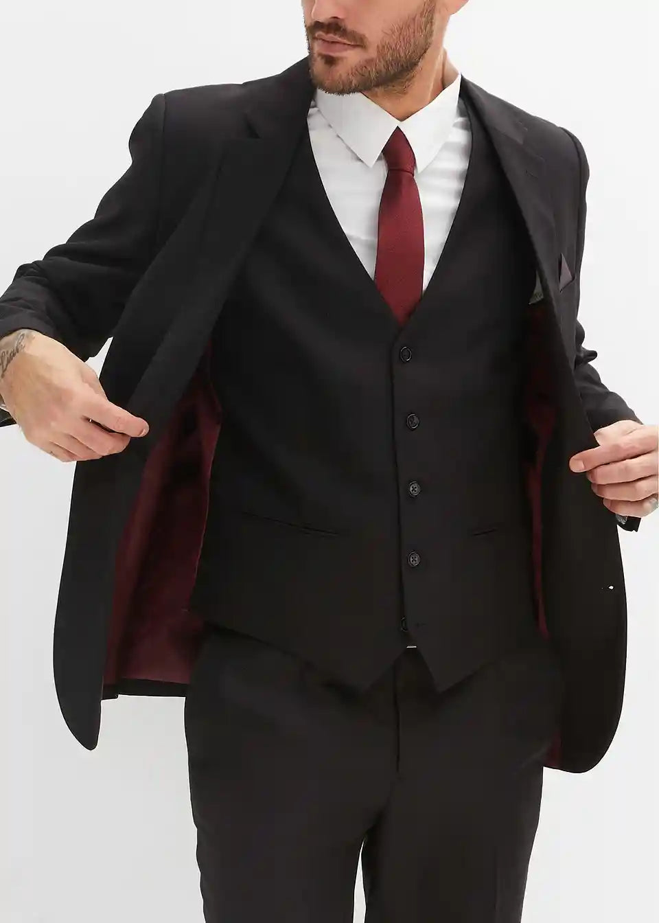 Moška obleka v ozkem kroju: suknjič, hlače, telovnik, kravata in vtični robček