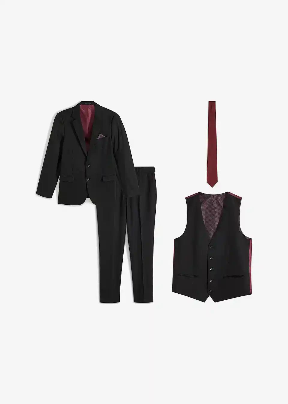 Modna 4-delna obleka, ki vključuje suknjič, hlače, telovnik, kravato in žepni robček