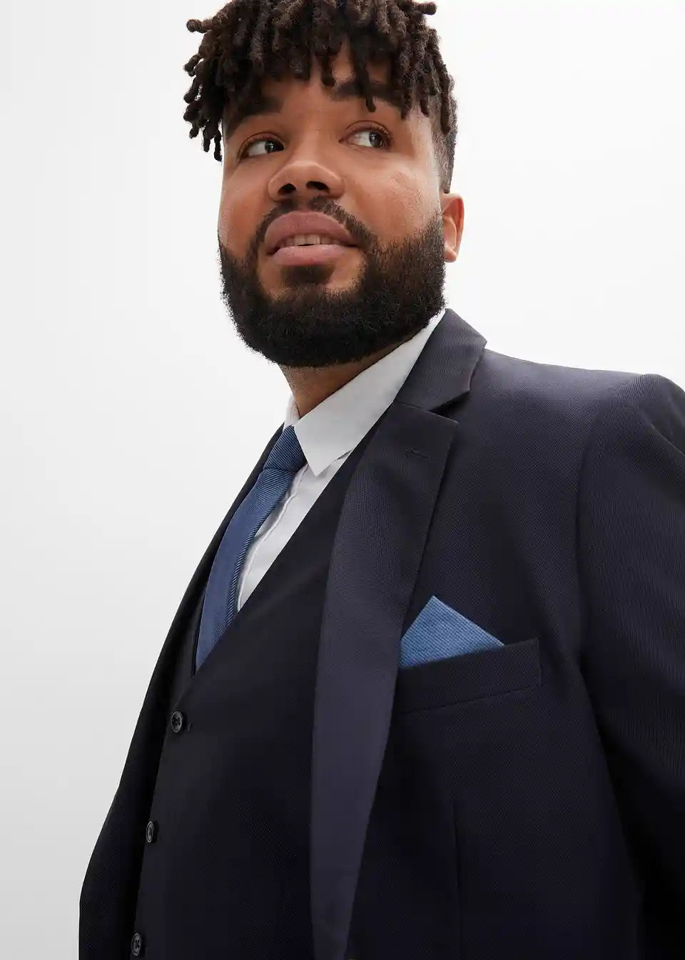 Moška obleka v ozkem kroju: suknjič, hlače, telovnik, kravata in vtični robček