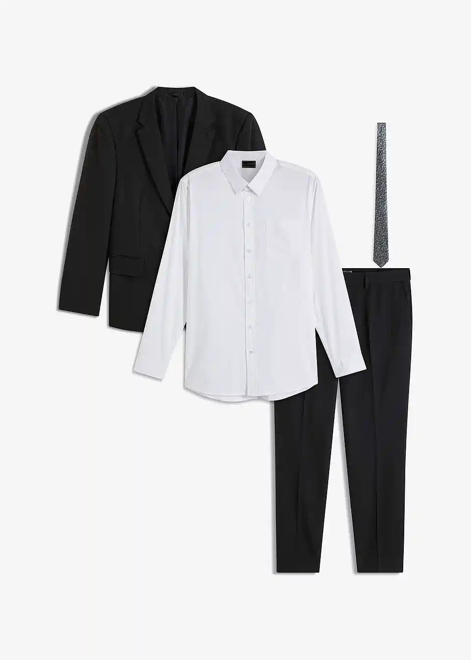 Moderna štiridelna obleka, sestavljena iz suknjiča, hlač, srajce in kravate