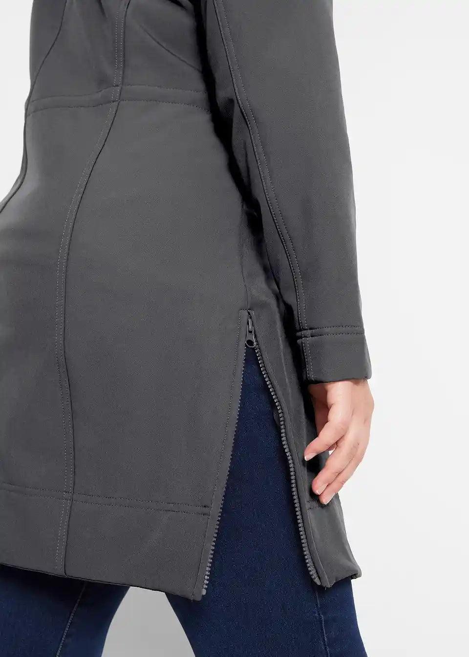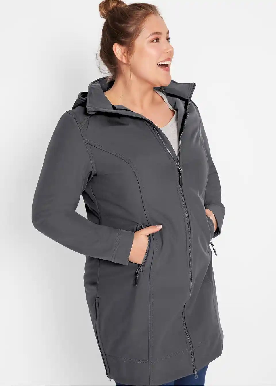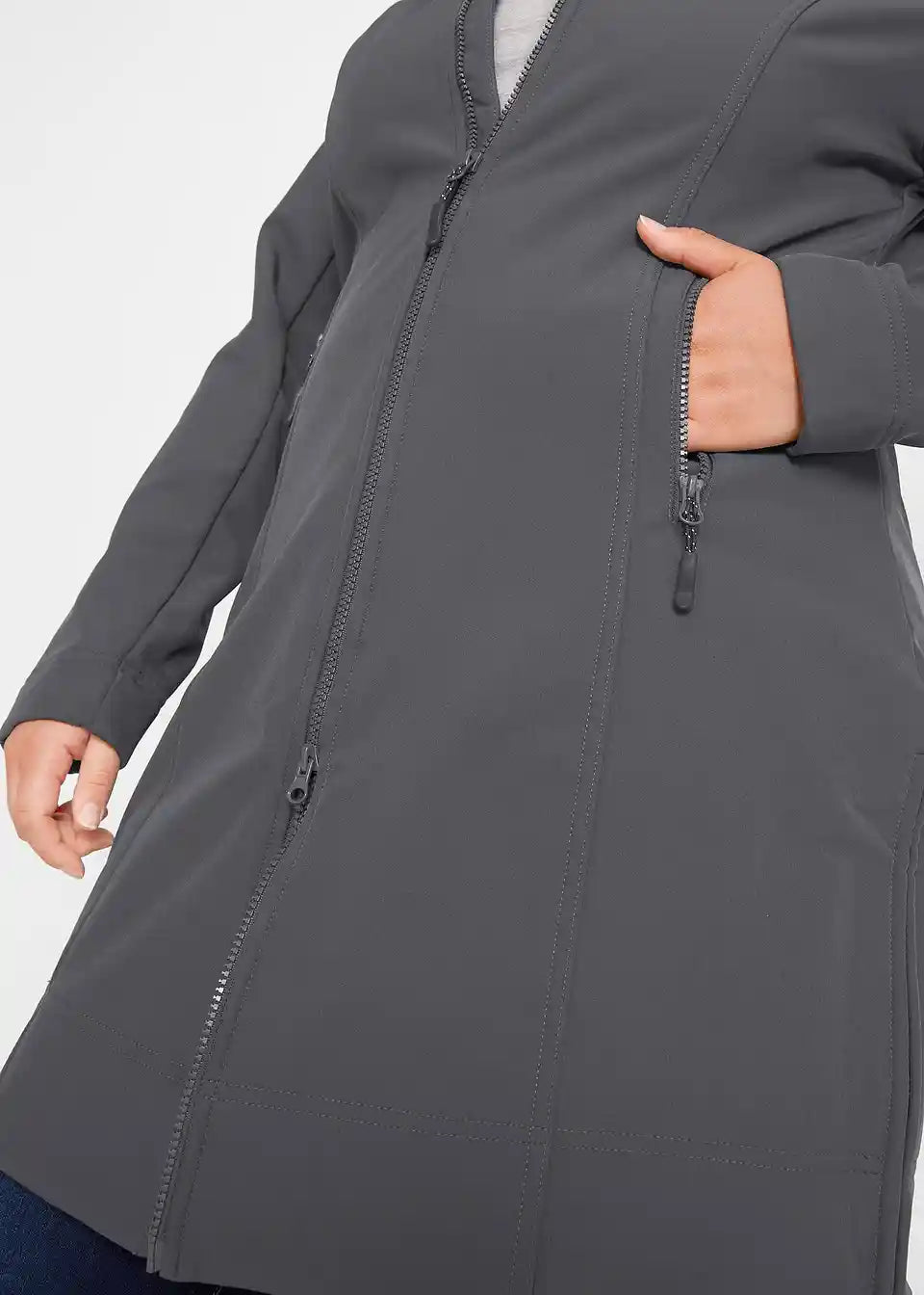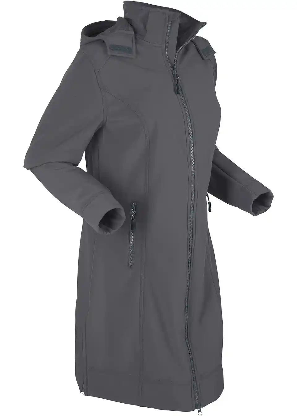 Vodoodbojen prehodni plašč iz softshell-a z odstranljivo kapuco in elastičnim pasom na hrbtu, z žepi z zadrgo, oprijet kroj