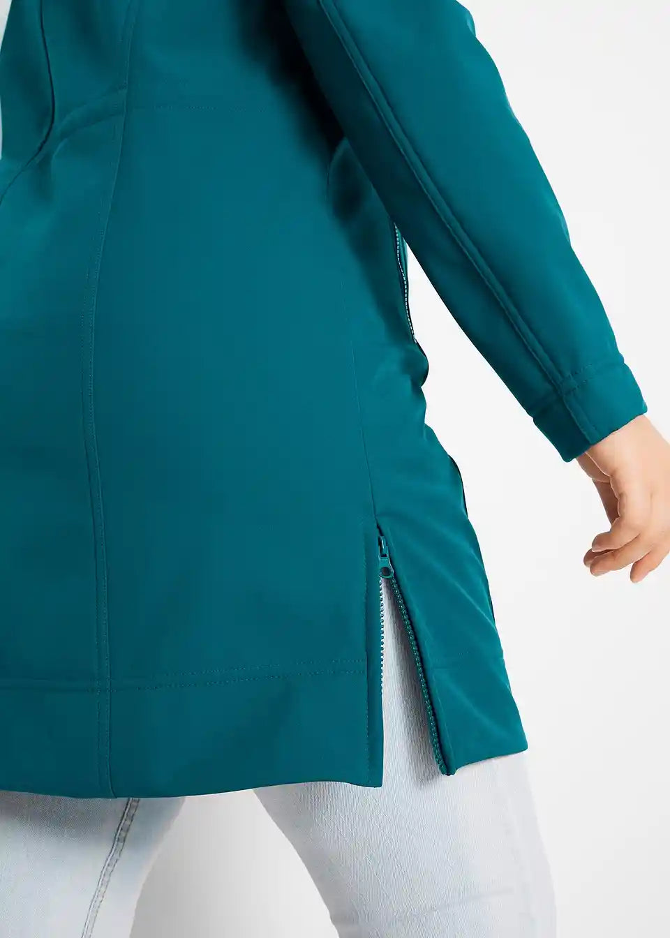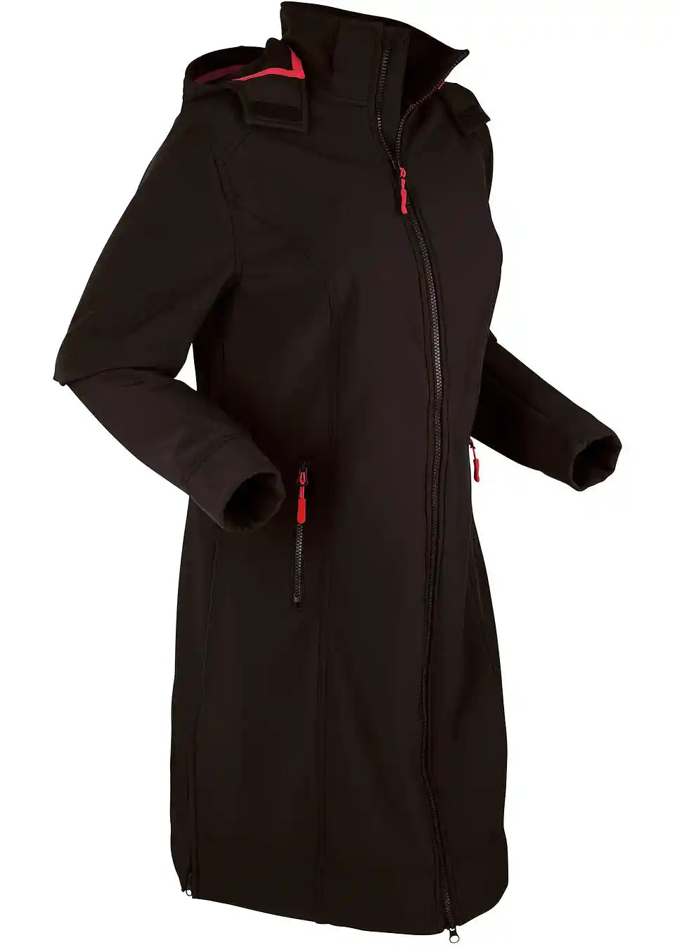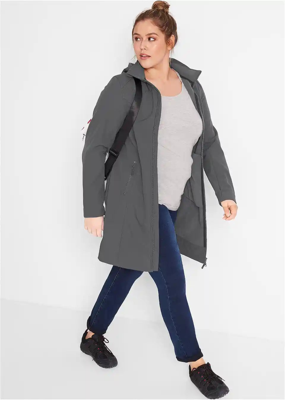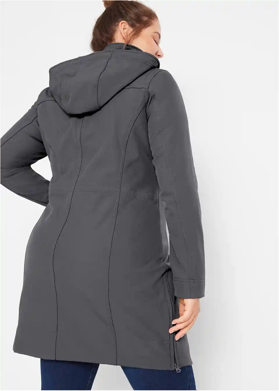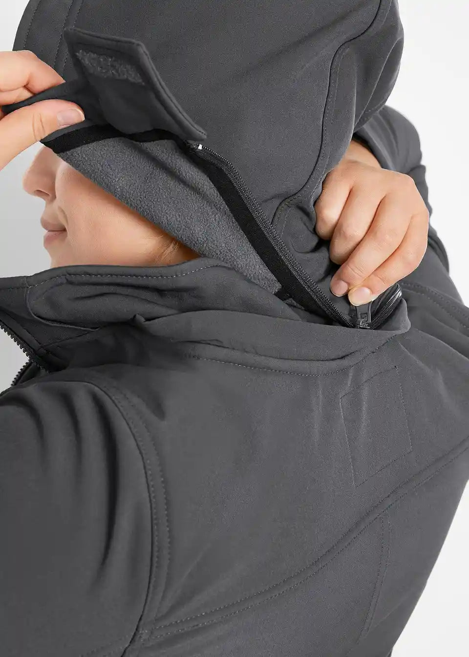 Vodoodbojen prehodni plašč iz softshell-a z odstranljivo kapuco in elastičnim pasom na hrbtu, z žepi z zadrgo, oprijet kroj