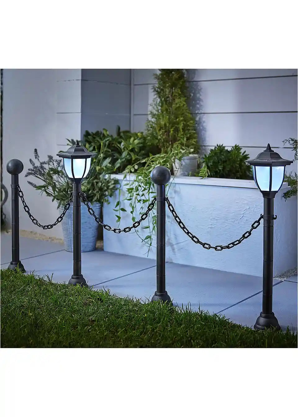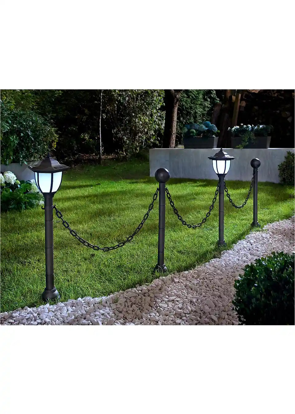 Ta solarna ograja s verigo bo zagotovo vzbudila zavist vaših sosedov. Z atraktivno ograjno verigo boste svoj vrt, teraso ali vhodni prostor postavili v središče pozornosti na eleganten način. Set vključuje 2 stebra s kroglo (višina: 58,5 cm) in 2 stebra z LED solarnimi svetilkami (višina: 71,9 cm). Vsi 4 stebri (vključno z zemeljskimi konicami) so povezani s 3 verigami (vsaka dolga približno 100 cm). LED solarne svetilke se podnevi polnijo s sončno energijo in se ob mraku samodejno vklopijo. Vključno z 2x Mignon (NI-MH) polnilnima baterijama. 2x izjemno svetli beli LED.