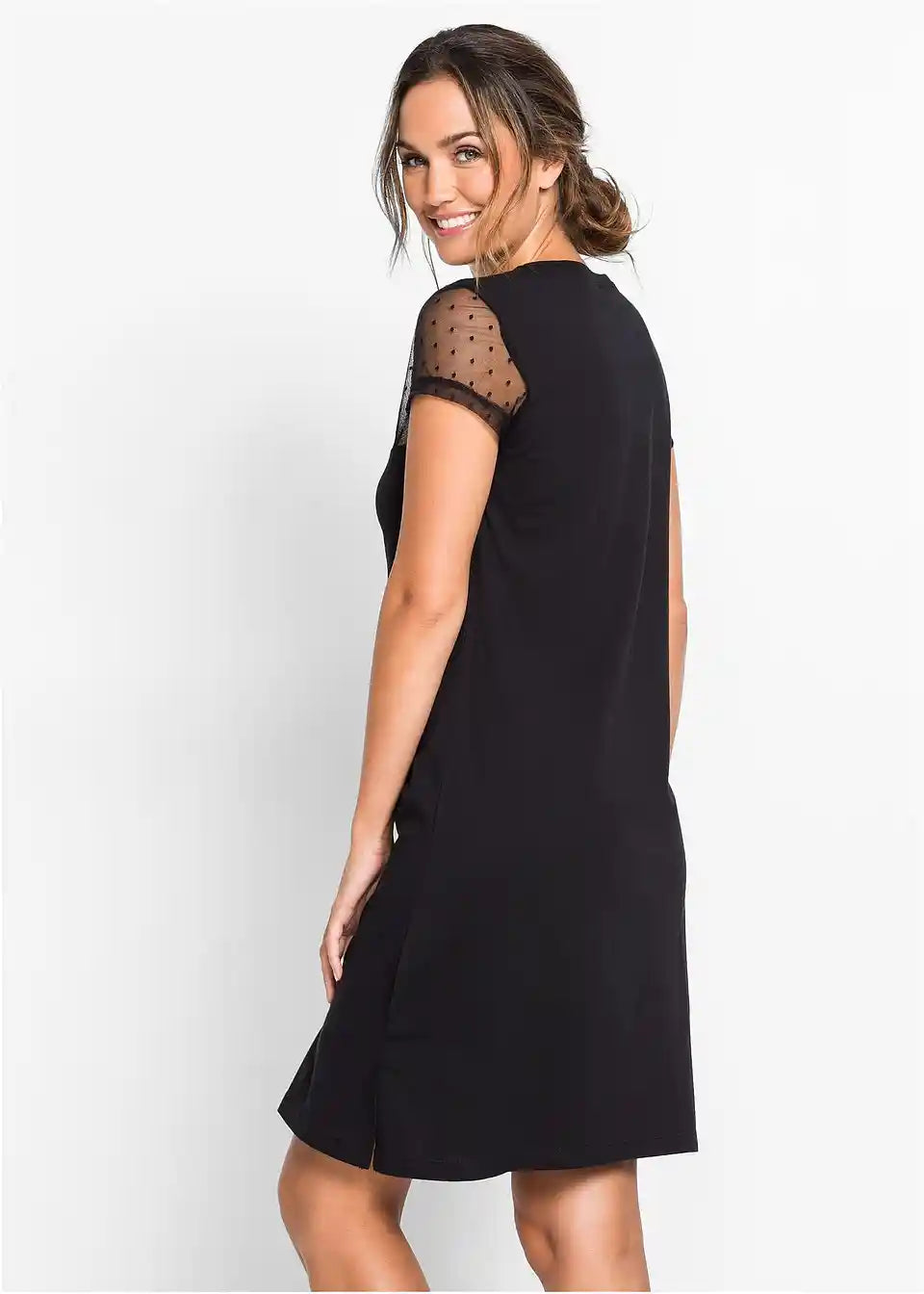 Ta modna domača obleka iz trenutne kolekcije bpc je najljubši kos za noč. Kratka dolga majica prepriča predvsem s prosojnimi vstavki na sprednji strani in rokavih. Ti vstavki z videzom pikic, majhna satenasta pentlja na izrezu in subtilni stranski razporki dajejo spalni srajci romantičen videz.