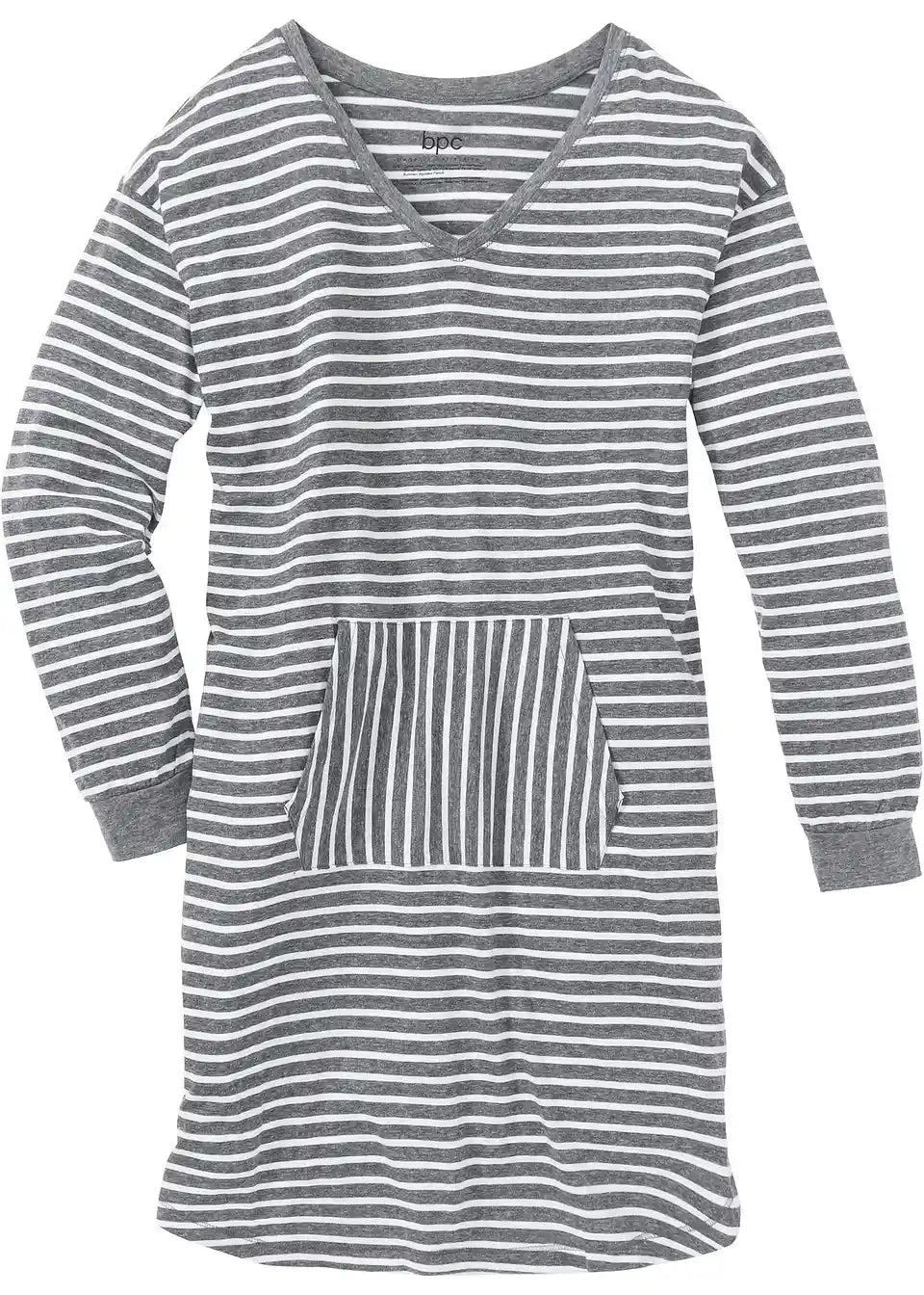 Ta spalna srajca zagotavlja ženskam popolno udobje in lepe sanje. Ohlapen kroj omogoča veliko svobode gibanja, mehki material pa je izjemno prijazen do kože. Optično navdušuje hišna obleka z modernim črtastim dizajnom ter praktičnim kenguru žepom na sprednji strani.