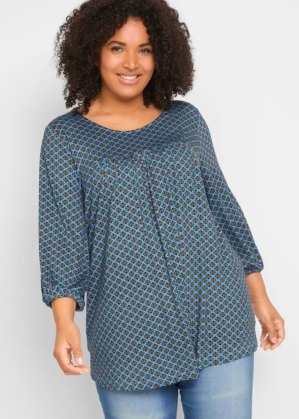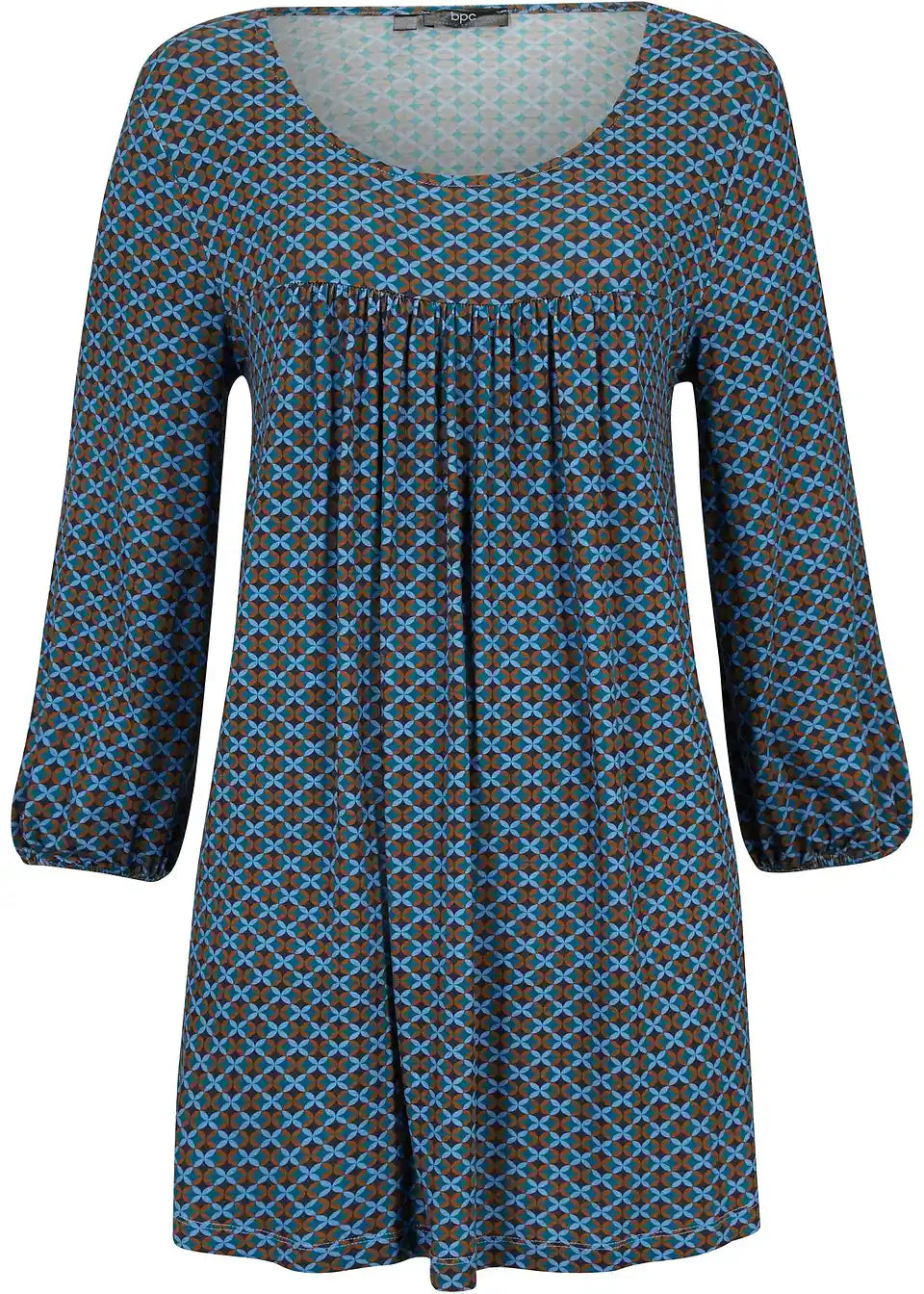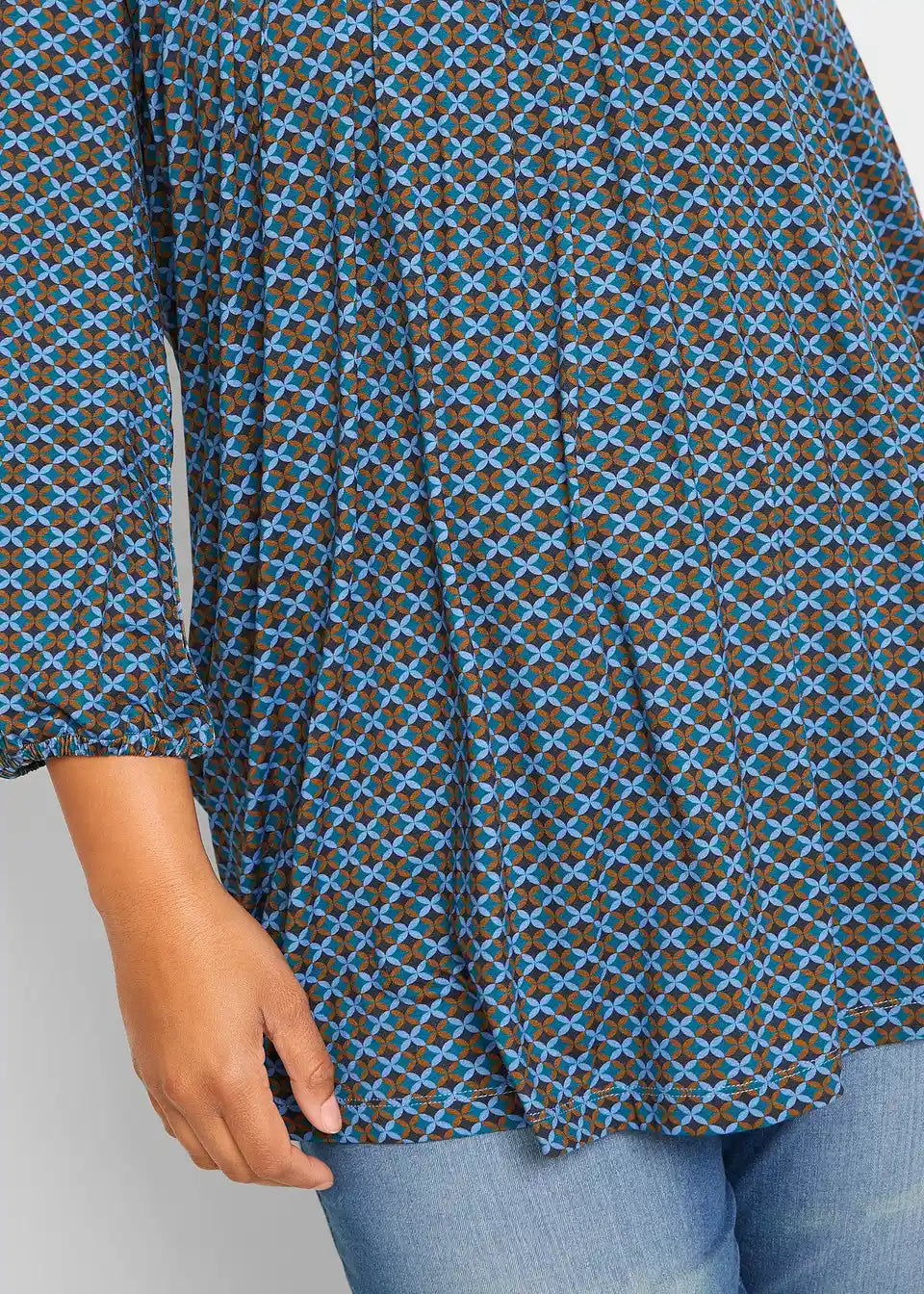 Natisnjena srajca z okroglim izrezom, z elastiko na zaključku rokavov in stranskimi razporki za večjo svobodo gibanja, izdelana iz trajnostne viskoze v A-liniji