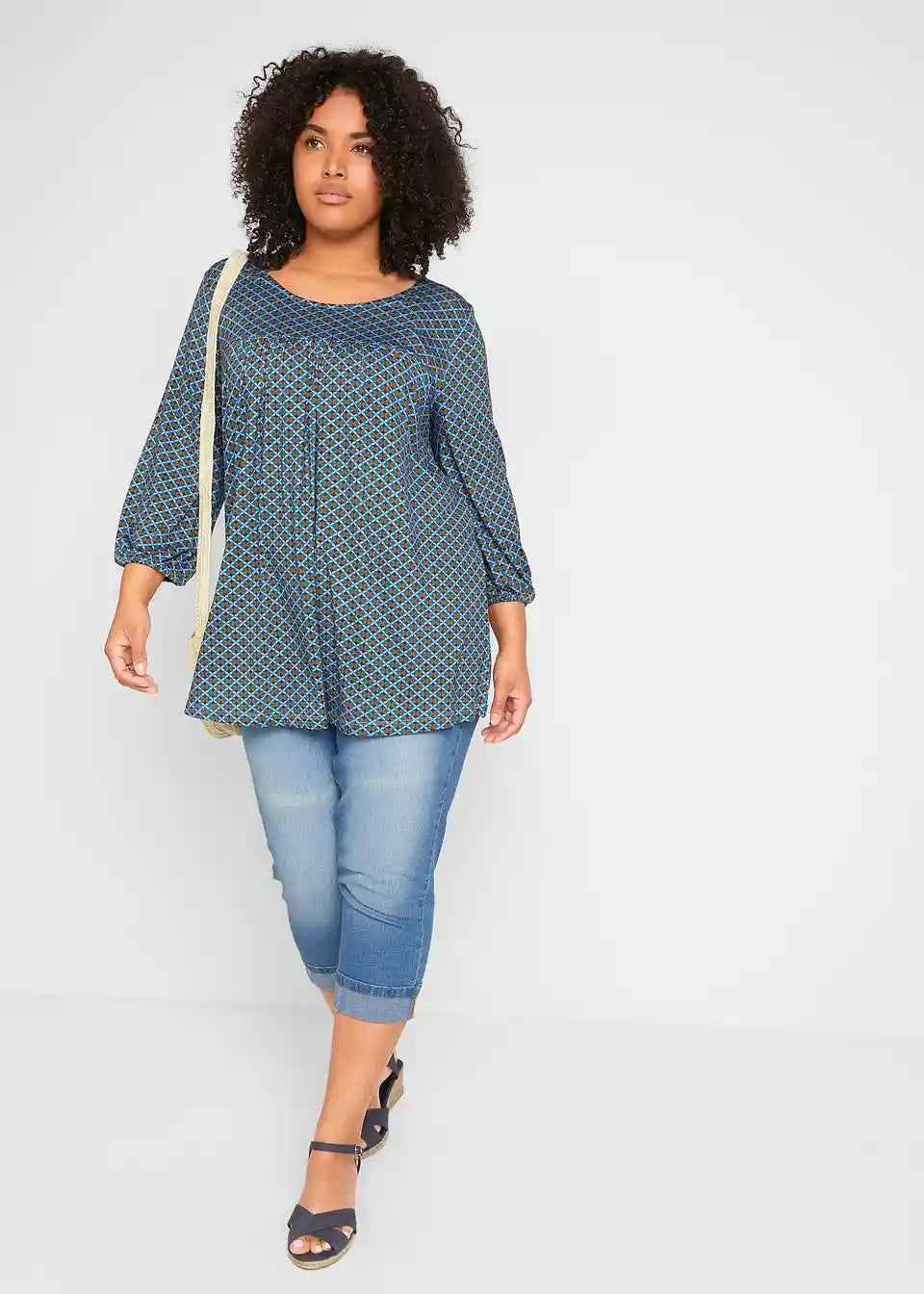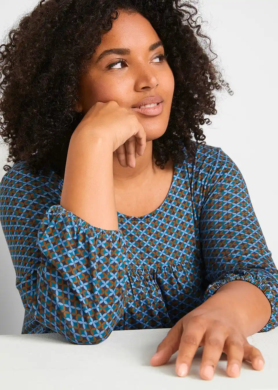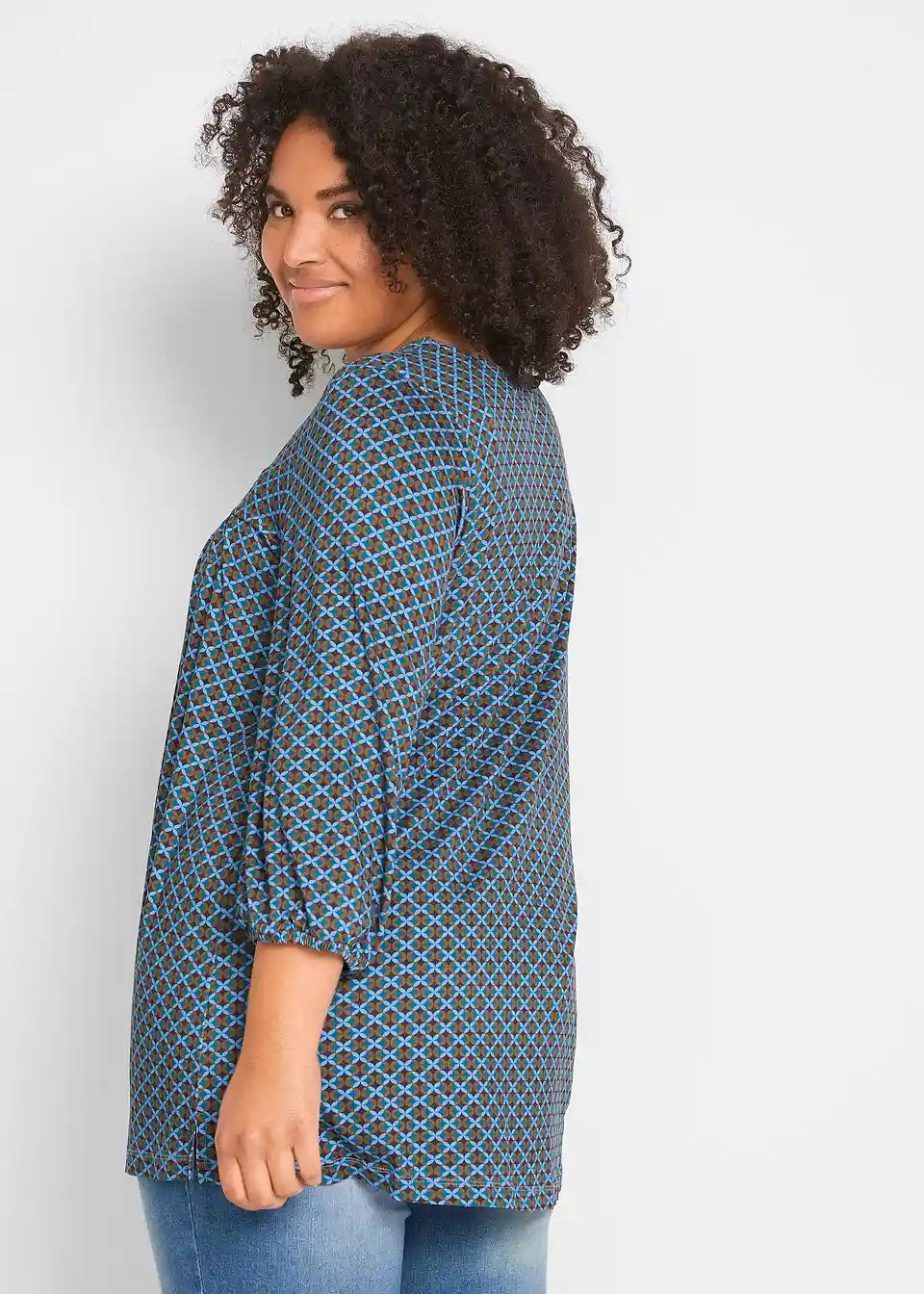 Natisnjena srajca z okroglim izrezom, z elastiko na zaključku rokavov in stranskimi razporki za večjo svobodo gibanja, izdelana iz trajnostne viskoze v A-liniji