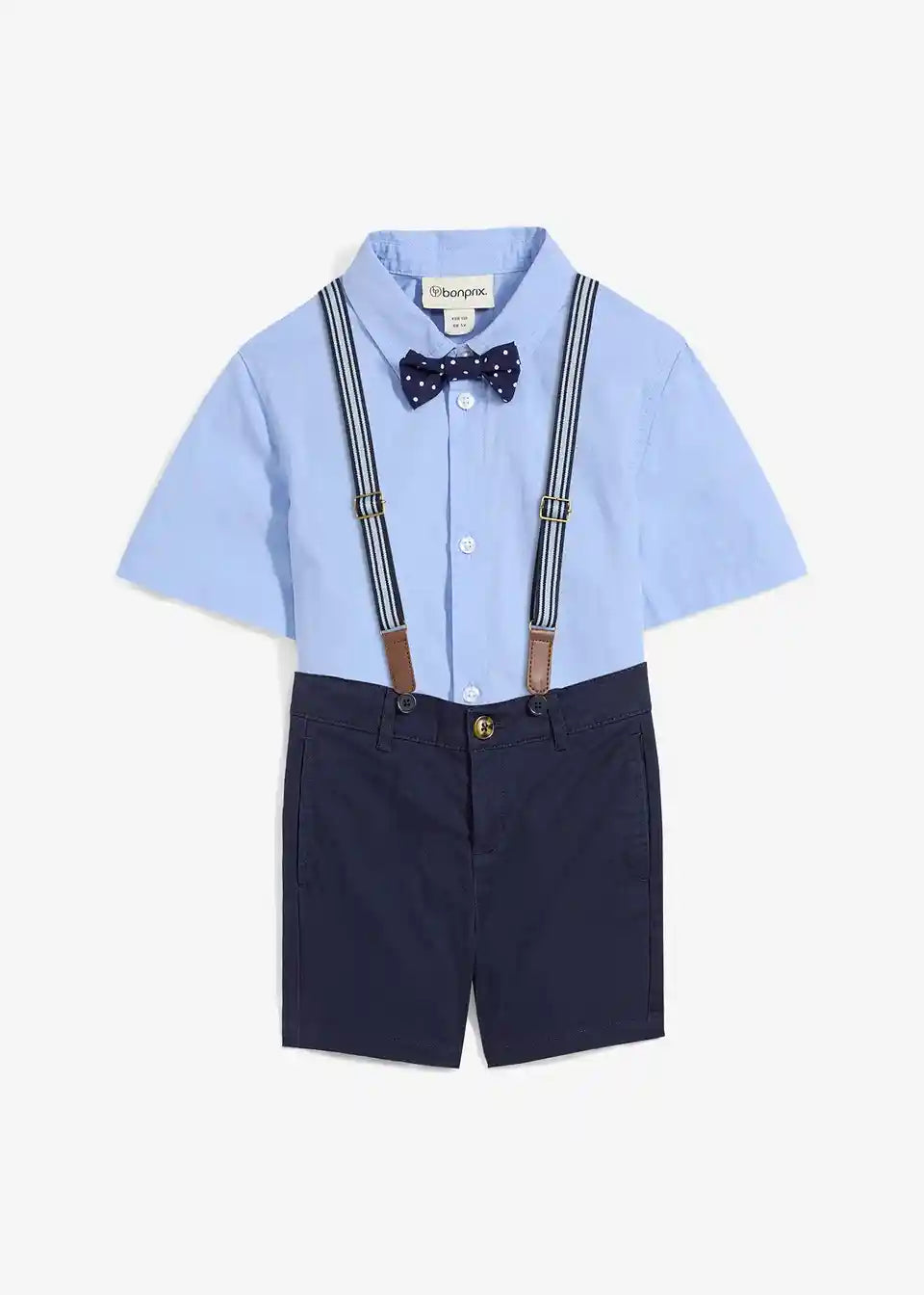 Super komplet za fante, ki vsebuje srajco s kratkimi rokavi, Chino-Bermuda hlače, nastavljive naramnice in pikčast metuljček