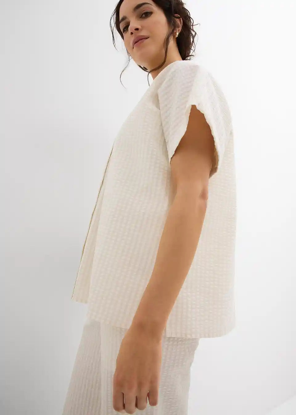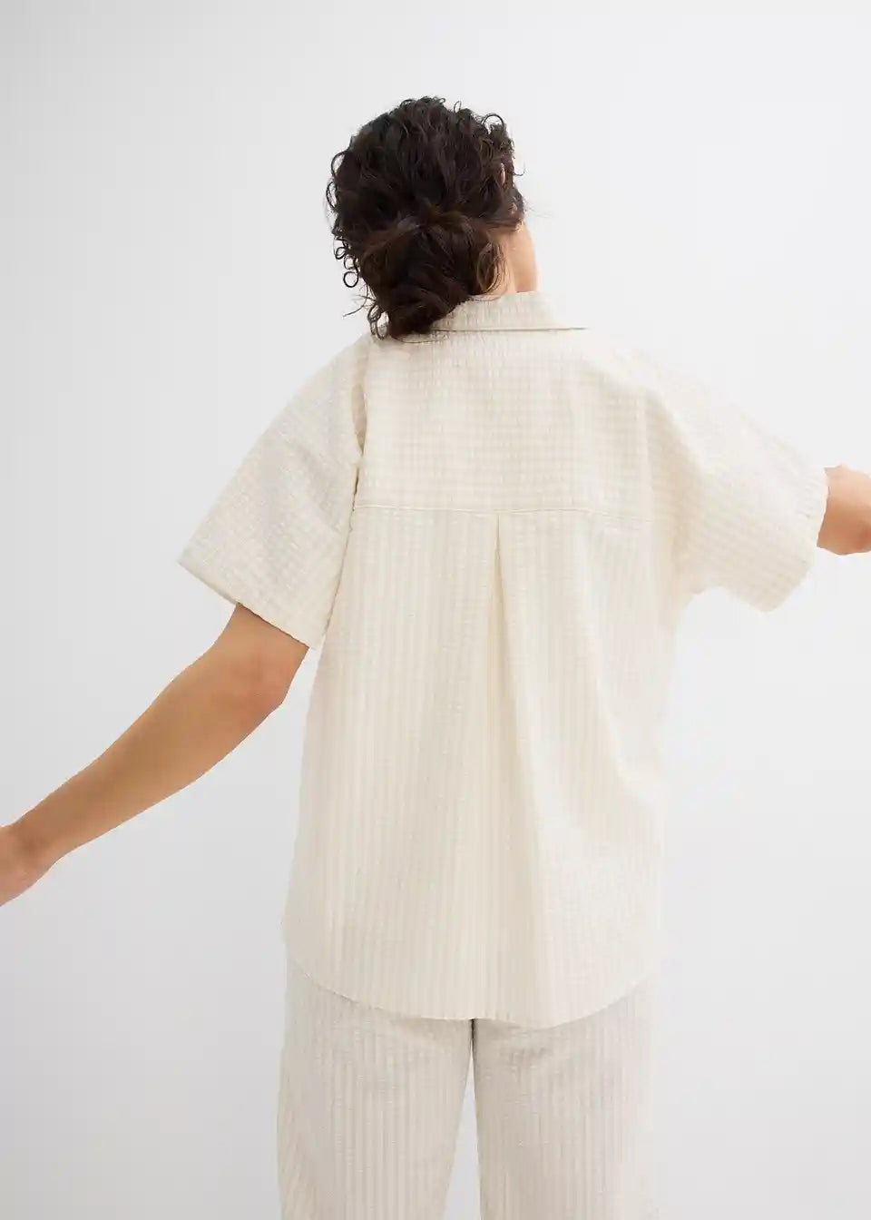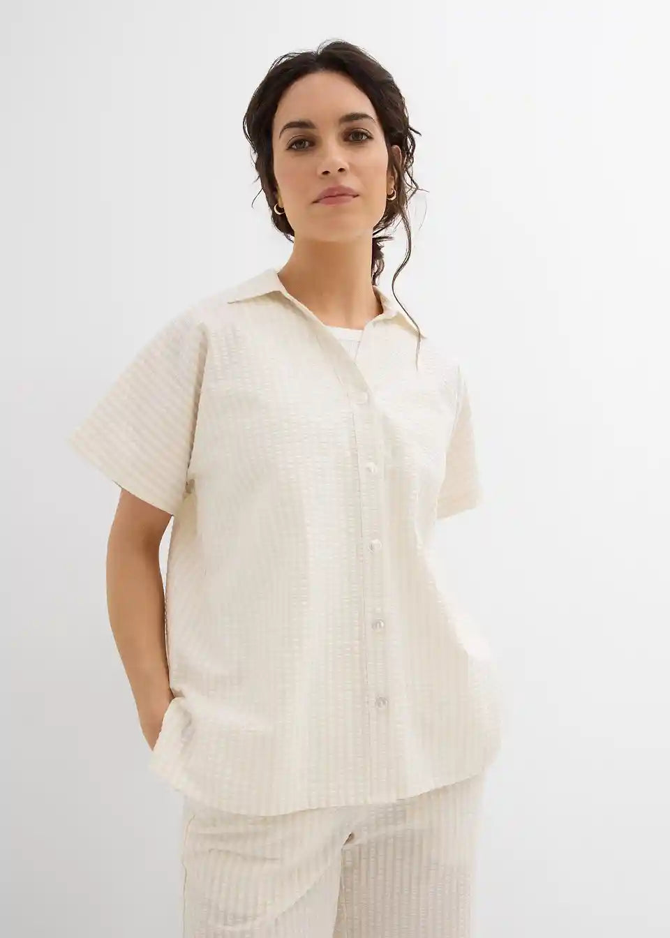 Srajca s kratkimi rokavi iz lahkega strukturiranega materiala z gumbi po sredini. Ohlapen kroj.