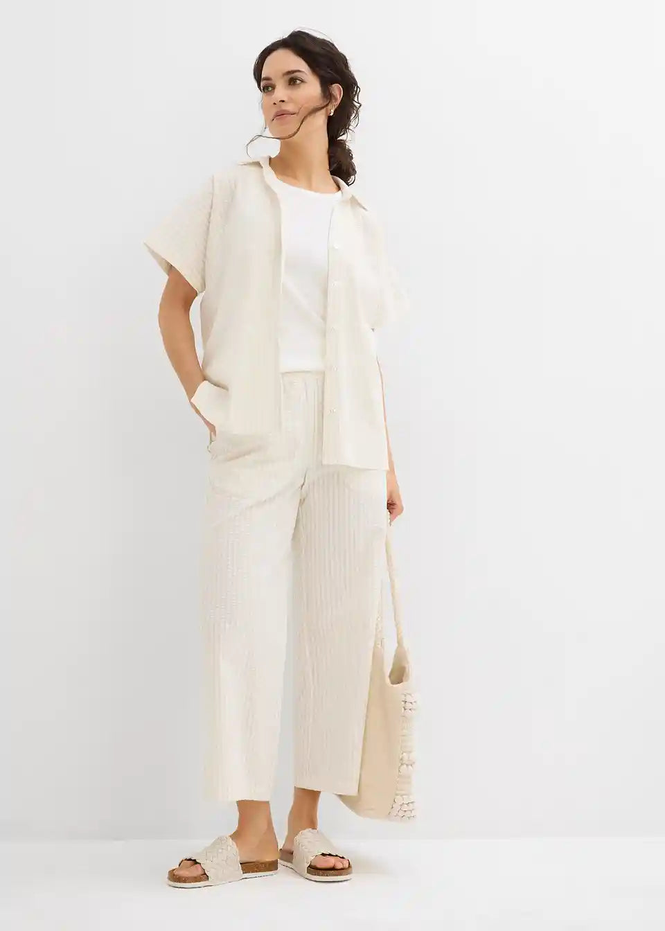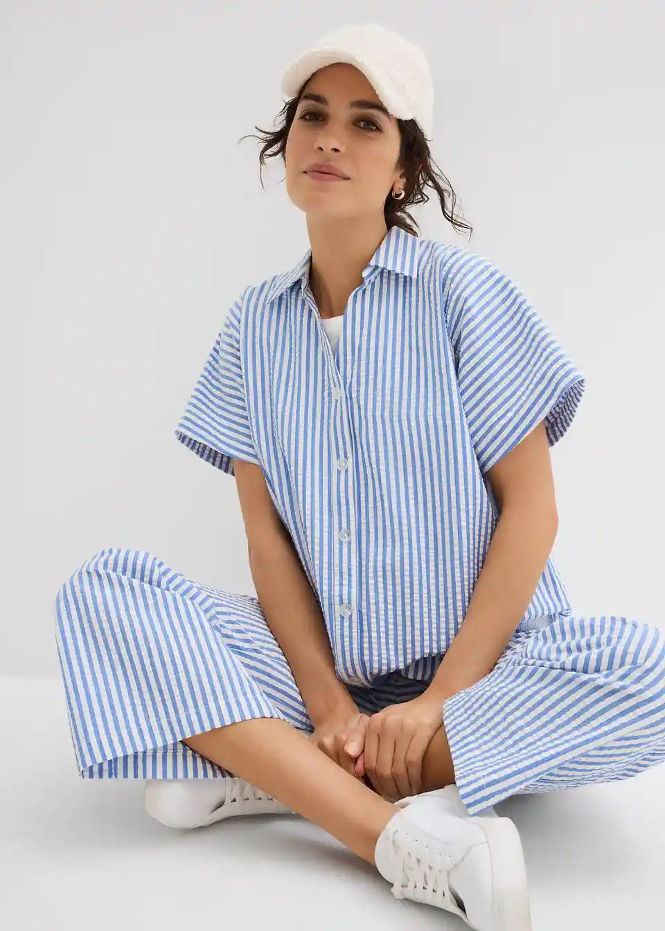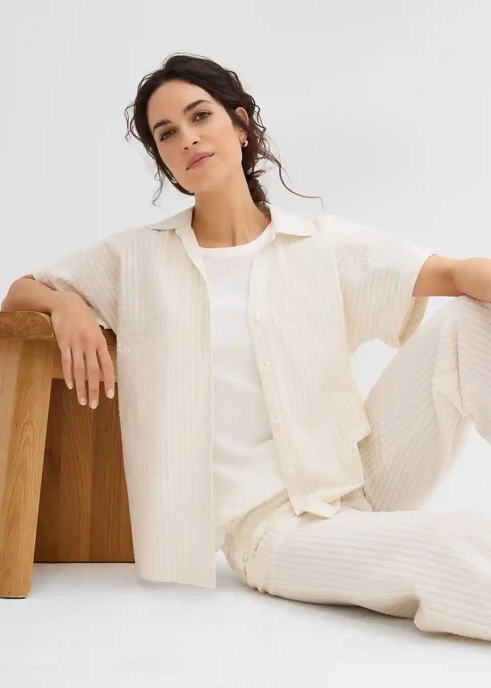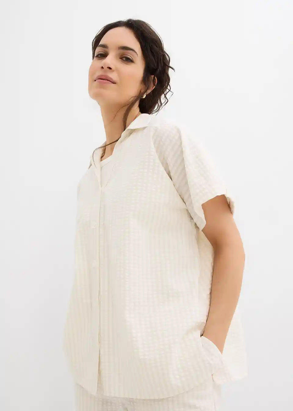 Srajca s kratkimi rokavi iz lahkega strukturiranega materiala z gumbi po sredini. Ohlapen kroj.