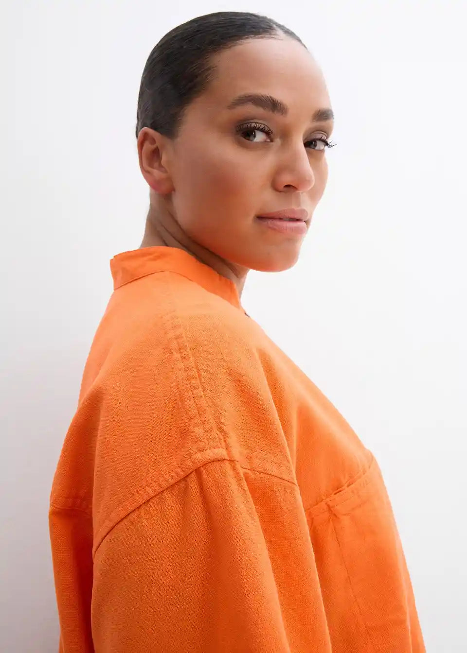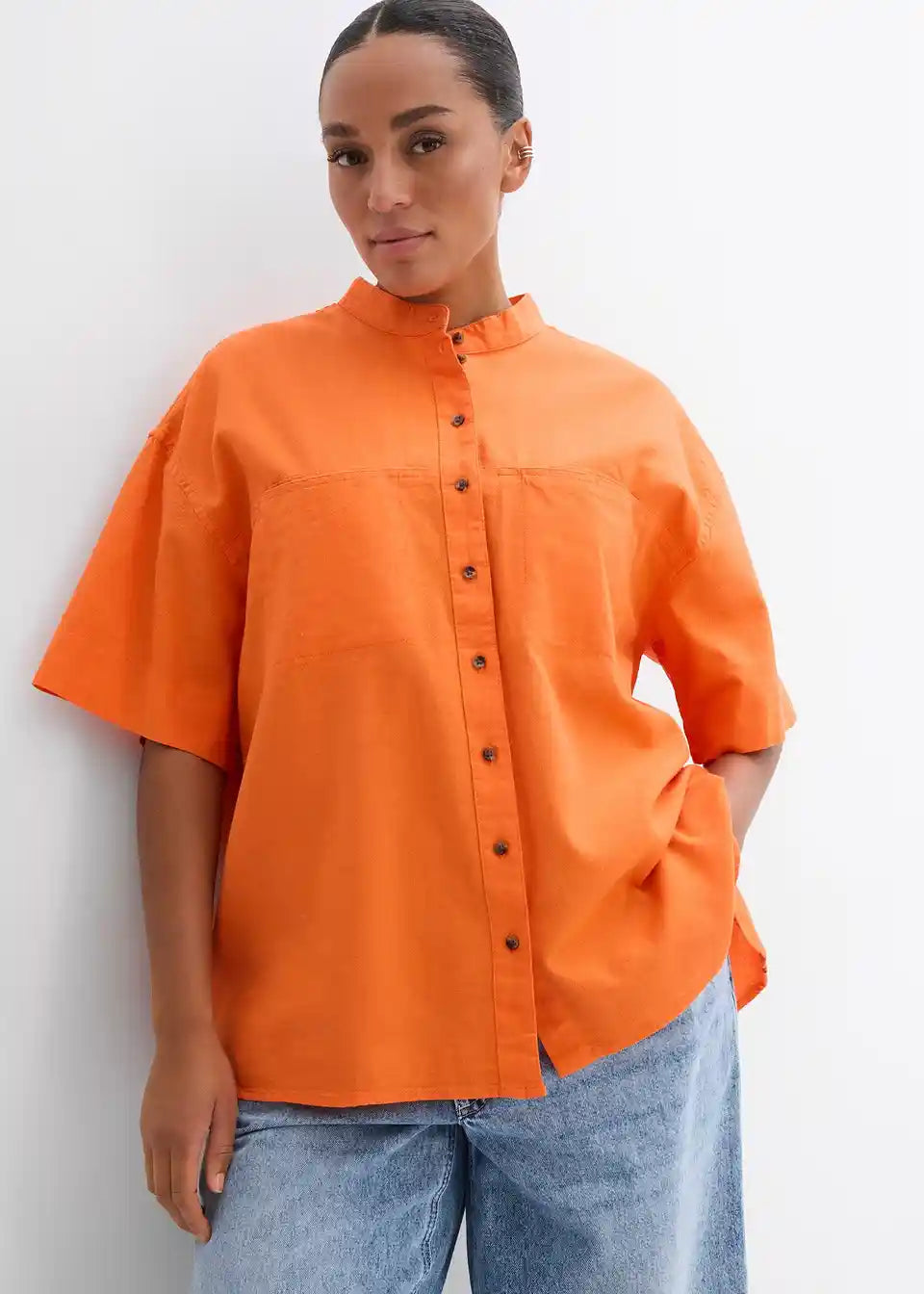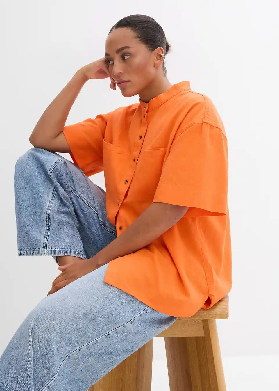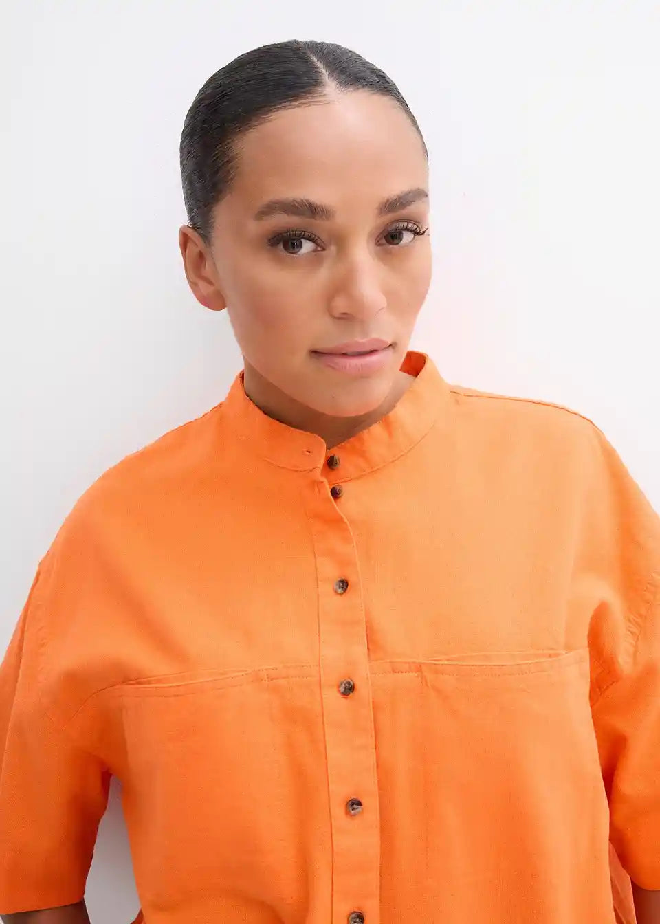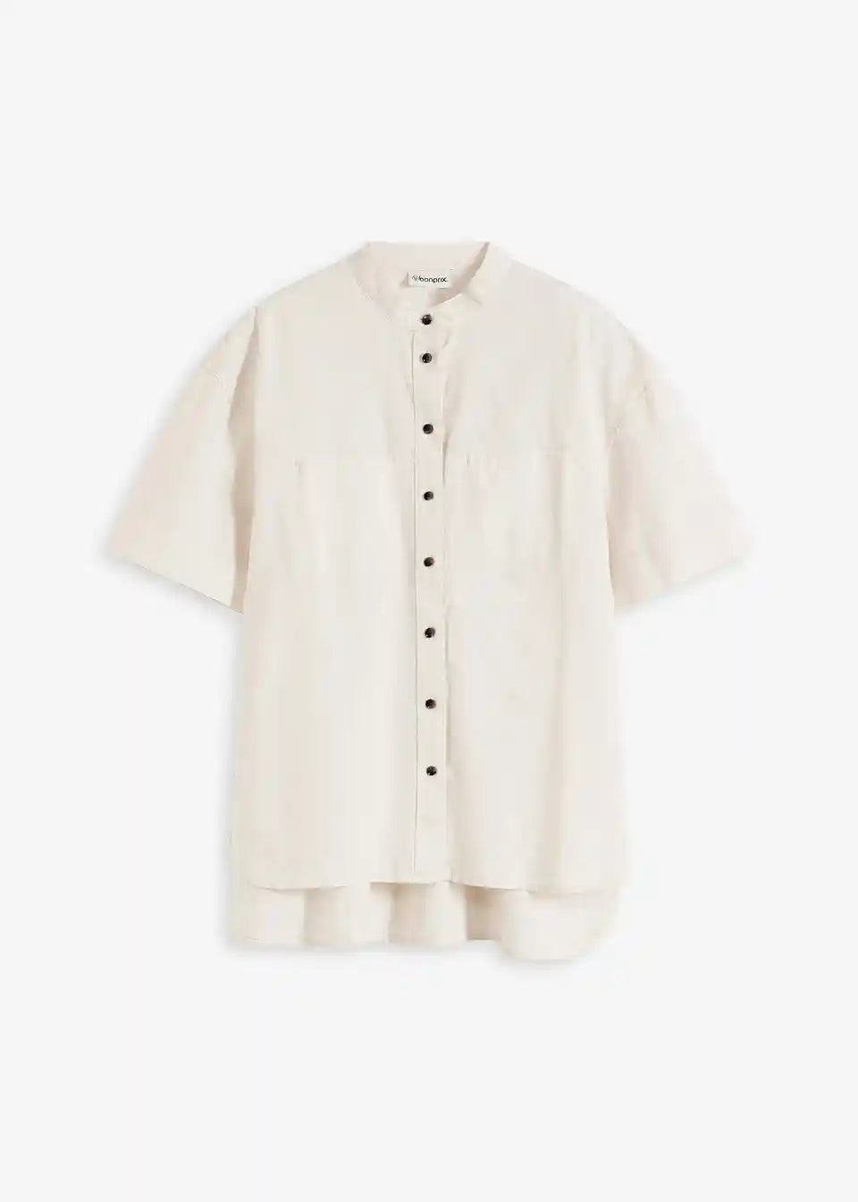 Kratko krilo srajca v ohlapnem kroju s stoječim ovratnikom in sprednjima prsni žepoma