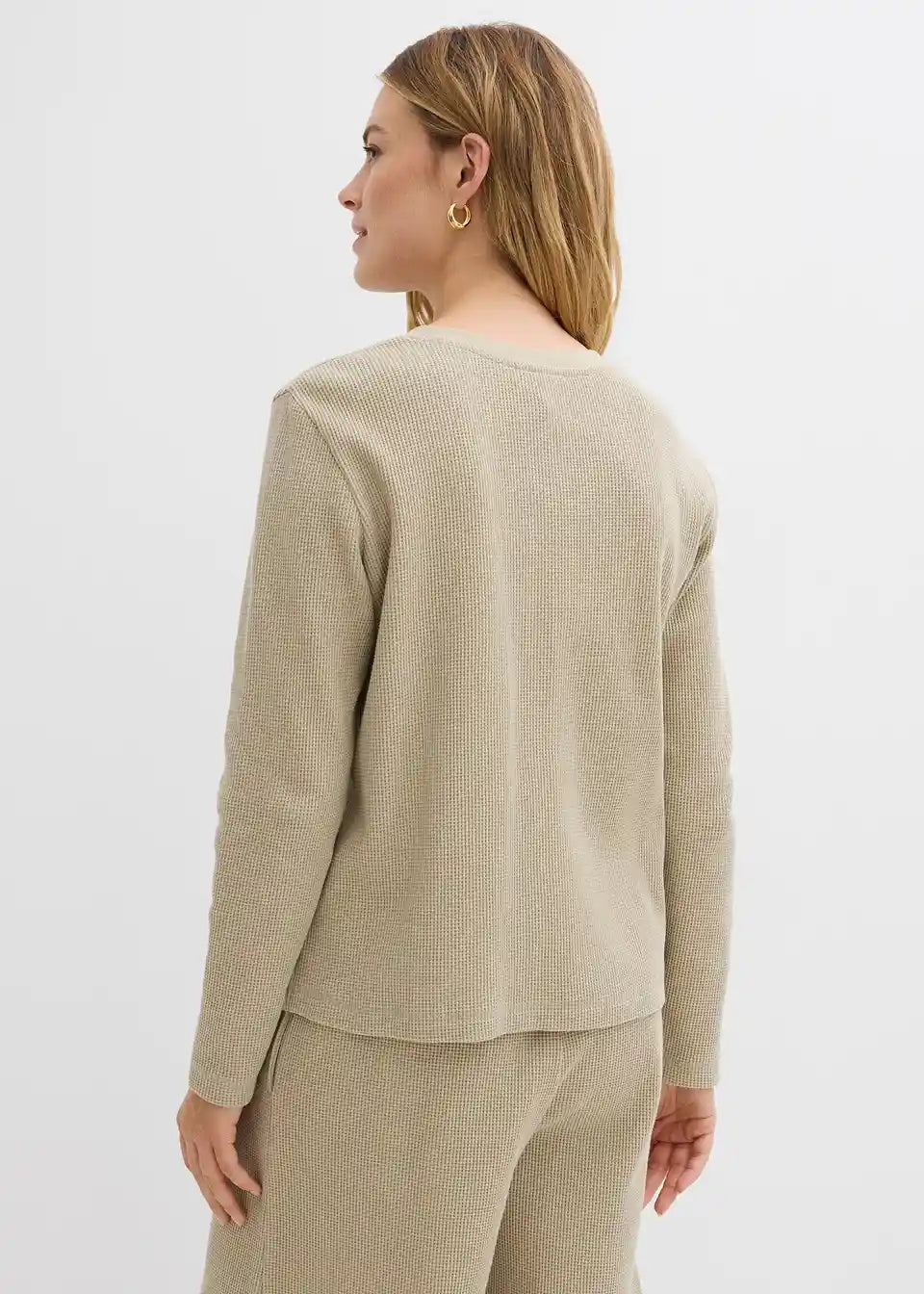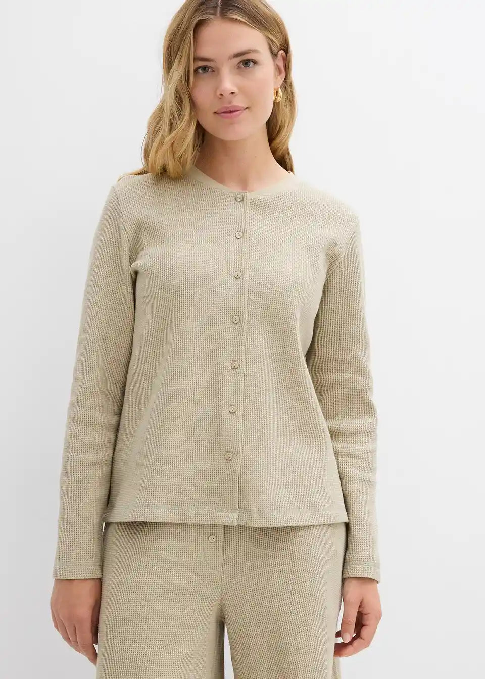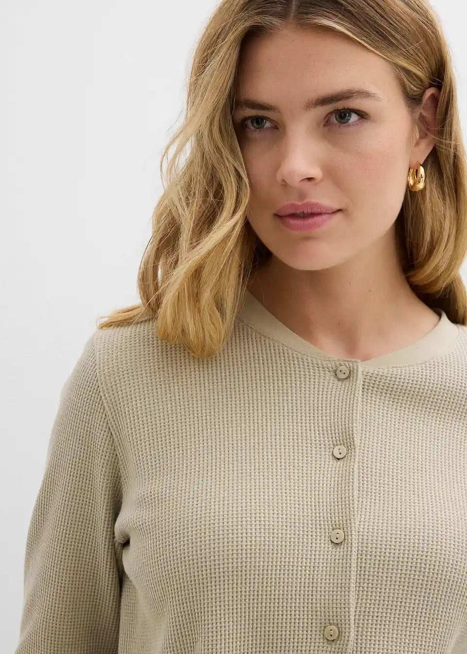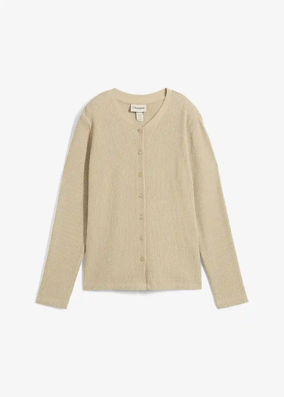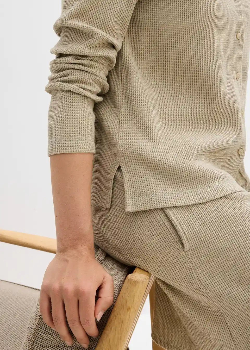 Zgornji del na gumbe iz strukturiranega Waffle-jerseya. S stranskimi razporki in rebrasto obrobo na izrezu.