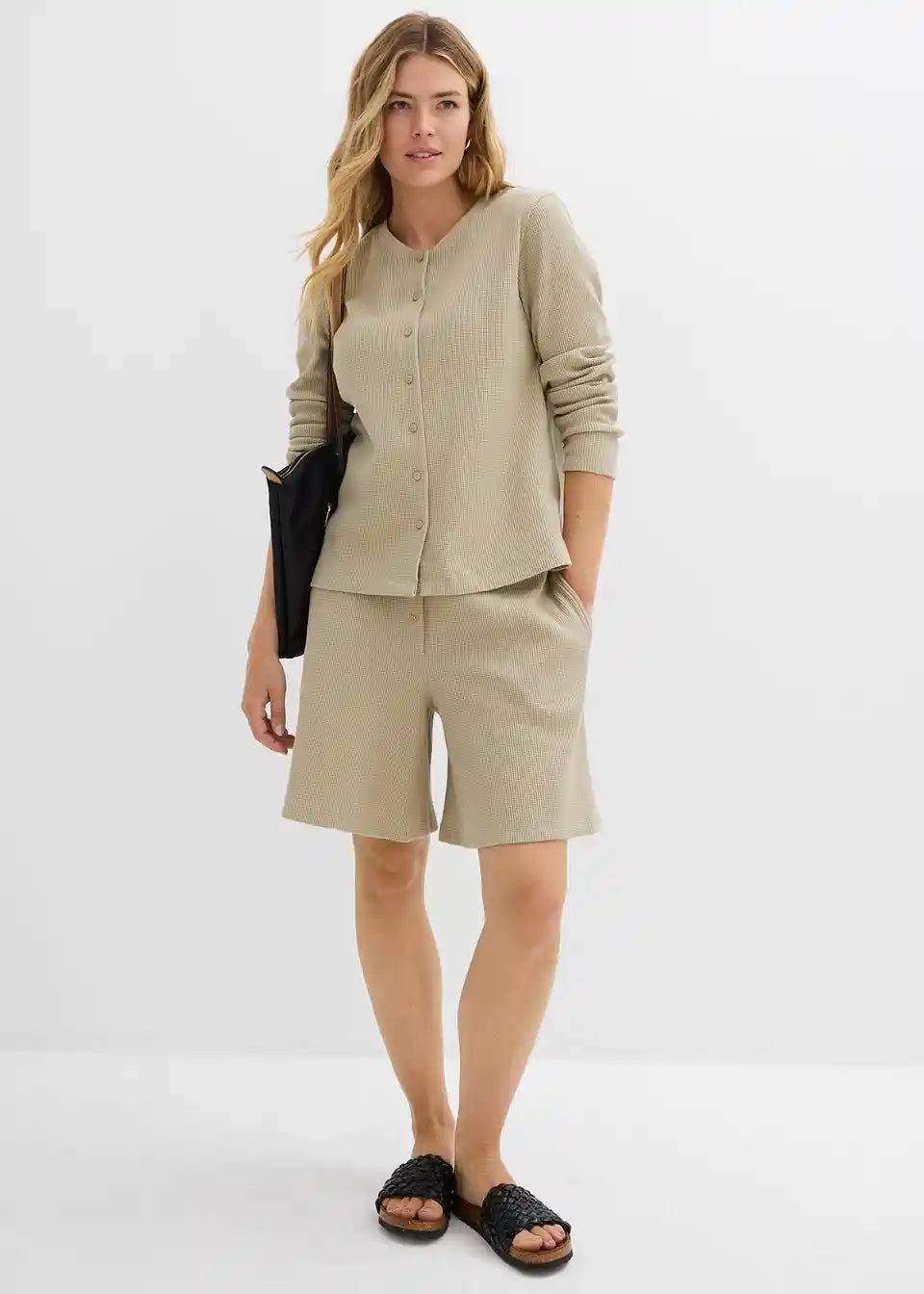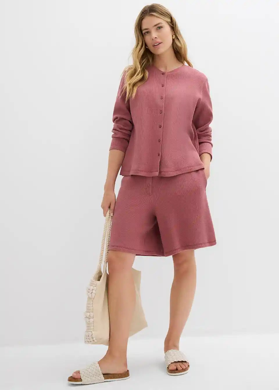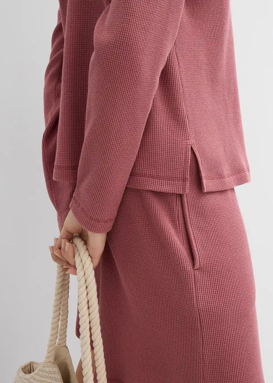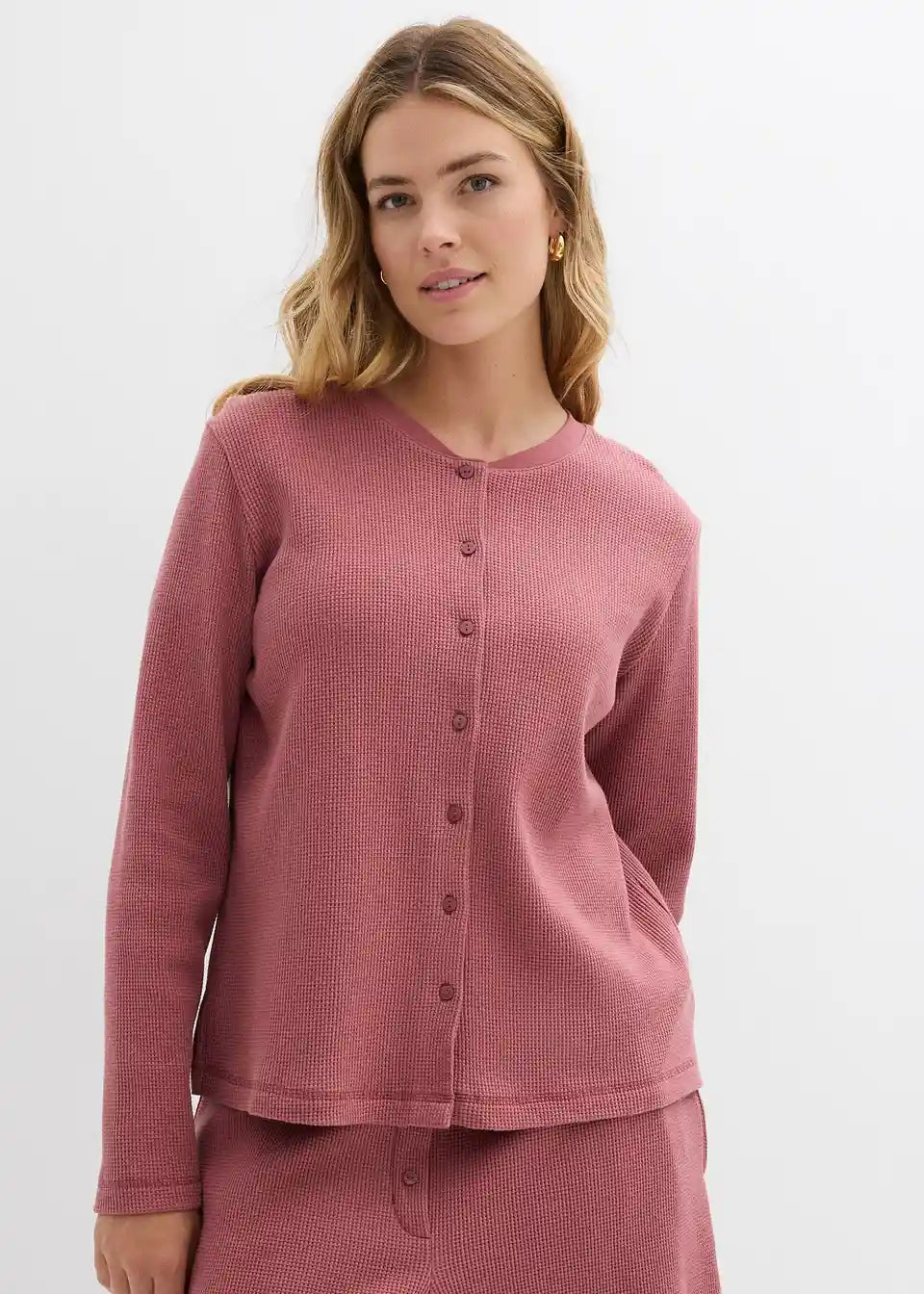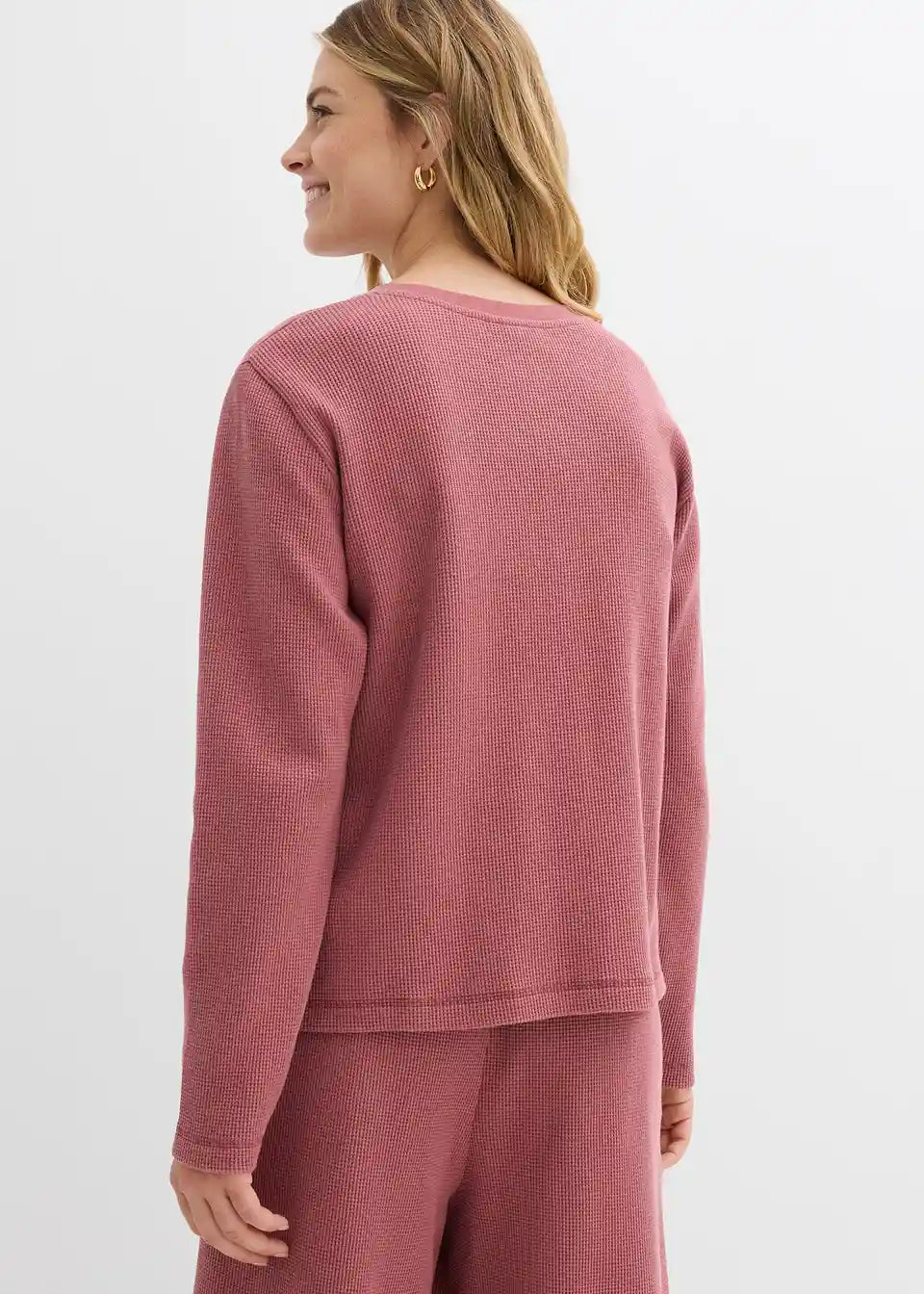 Zgornji del na gumbe iz strukturiranega Waffle-jerseya. S stranskimi razporki in rebrasto obrobo na izrezu.