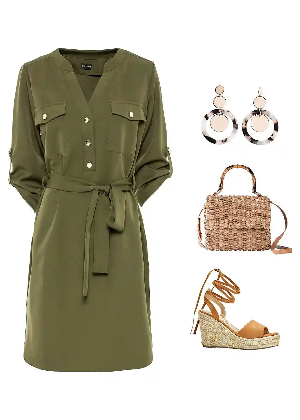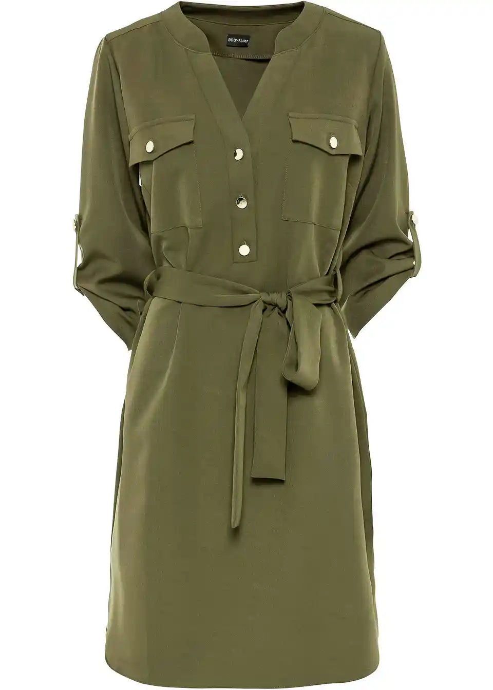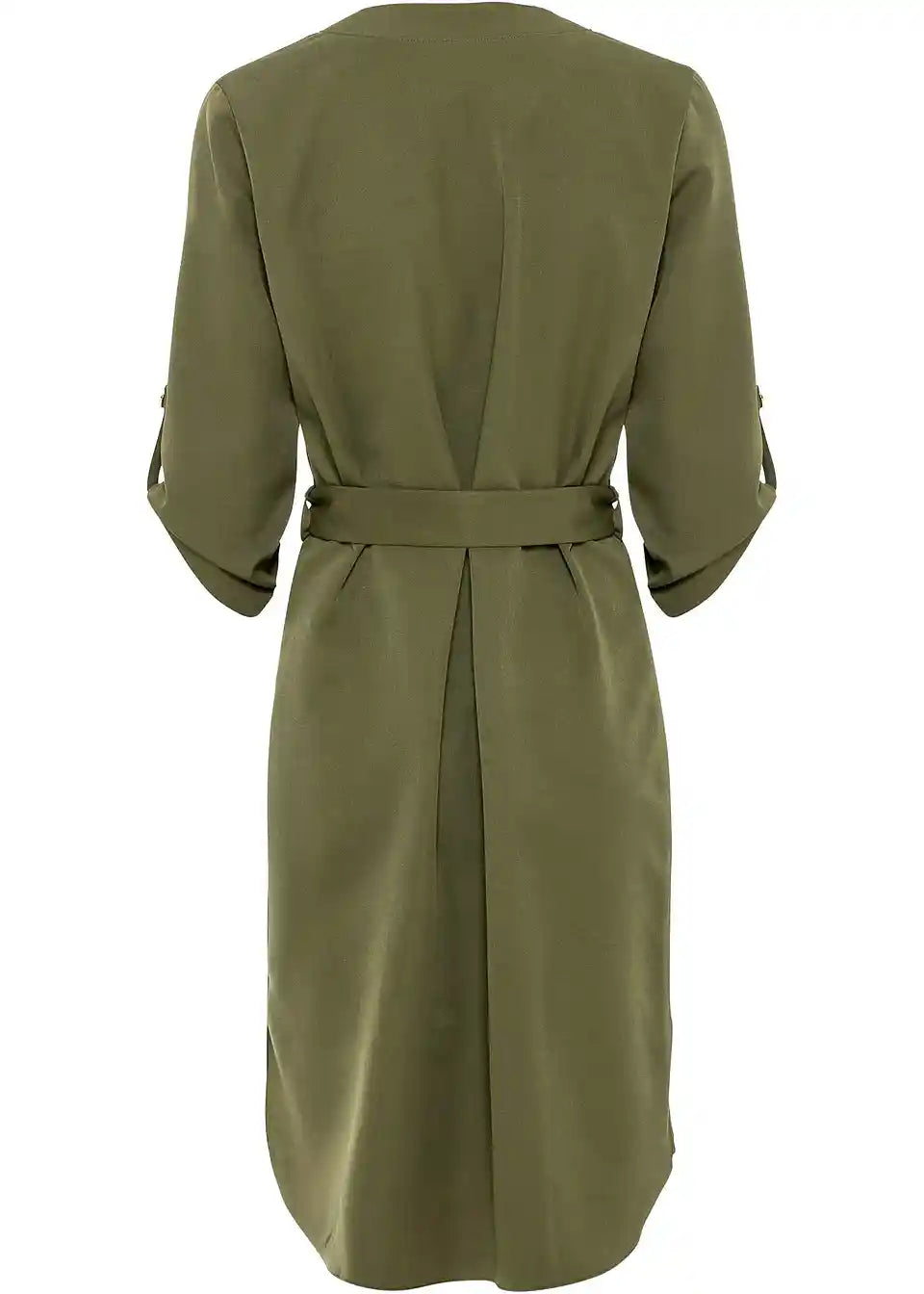Z vsemi detajli srajčne obleke: prsni žepi, stoječ ovratnik, polovična zapenjalna letev, pas z vezalko v pasu. Zložljivi rokavi. Dolžina pri št. 42 cca 106 cm.