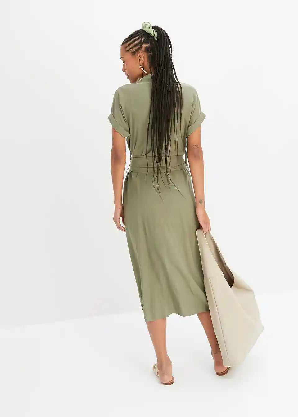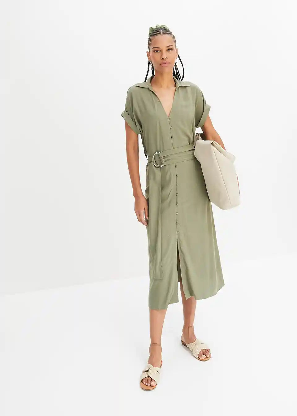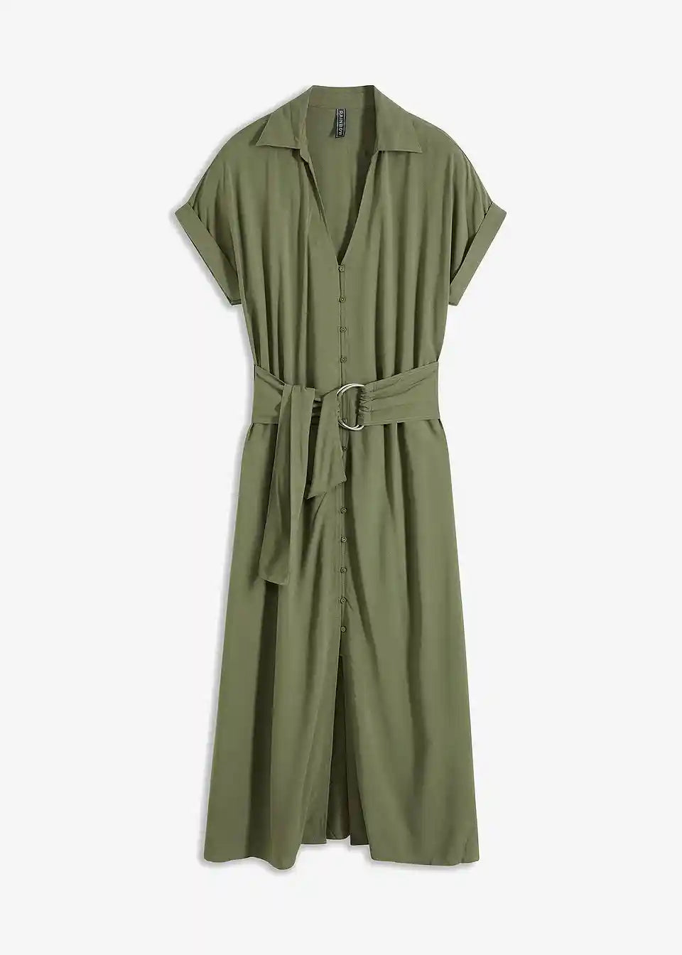 Ležerna srajčna obleka s pasom in z gumbi. Viskoza iz certificirane gozdne proizvodnje.