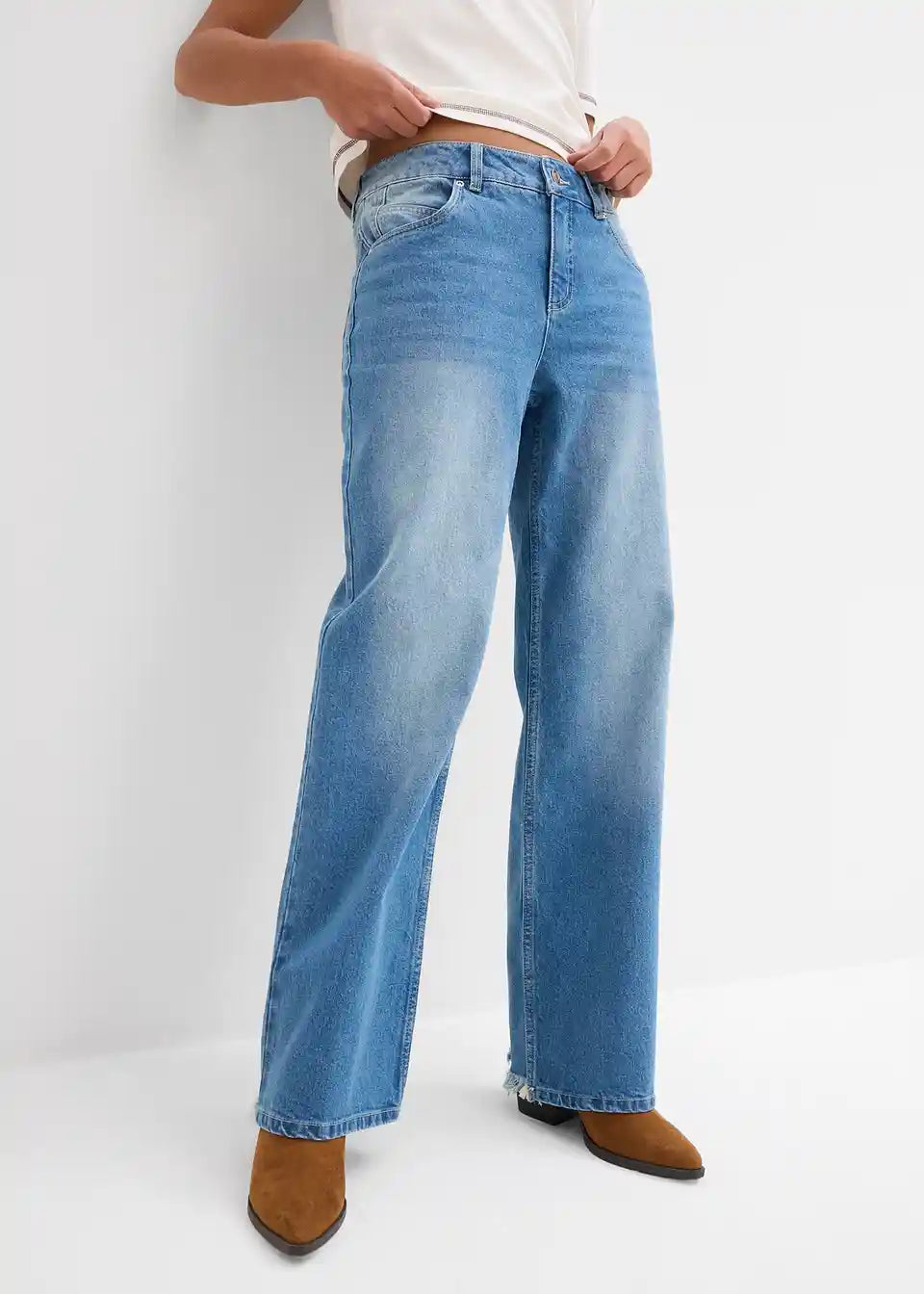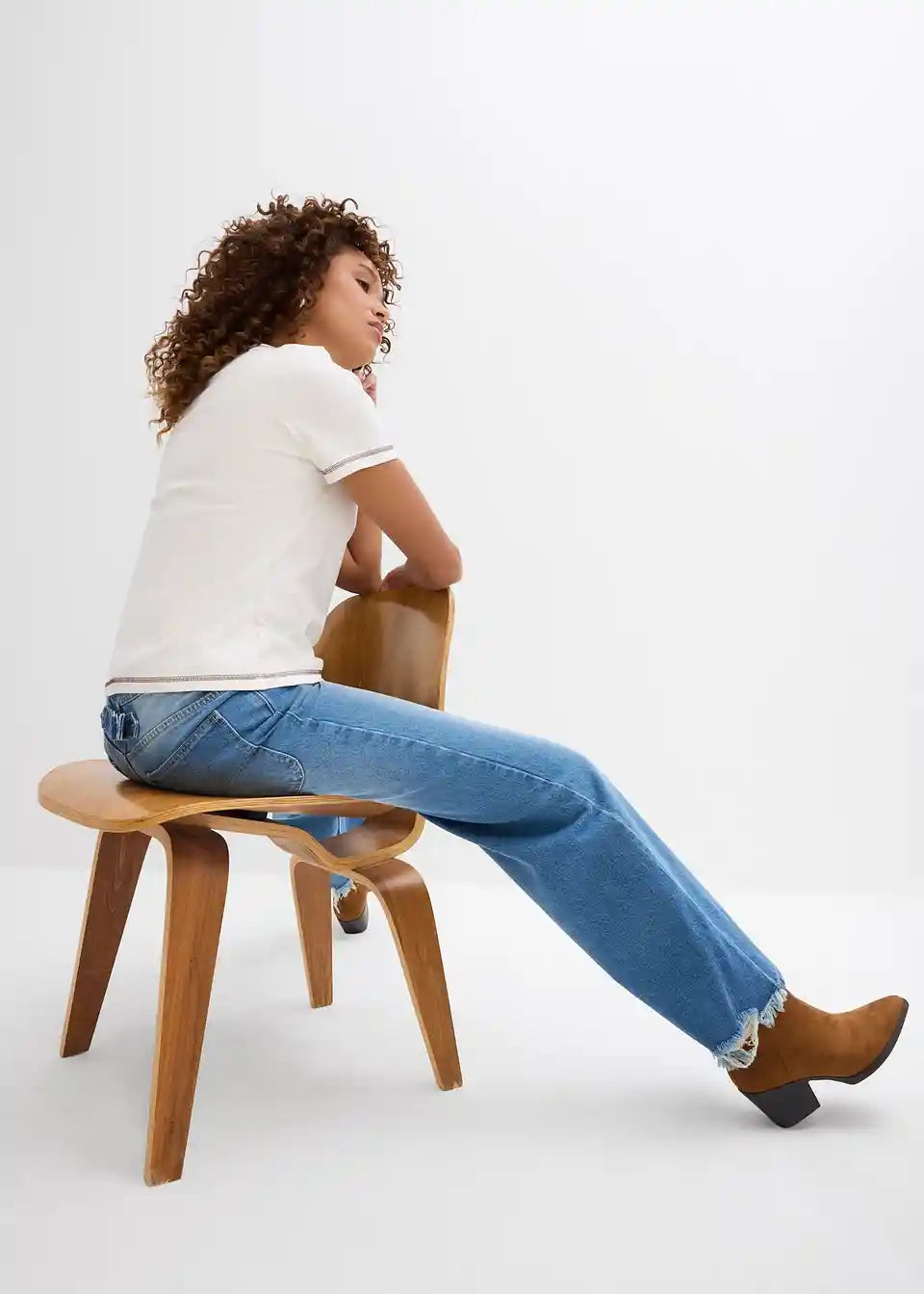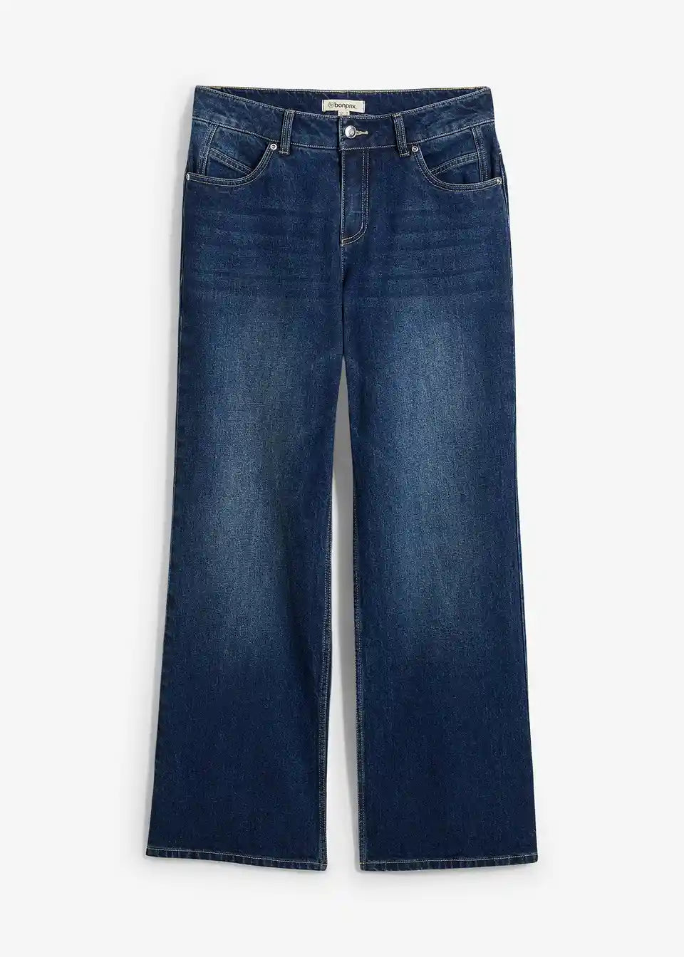 Ravne 5-žepne jeans hlače iz čvrstega bombažnega denima, ki je sprva nekoliko trd, z večkratnim nošenjem pa postane mehkejši in bolj udoben. Srednje visok pas z zadrgo in gumbom. Dolga dolžina, ki pri stopalu ustvari rahel stacking učinek. Notranja dolžina hlačnice pri st. 42 ca. 78,5 cm, primerno za pranje v pralnem stroju.