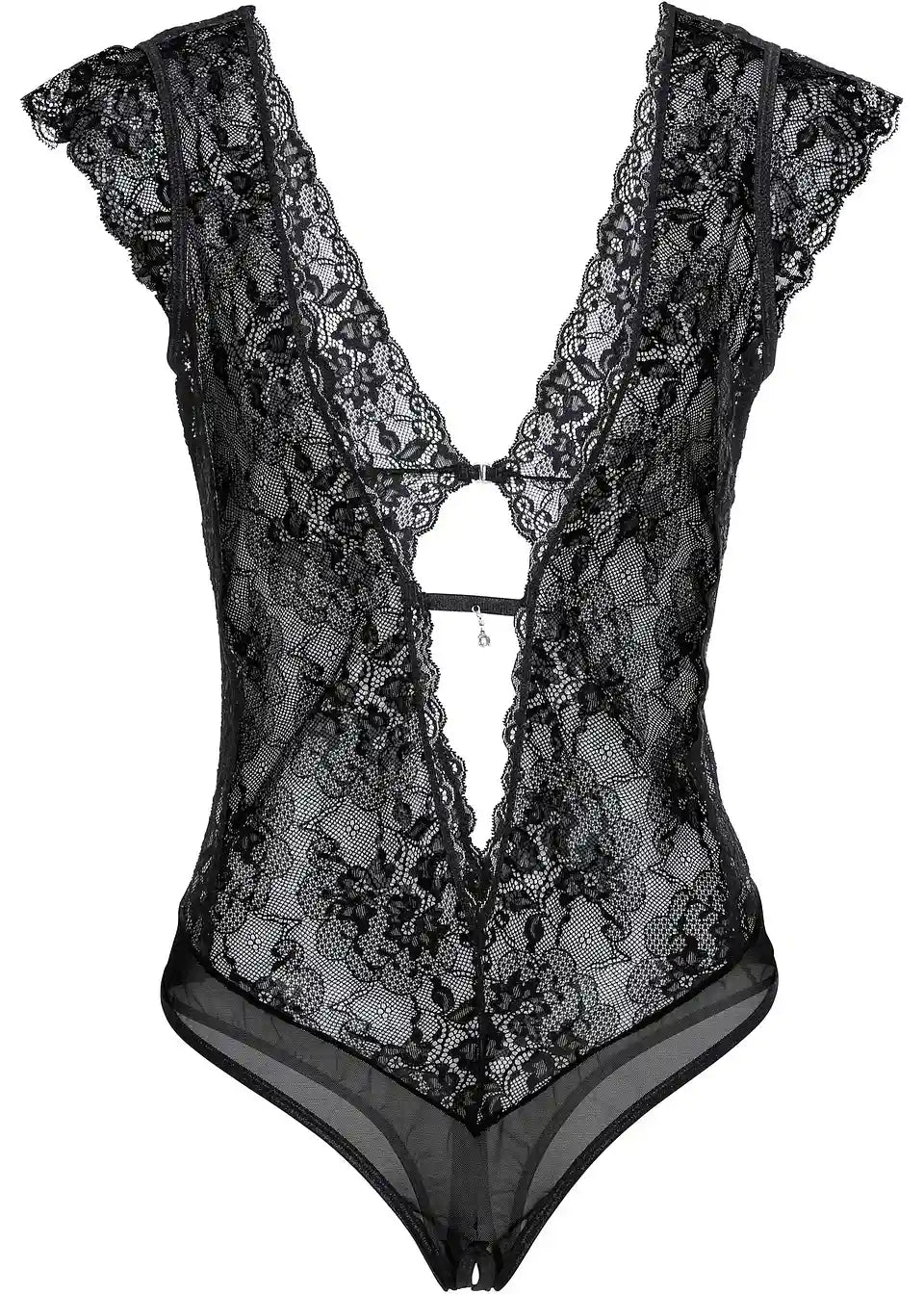 Naj se vas očara! Čudovit stringbody ouvert navdušuje predvsem zaradi igrive čipke. Globok izrez in zračni detajl v koraku zagotavljata čutne trenutke v dvoje. Modni hrbtni del poudarja slog in zagotavlja zapeljivost na obeh straneh.