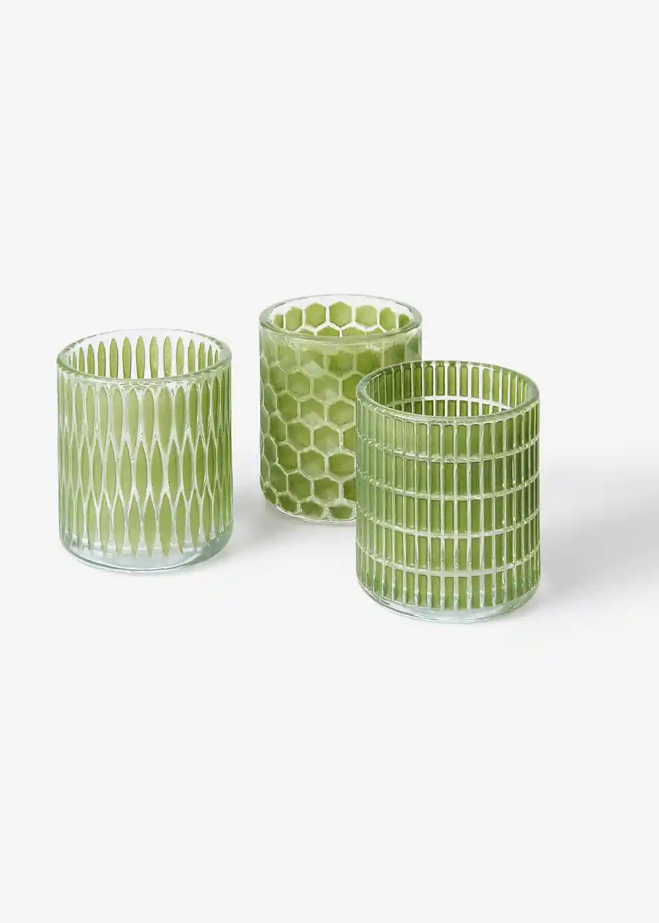 Stekleni svečniki z različnimi dizajni v aktualnem zelenem odtenku. S vstavljenimi čajnimi svečkami ustvarijo svečniki prijetno vzdušje.