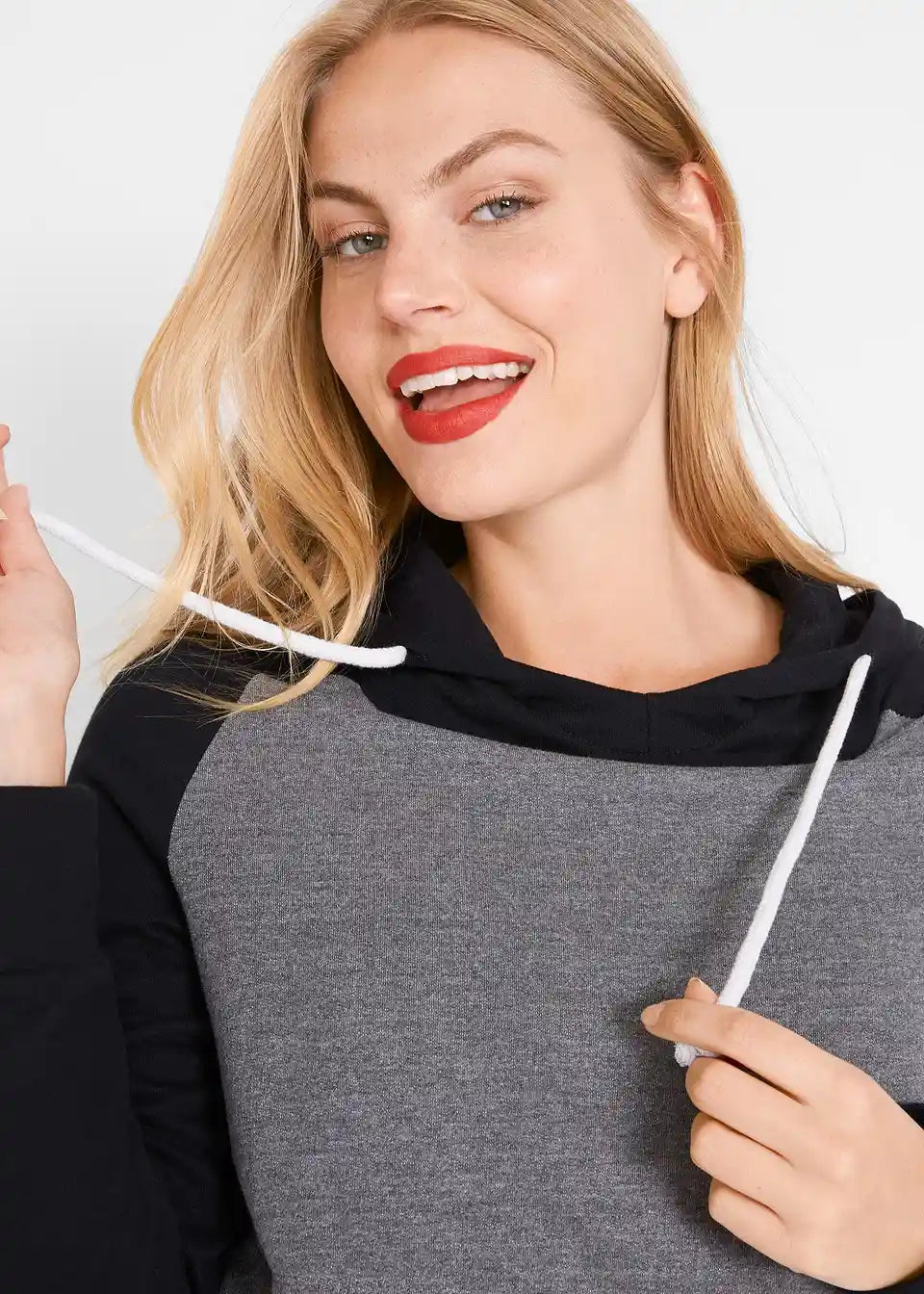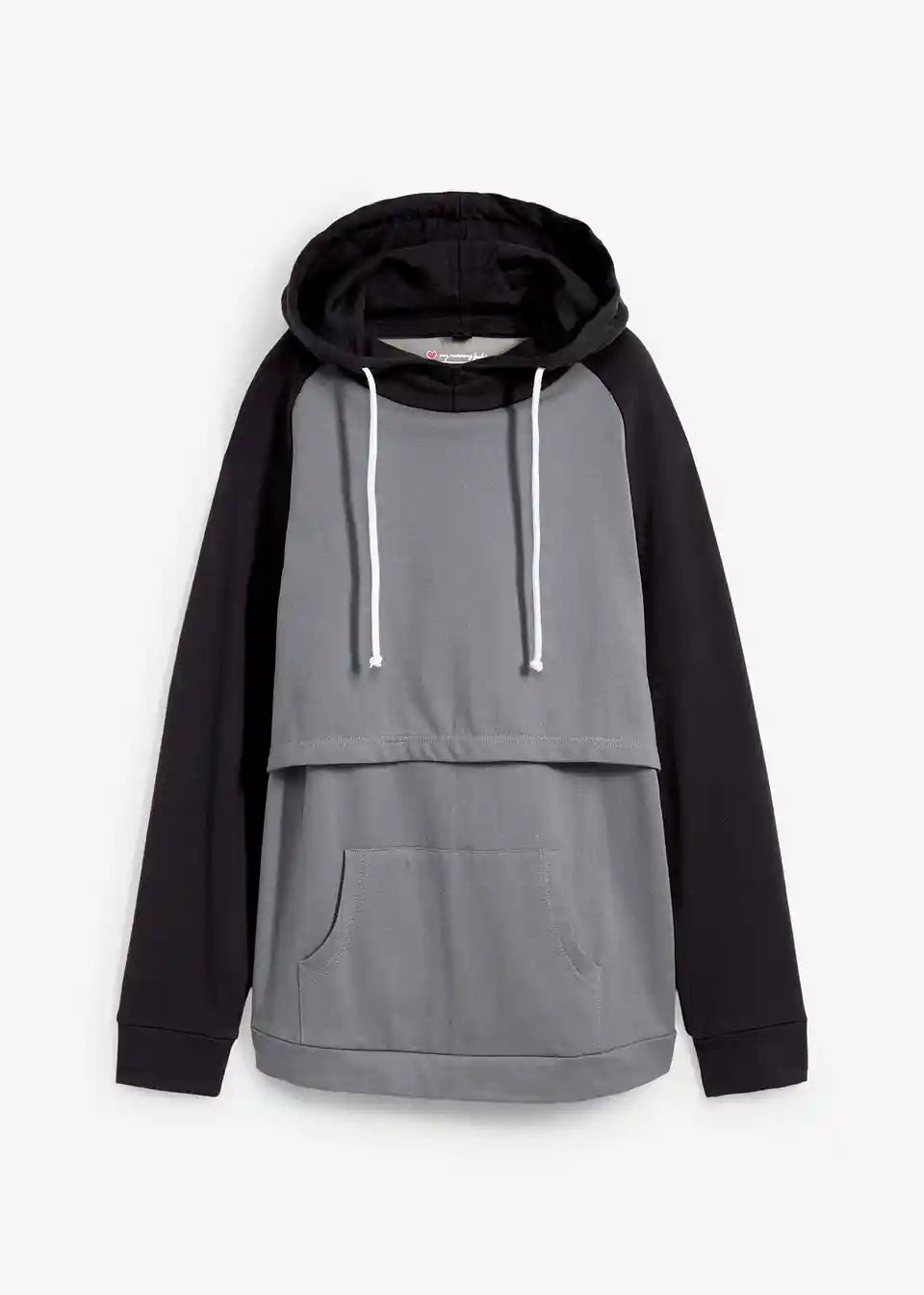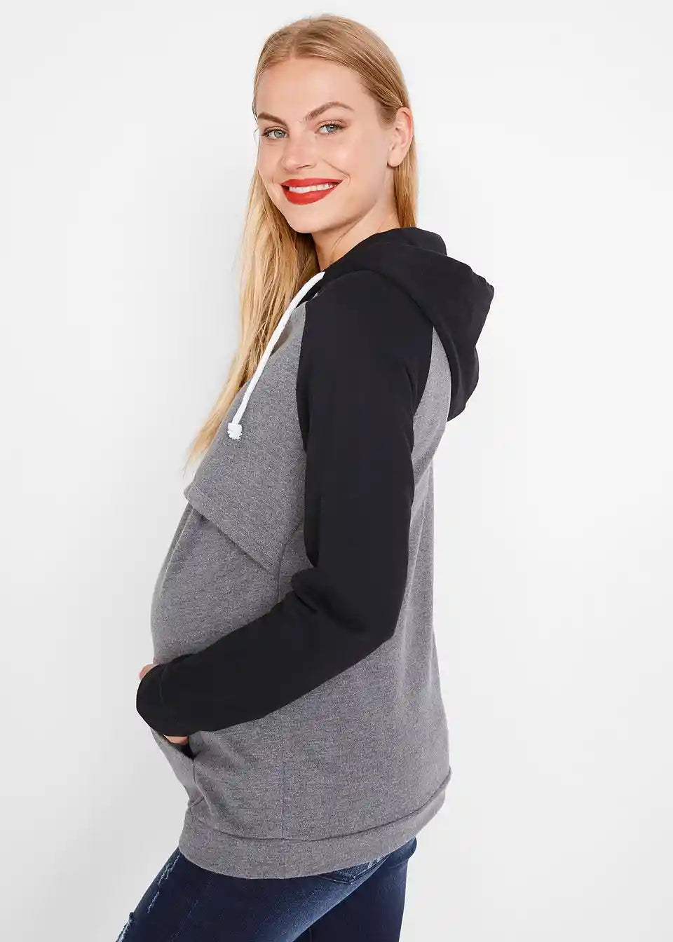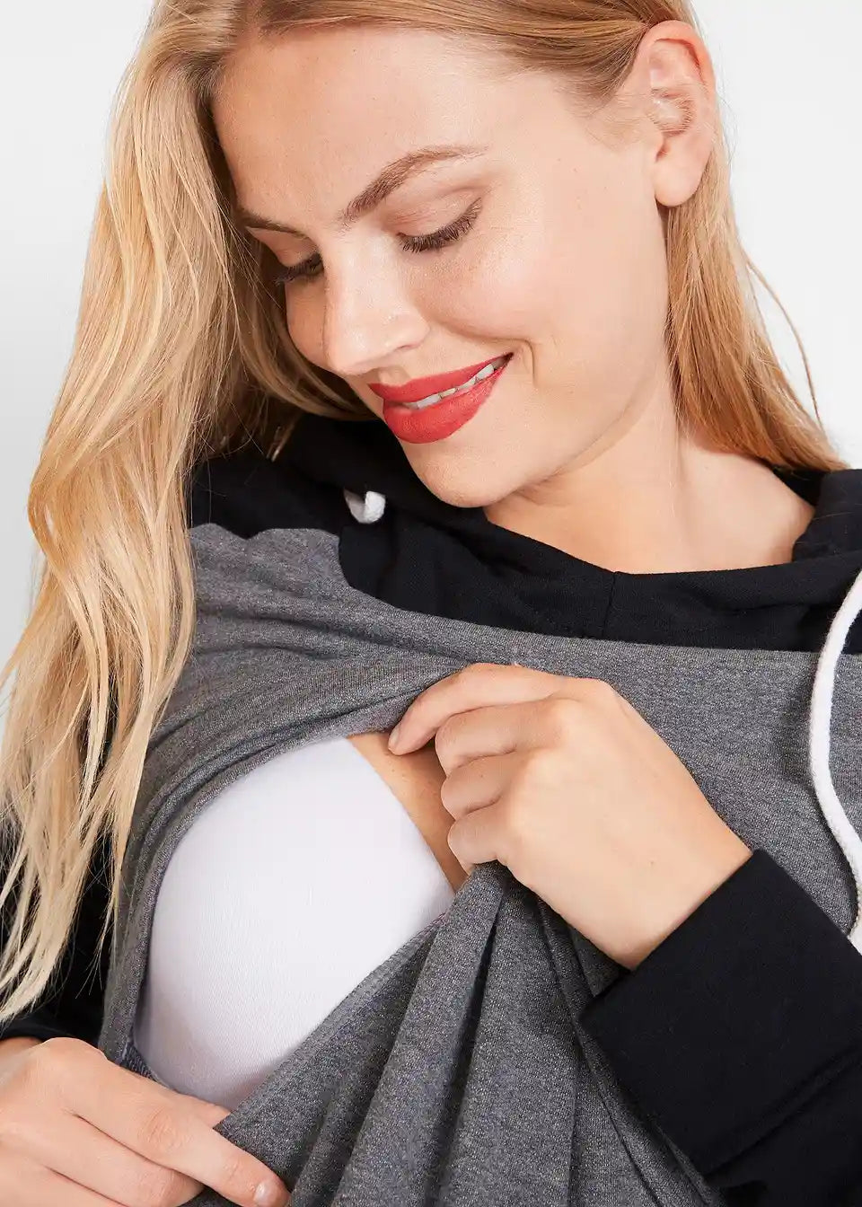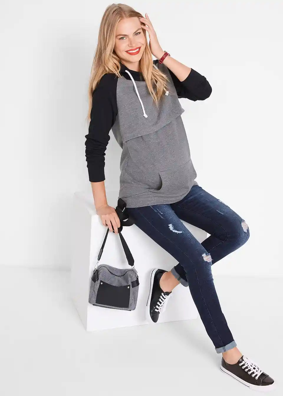Ta sweatshirt v modnem uličnem stilu spremlja prihodnje mamice skozi nosečnost in se izkaže kot udoben sopotnik tudi po rojstvu. Zahvaljujoč udobnemu kroju v kombinaciji s prijetnim materialom sweat, nosečniški pulover raste z rastočim trebuhom. Med obdobjem dojenja lahko dvodelna sprednja stran preprosto dvigne za dojenje.