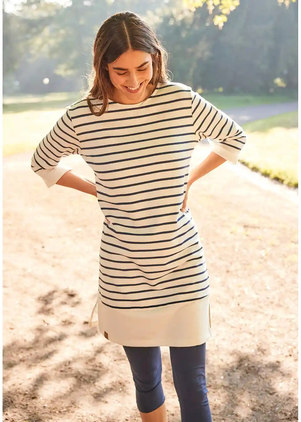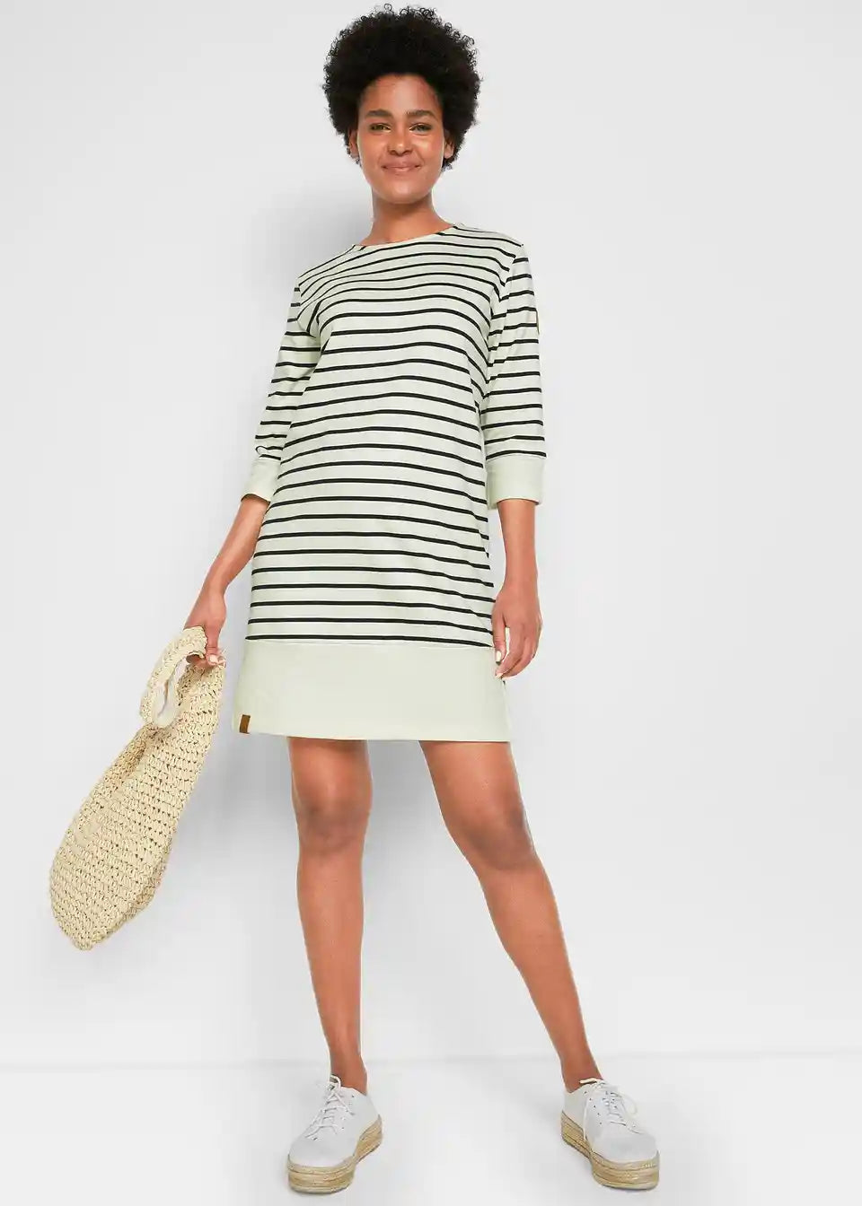 Maritimno črtasta sweat obleka z ladijskim izrezom in 3/4 rokavi