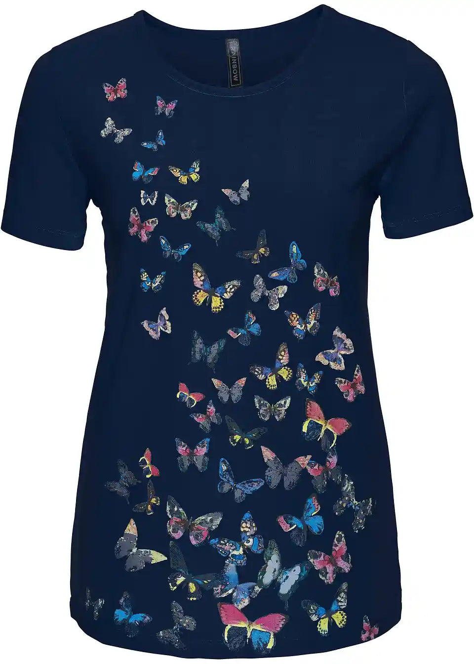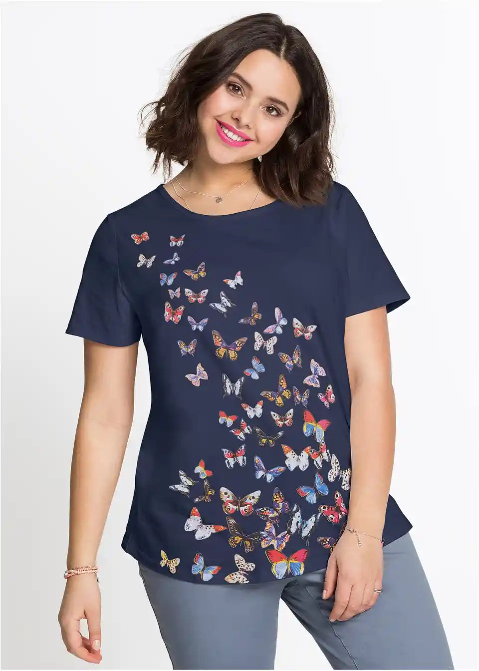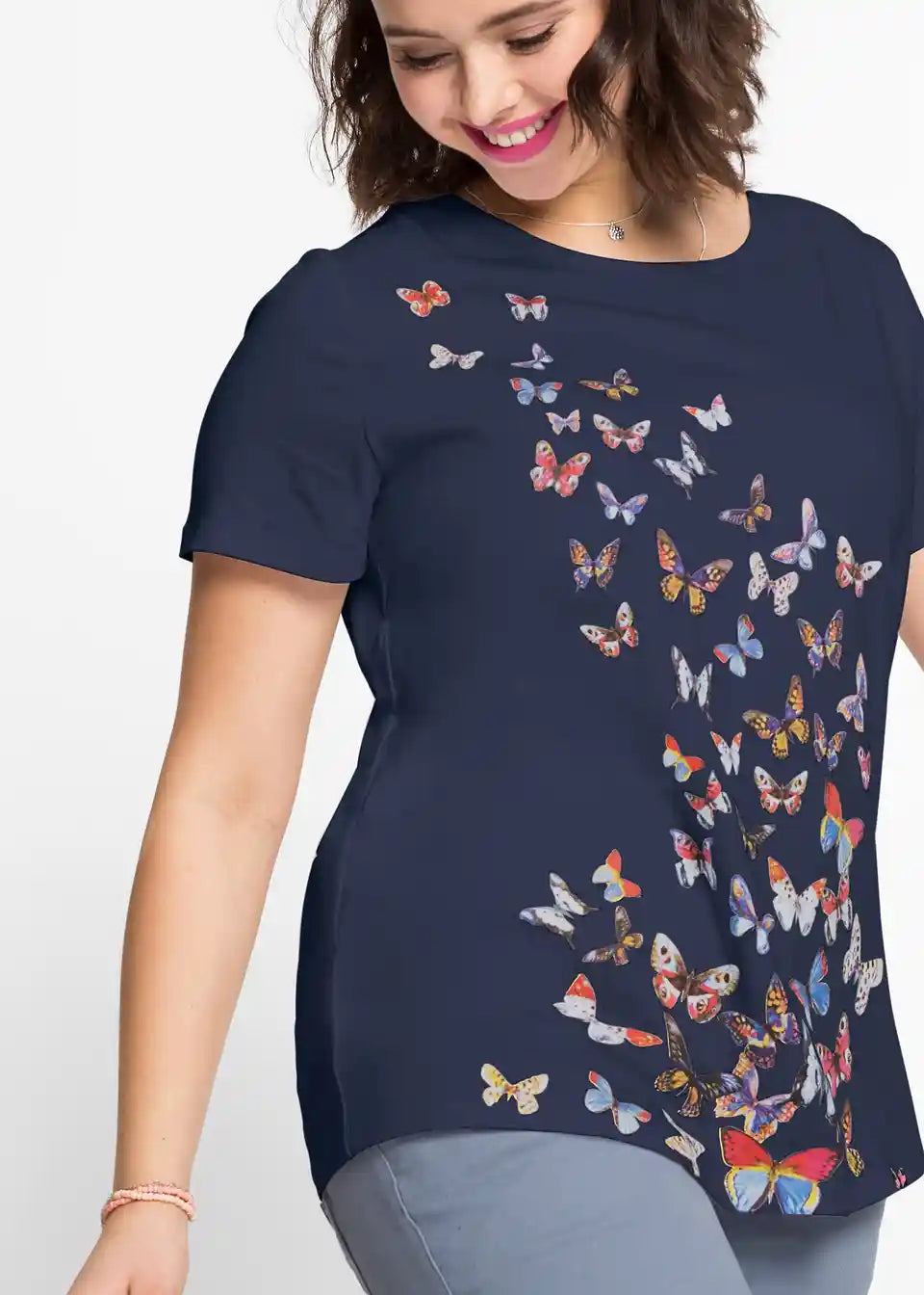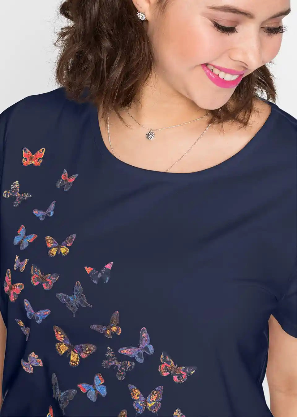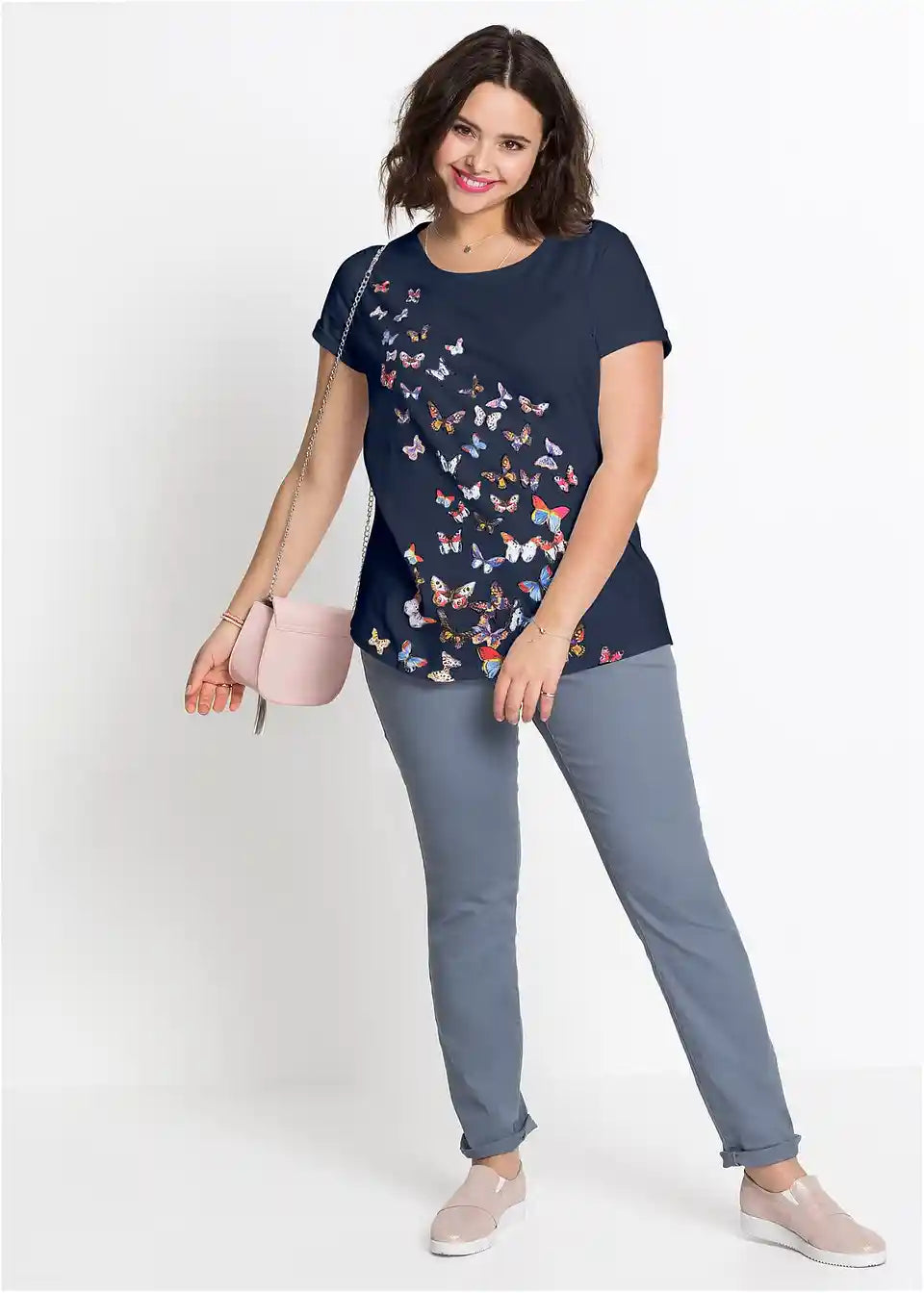 Barviti potisk na sprednji strani z igrivimi motivi daje tej majici prikupen videz. Majica v rahlo oprijeti krojni obliki nežno poudari postavo. Visoko zaprti okrogel izrez in kratki ozki rokavi poudarjajo trendovski dizajn. Ta modna različica v dolžini do bokov prinaša veliko dobre volje in doda kul poudarek garderobi.