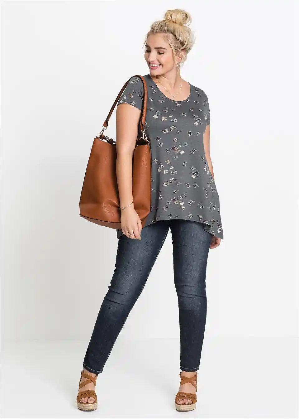 Ta rahlo razširjena majica dobi s podaljšanimi stranskimi robovi modni pridih. Model s kratkimi rokavi in okroglim izrezom navdušuje s svojim prikrivajočim učinkom. Majica je odlična osnova za sproščen denim videz. Moderen oversize videz lahko dosežete s hlačami Palazzo in debelim pletenim kardiganom. Tudi pajkice ali ozke hlače z uničenimi detajli jo odlično dopolnjujejo.