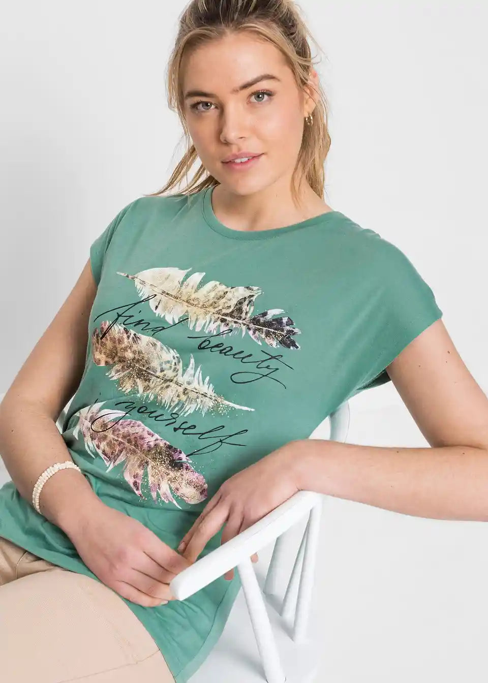 S pisanim napisom in velikimi, lesketajočimi se motivi navduši ta kul majica v boho slogu. Moden model z okroglim vratnim izrezom se ponaša s kratkimi krilnimi rokavi. Sega do bokov in ima ohlapen kroj. Modna T-shirt z bleščicami se odlično kombinira z jeans hlačami ali chinos hlačami ter s pletenimi jopicami in bluzoni.