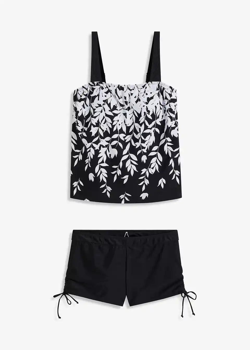 Z integriranimi mehkimi košaricami, podloženim delom pri prsih in spodnjim elastičnim trakom. Nastavljive naramnice. Bikini hlačke ob strani nastavljive z zavezovanjem.