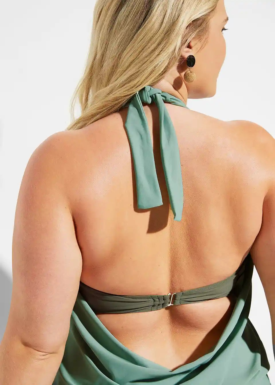 3-delni Tankini sestavljen iz bustier zgornjega dela, tanktopa in bikini hlačk. Zgornji del nekoliko širšega kroja z V-izrezom v obliki naramnic za zavezovanje za vrat. Bandeau zgornji del z podlogo za prsi in odstranljivimi mehki košaricami. Okoli celotnega kosa je elastika pod prsmi. Običajne bikini hlačke.