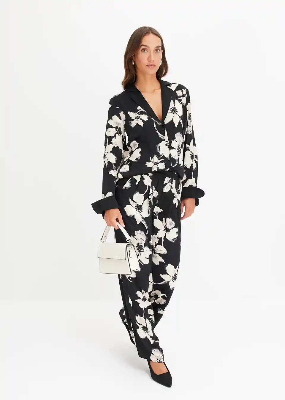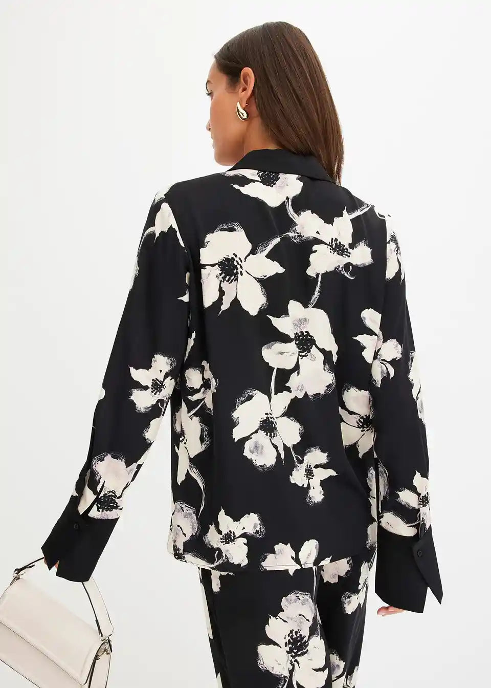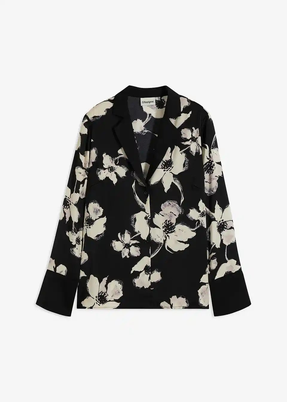 modna satenasta bluza s cvetličnim potiskom in rebrastim ovratnikom