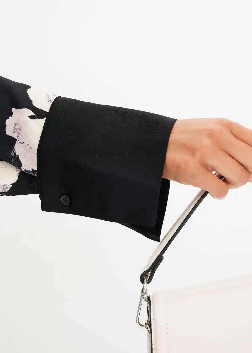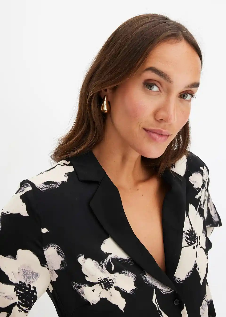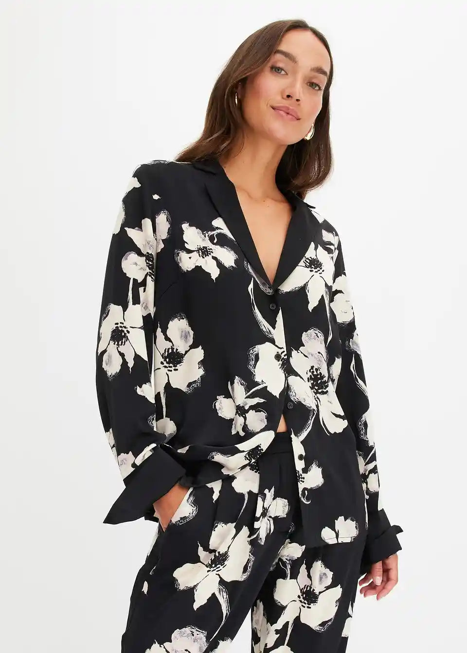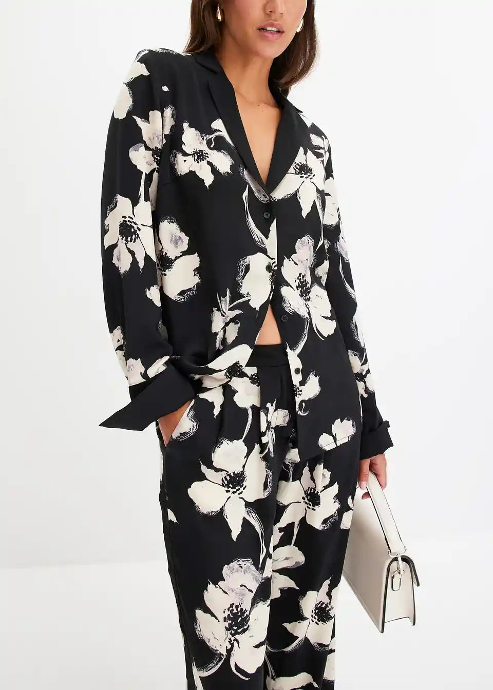 modna satenasta bluza s cvetličnim potiskom in rebrastim ovratnikom