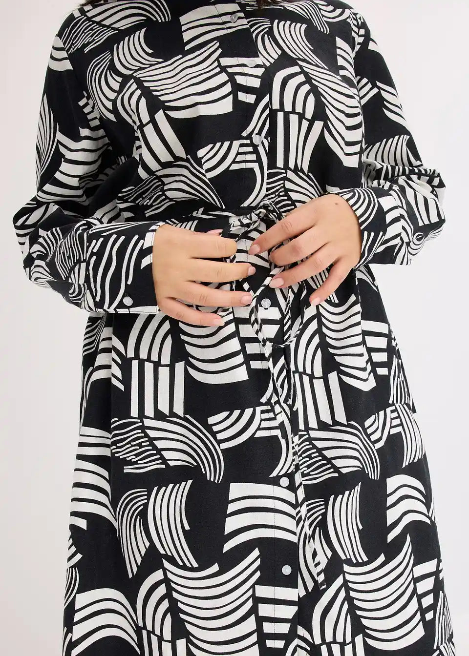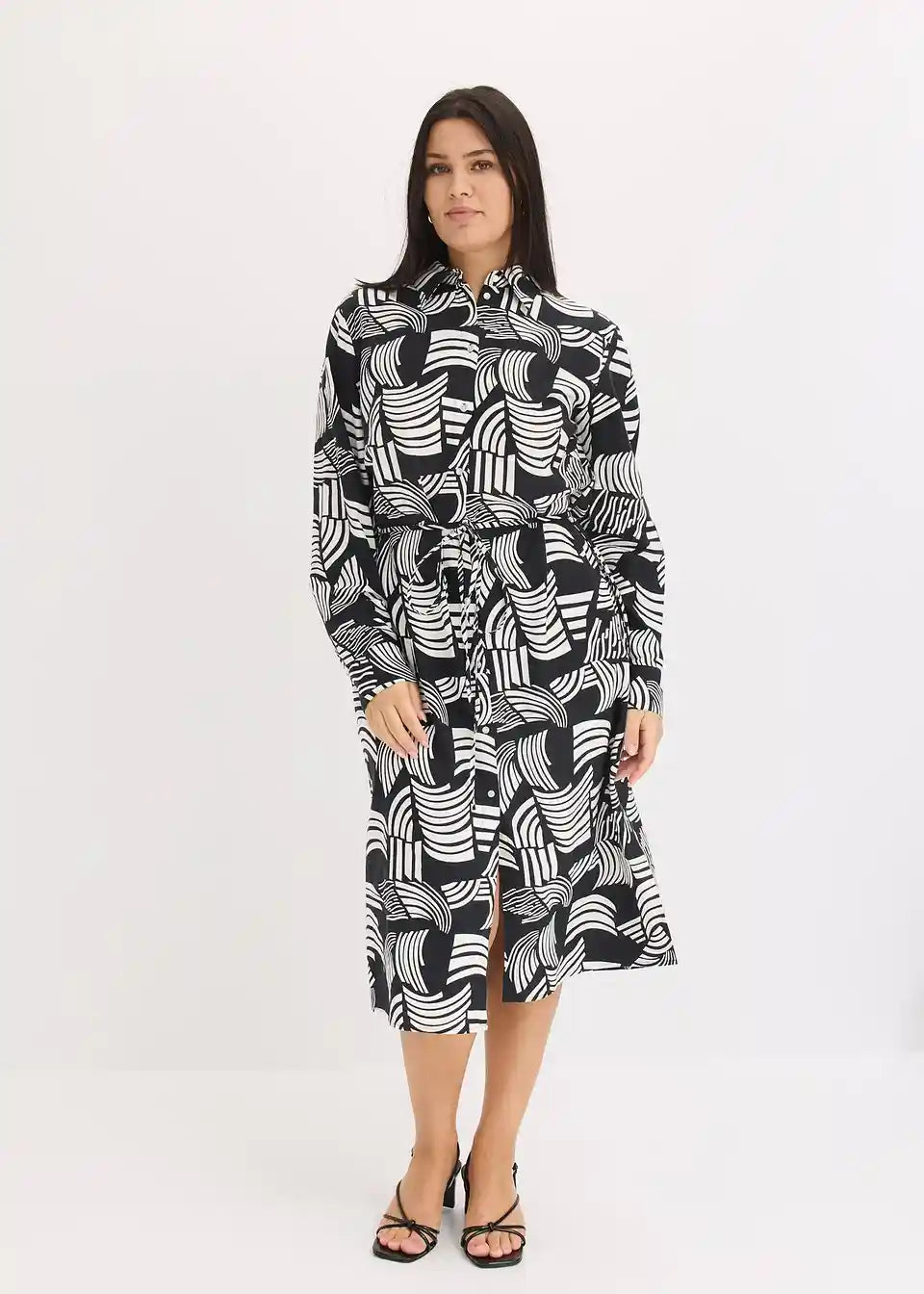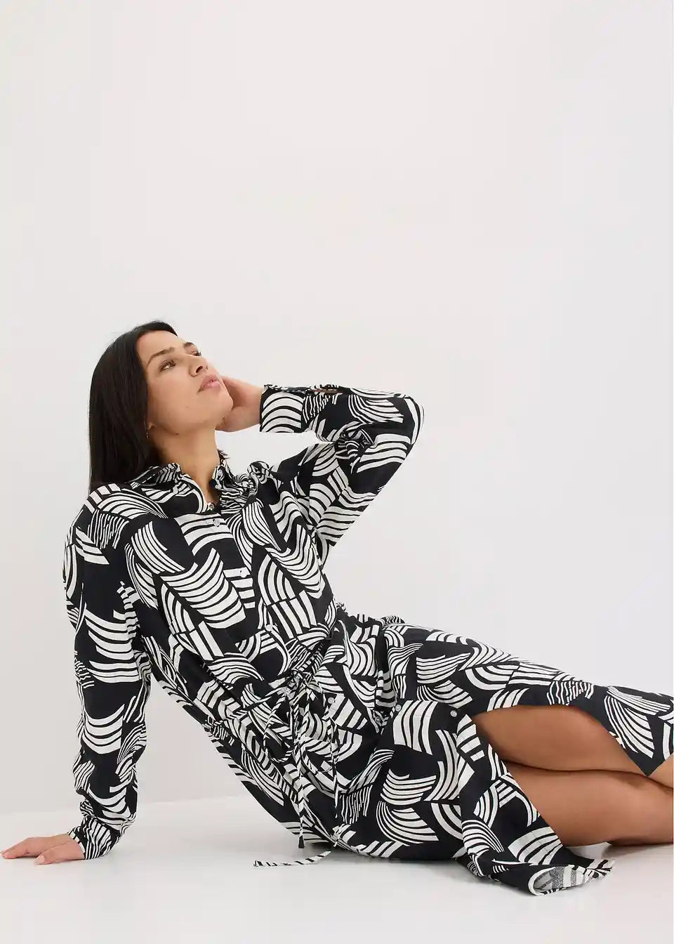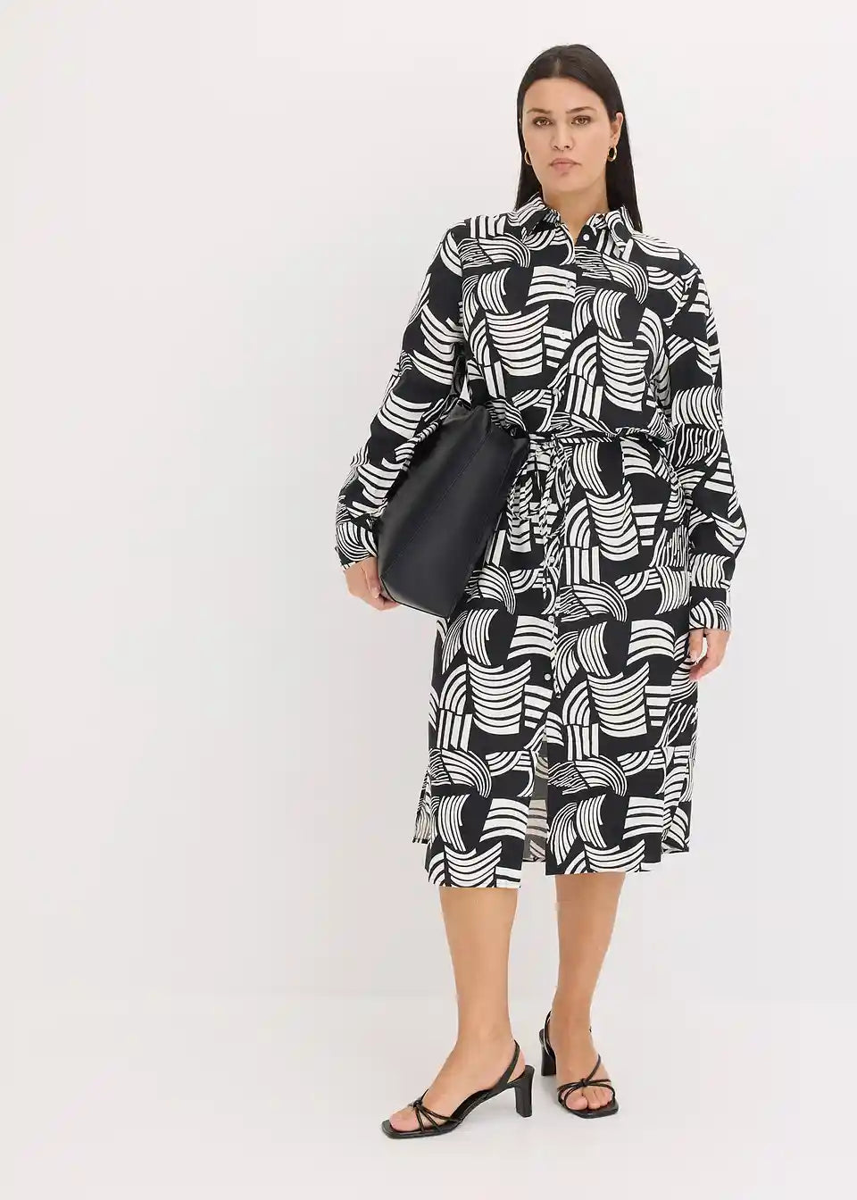 modna bluza obleka v midi dolžini iz lahke mešanice lanu z zavezovanjem v pasu in stranskimi razporki