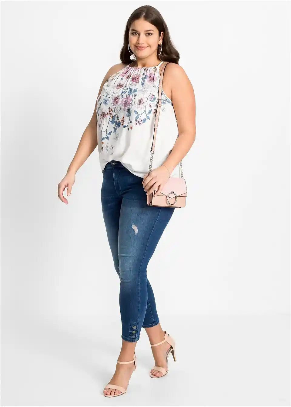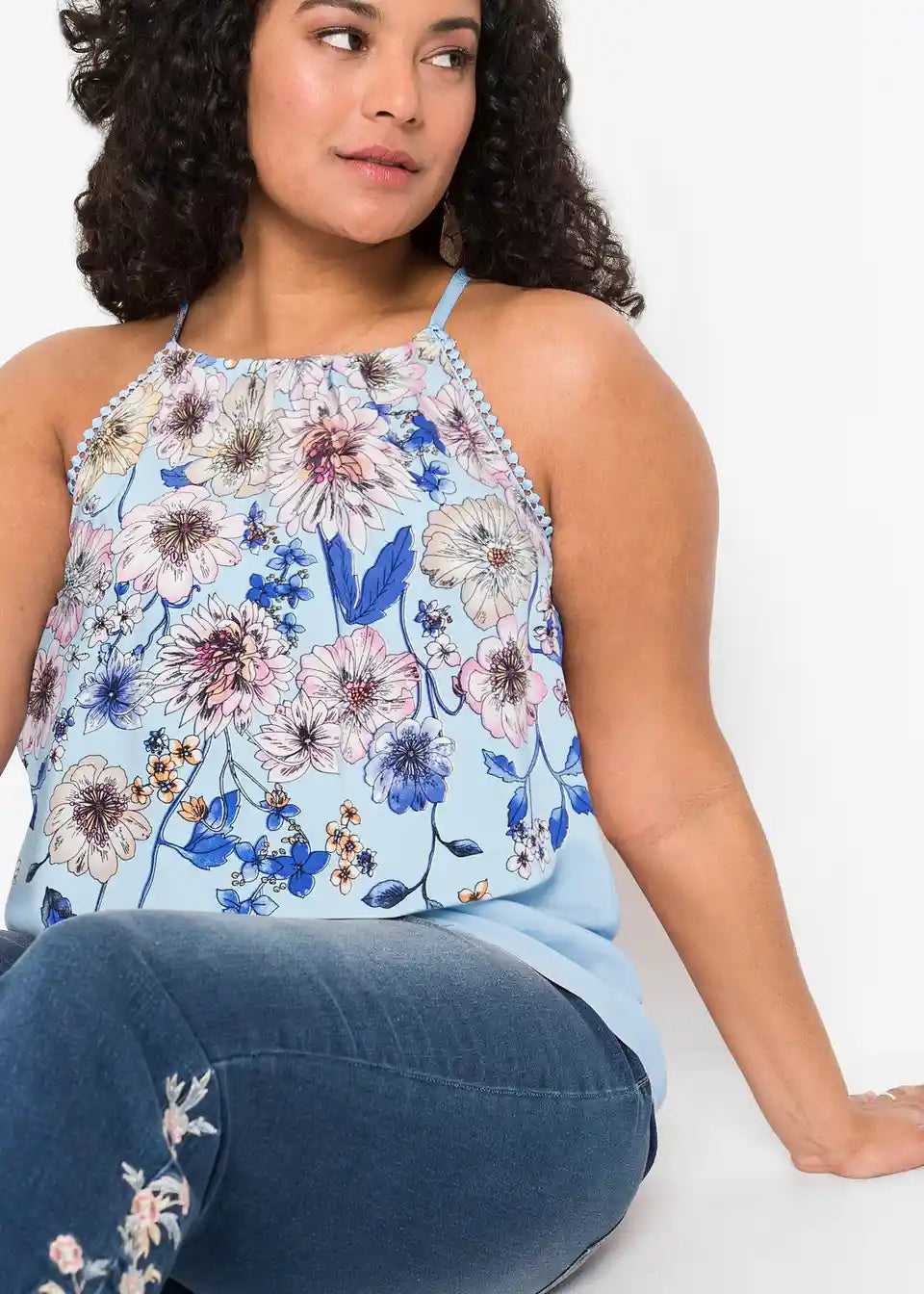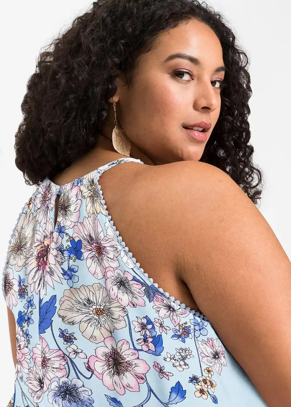 Ta tiskana bluza top znamke BODYFLIRT je modni vrhunec v garderobi. Detajlirana optika z cvetličnim potiskom in romantičnim čipkastim robom naredi zgornji del opazen modni partner za trendovske kombinacije. Z ovratnikom halter in choker detaljem ob vratu top graciozno oblikuje žensko silhueto. Odličen videz za tople dni se lahko dopolni z vezenimi kavbojkami in sandaleti.