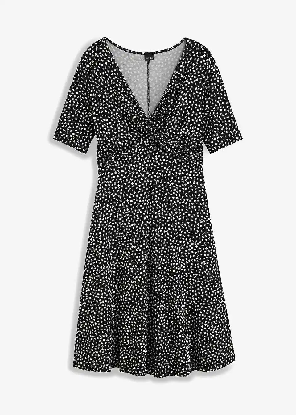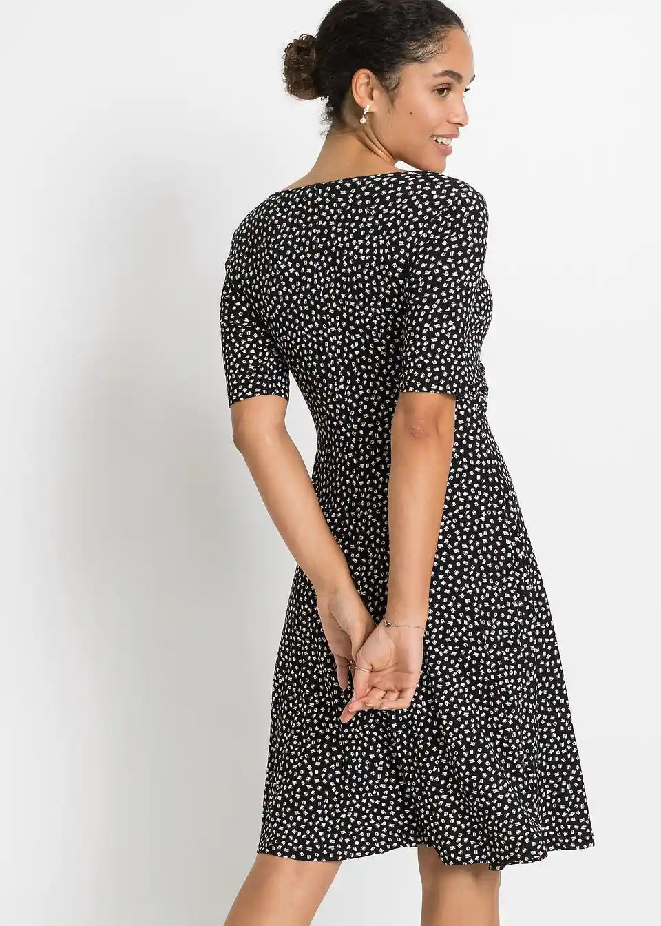 Tiskana obleka iz jerseya z vsestranskim potiskom je prava paša za oči. Nabrano pod prsmi poudarja globok V-izrez. Oprijeti rokavi, dolgi približno do komolcev, dodajo elegantno noto kosu iz BODYFLIRT kolekcije. Čarmantna tiskana jersey obleka z drapiranjem sega do kolen. Eleganten videz lahko dosežete s čevlji s peto ali sandali. Moderen pridih pa ji dodate z nizkimi čevlji ali balerinkami, jeans jakno in trendovsko torbico s statement pridihom.