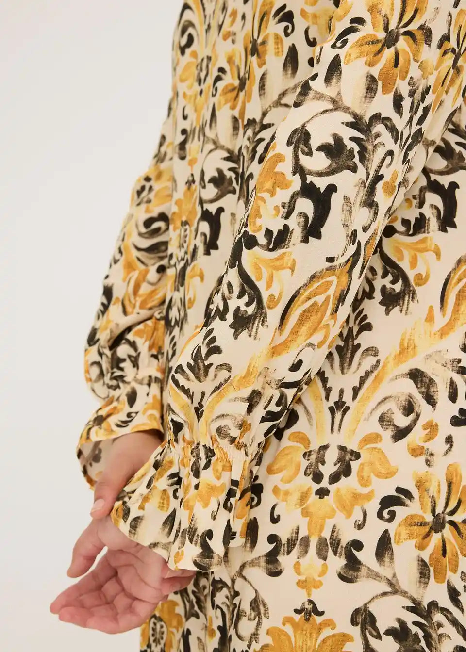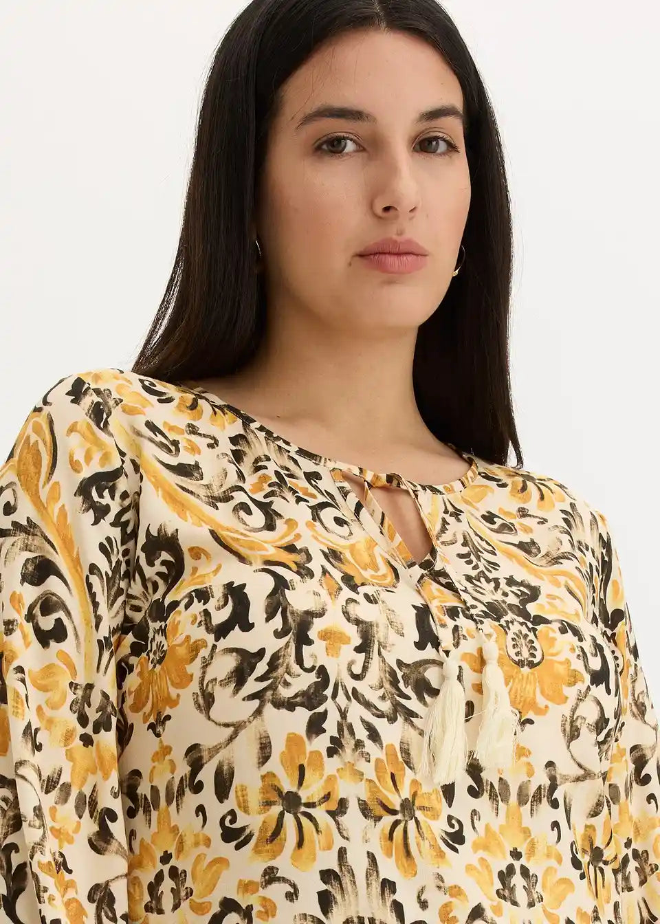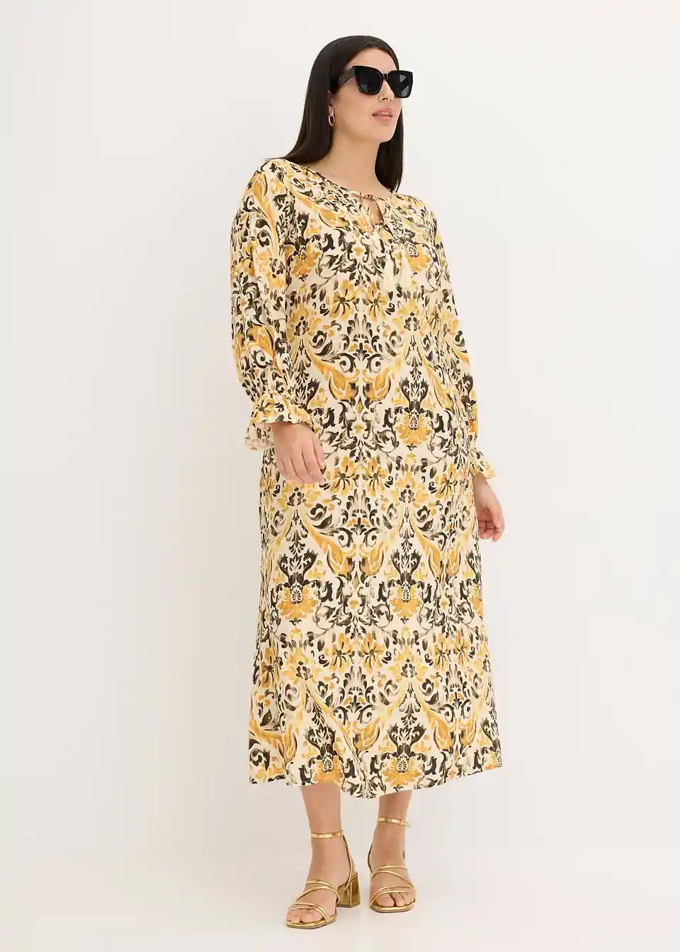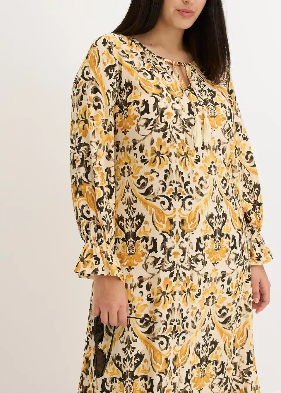 modna tiskana kaftanska obleka iz ležerne viskoze z zavezovanjem spredaj na izrezu