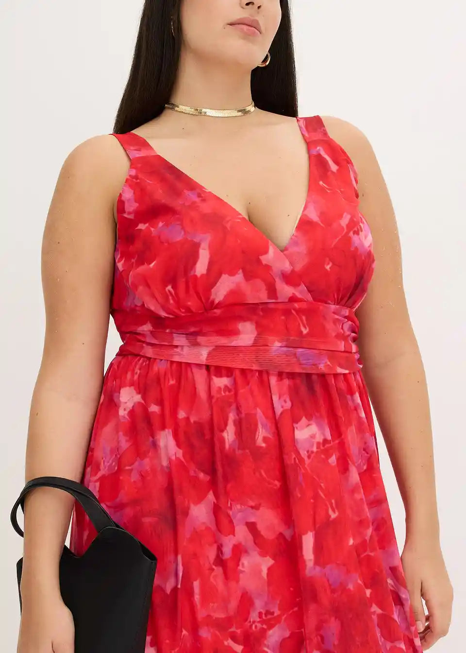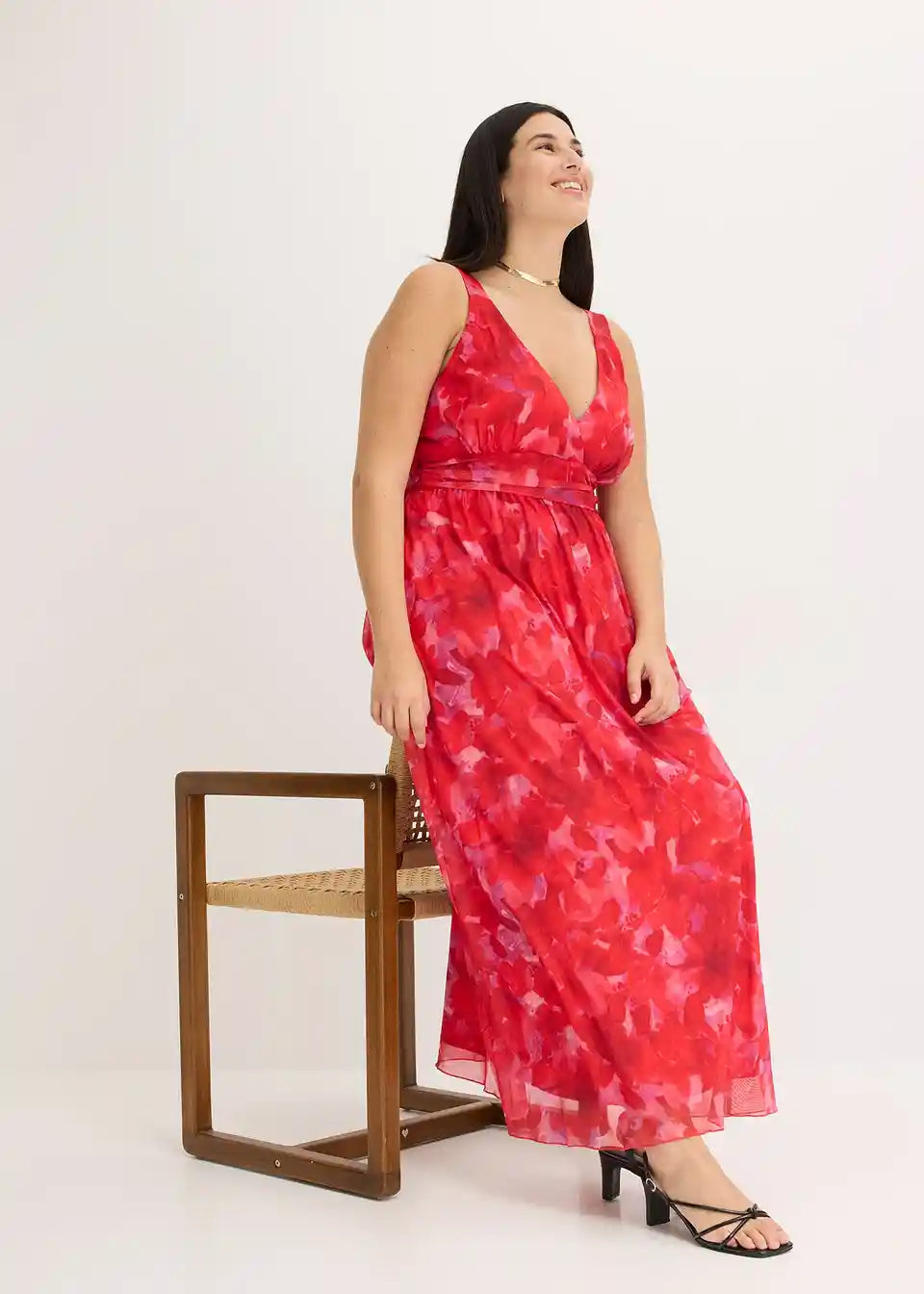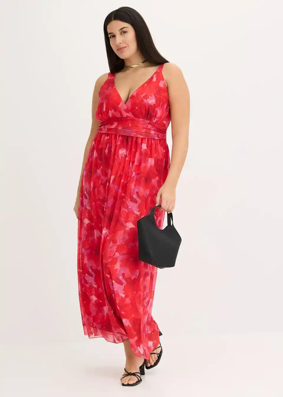 cvetlično potiskana jersey maksi obleka iz mehkega mrežastega materiala z globokim V-izrezom spredaj in drapiranjem v pasu