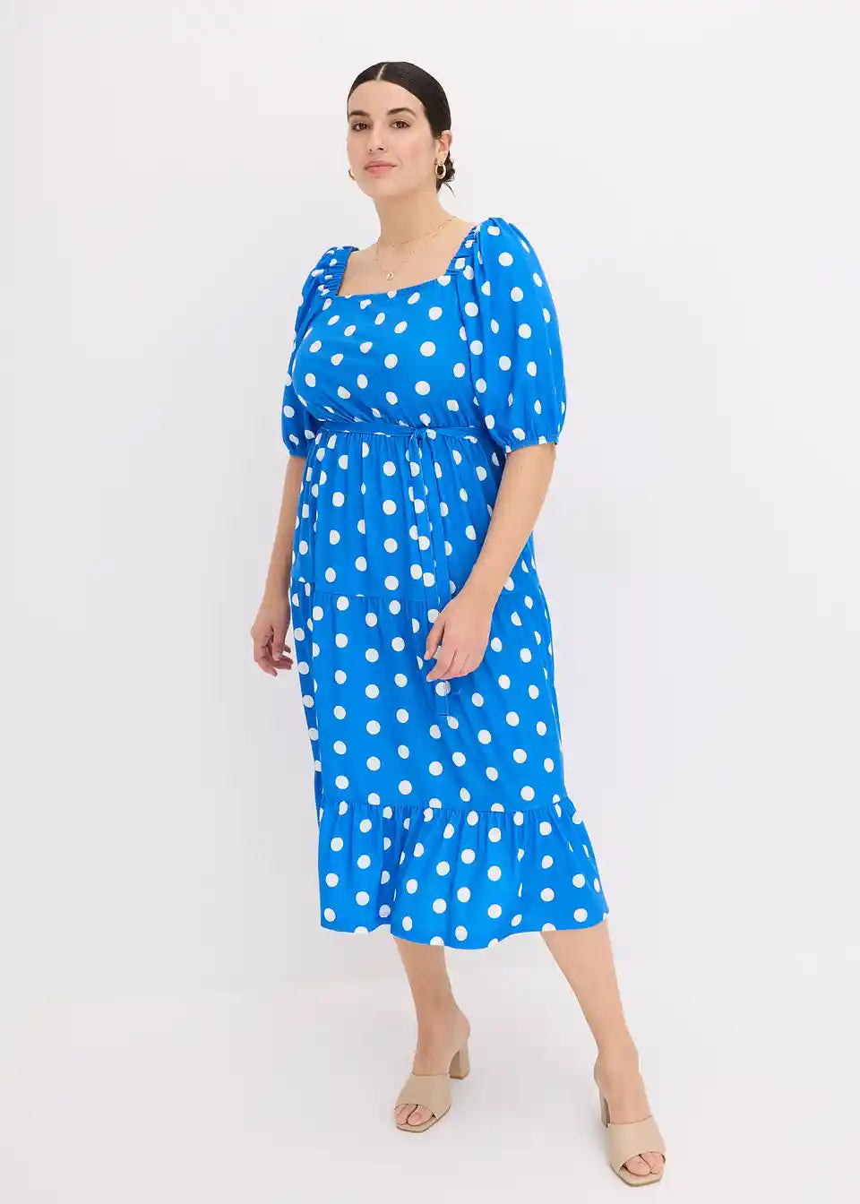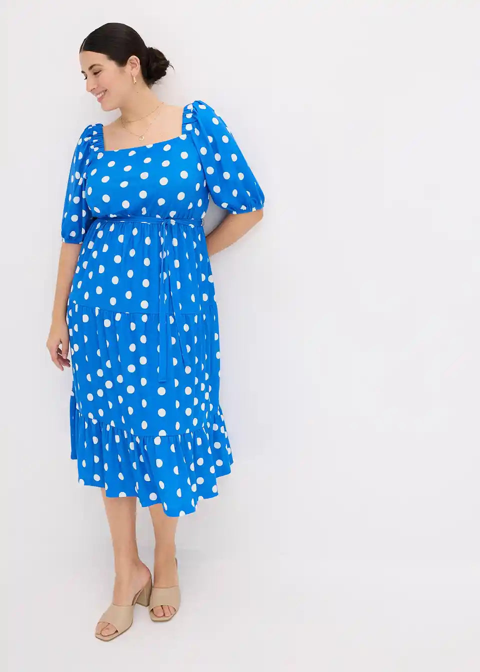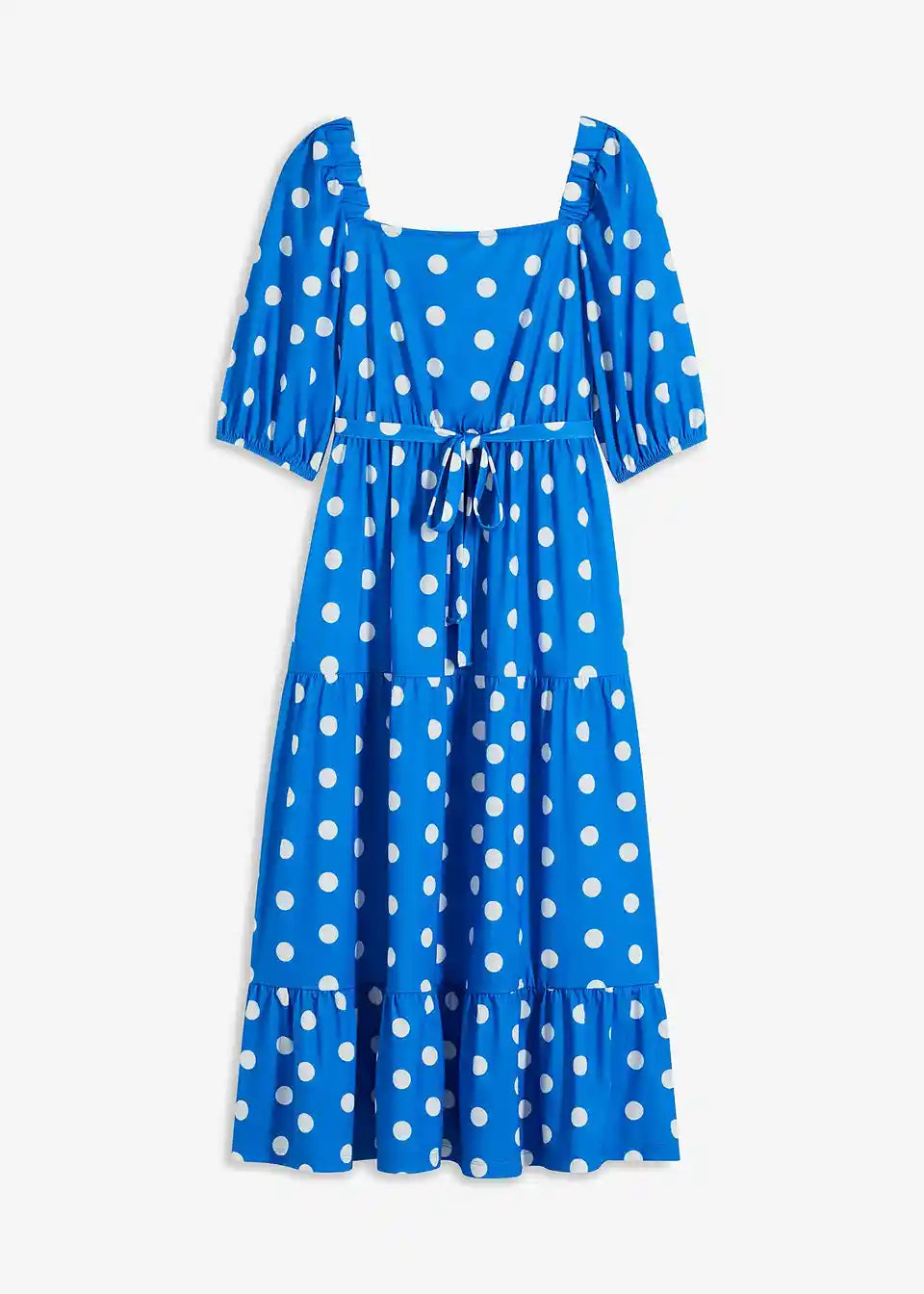ženstvena midi jersei obleka z modnim pikčastim potiskom.
