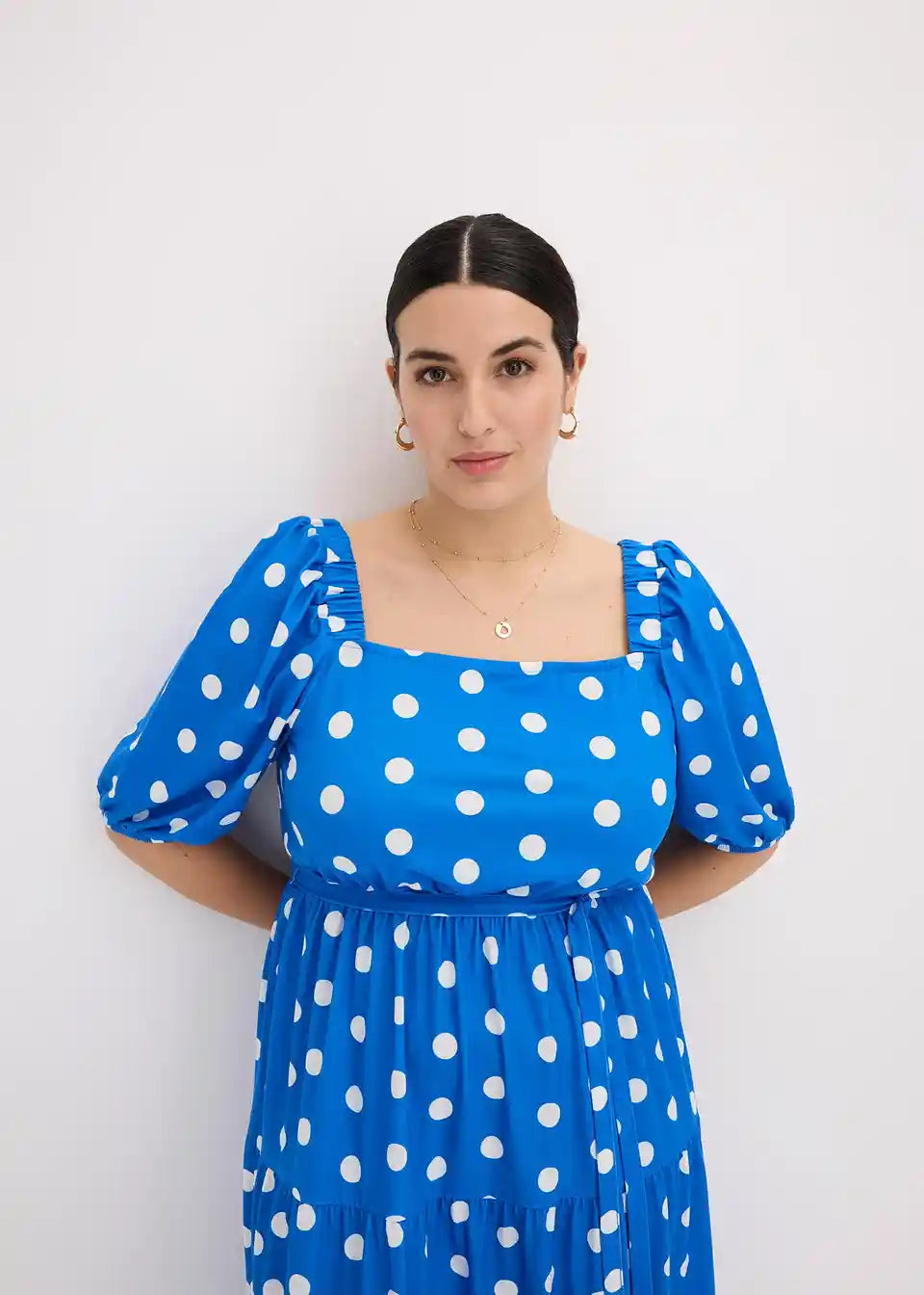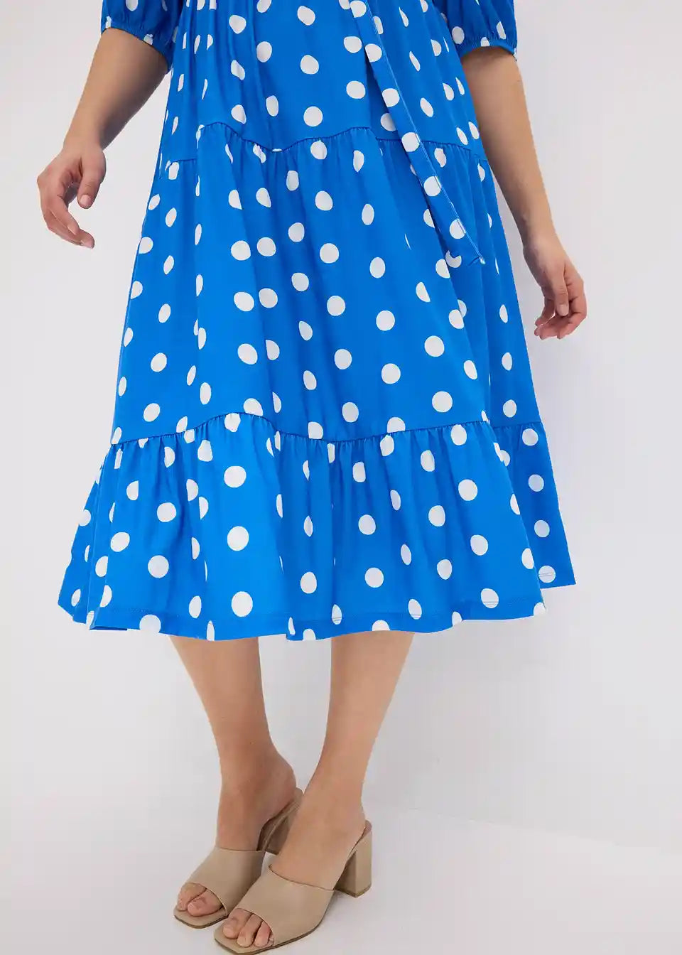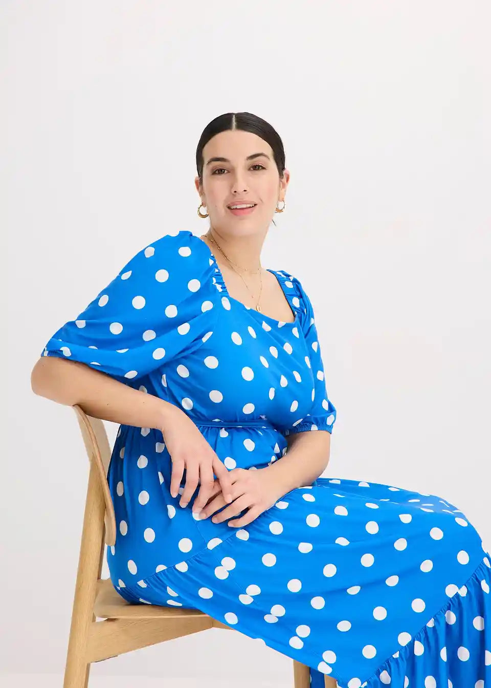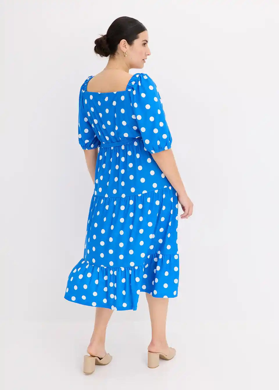 ženstvena midi jersei obleka z modnim pikčastim potiskom.