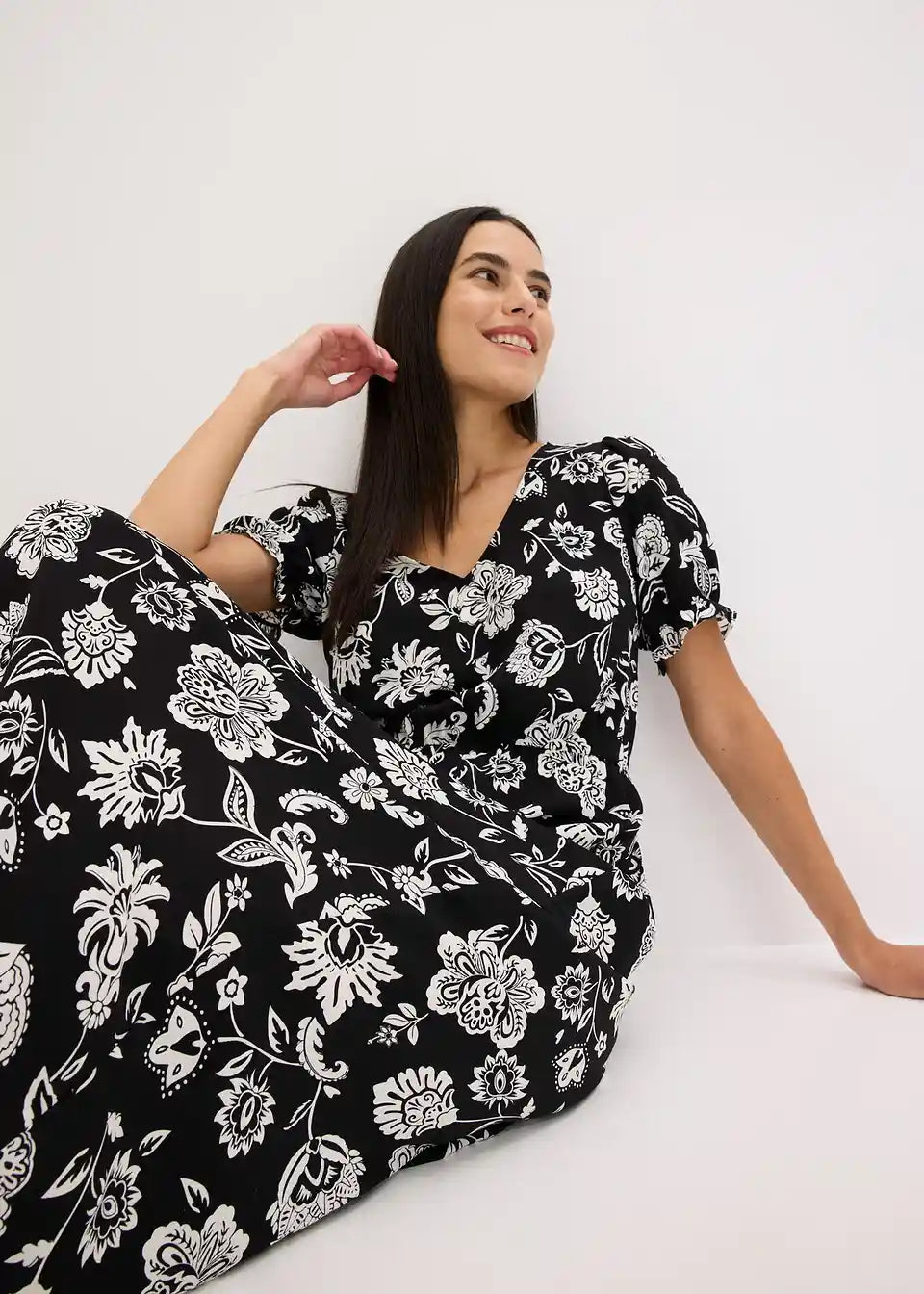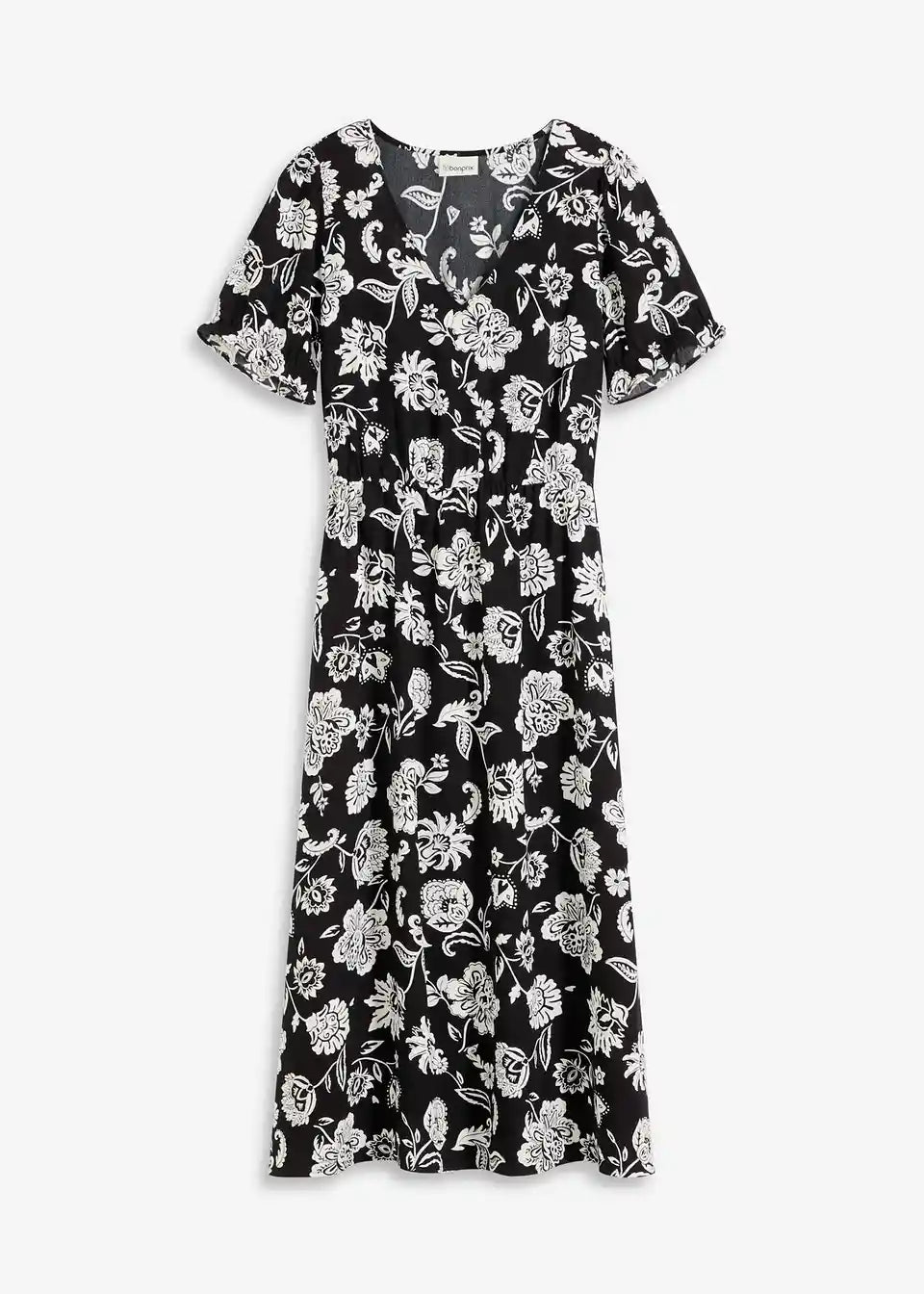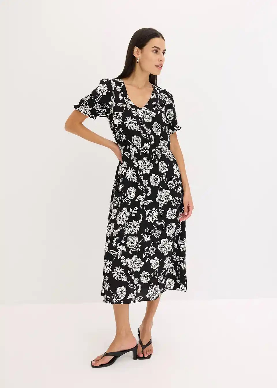 cvetlično tiskana midi obleka s puhastimi rokavi in majhnimi volančki na robu rokavov