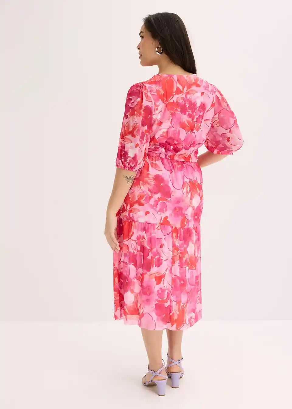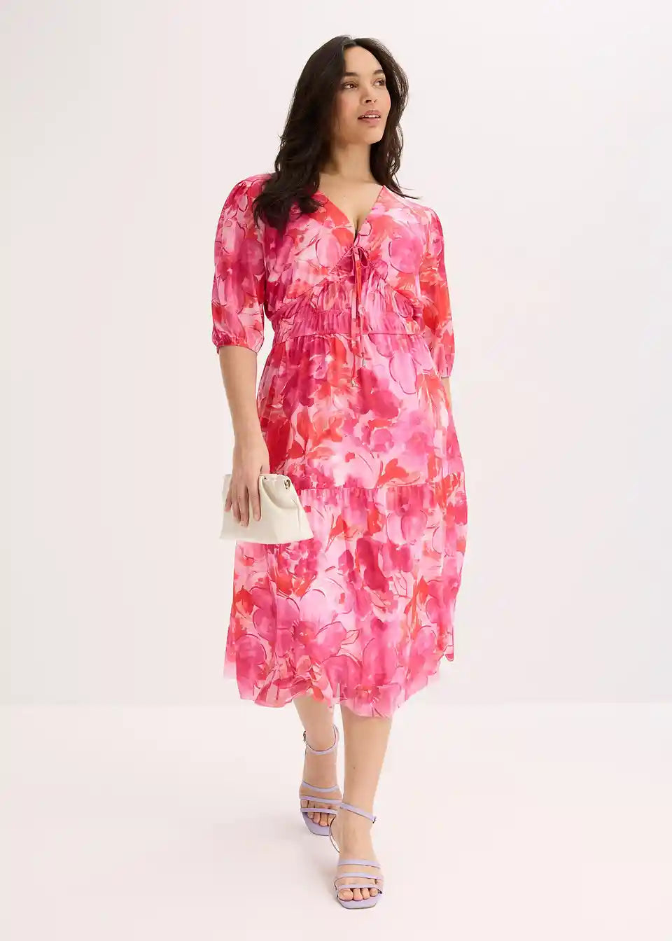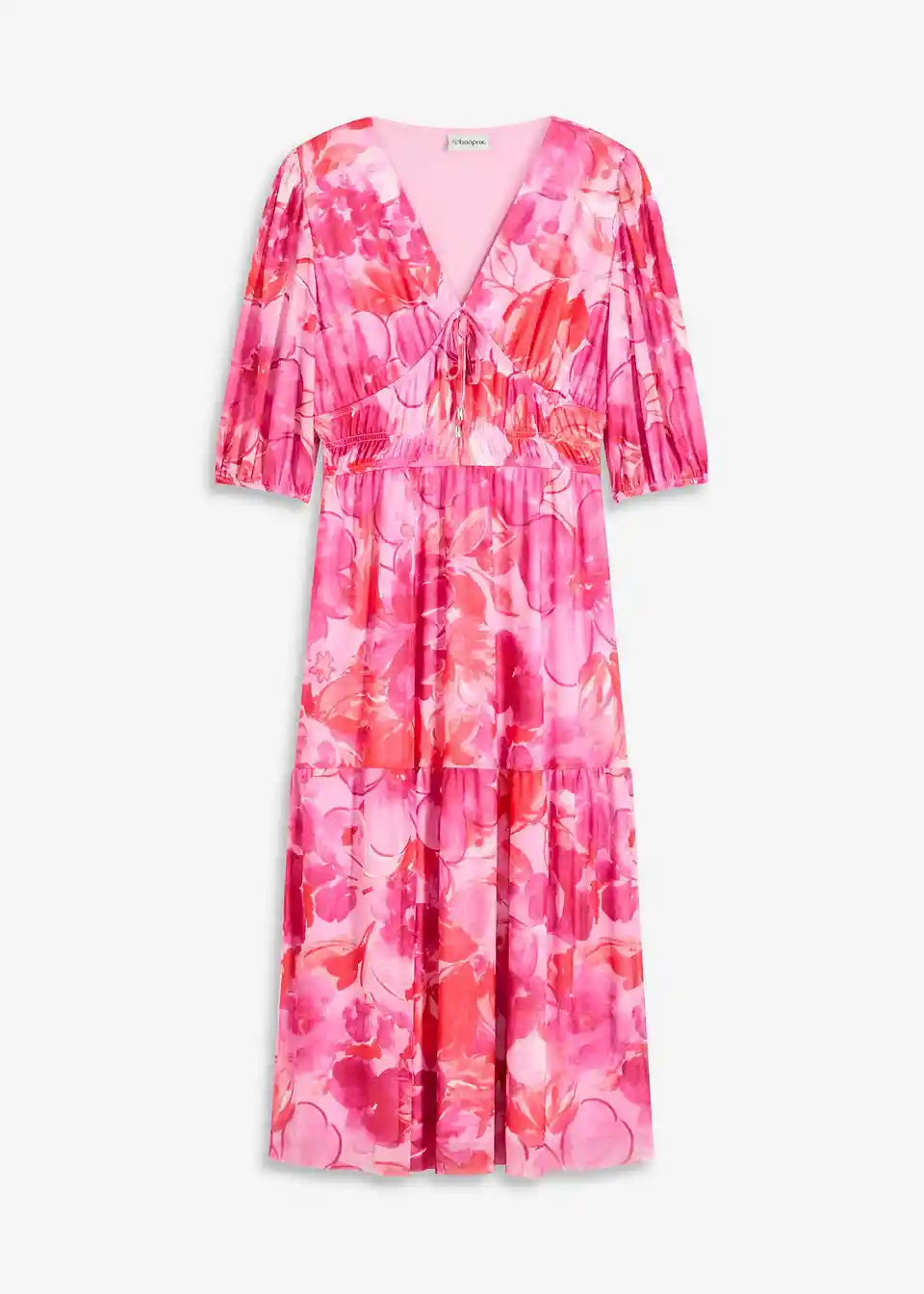 tiskana midi obleka iz mehke mrežaste tkanine z dekorativnim zavezovanjem spredaj pri izrezu