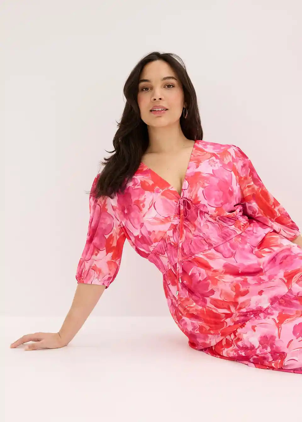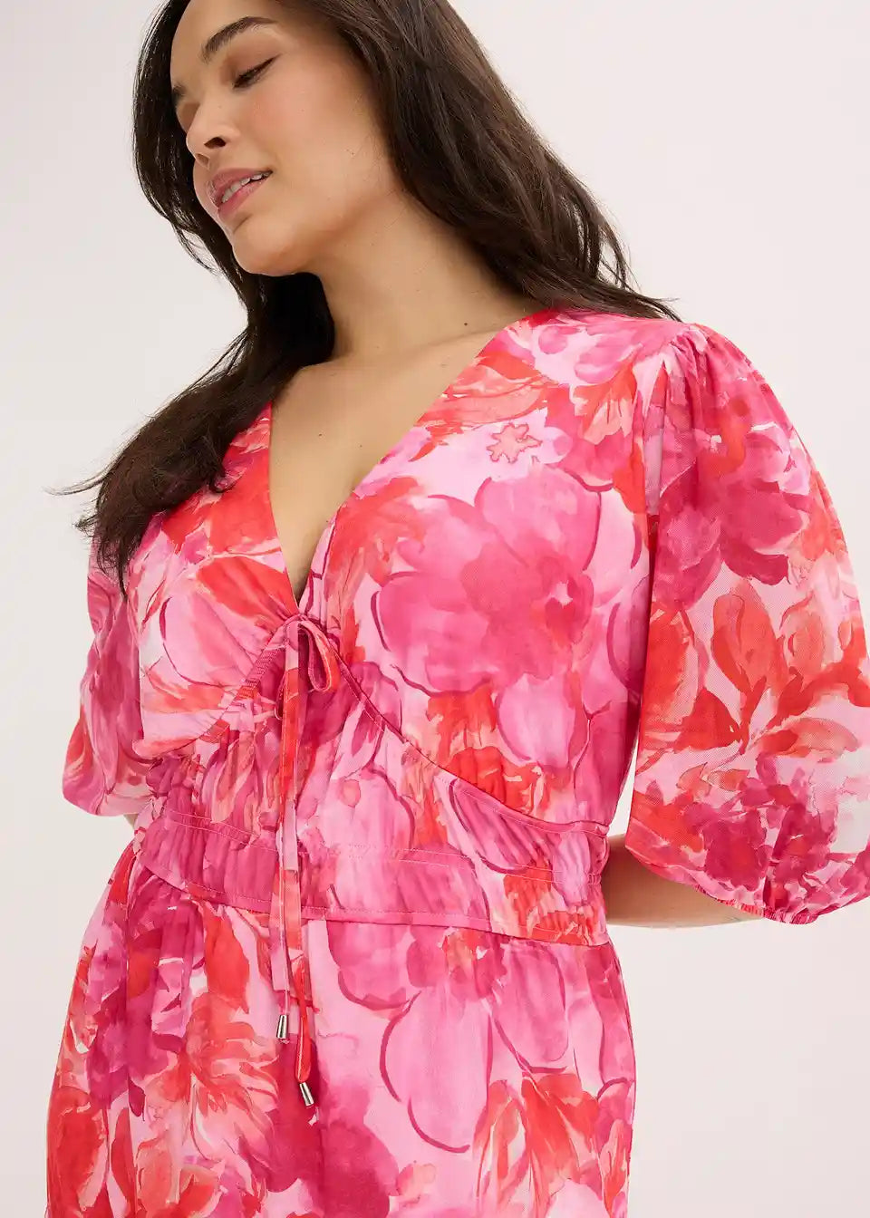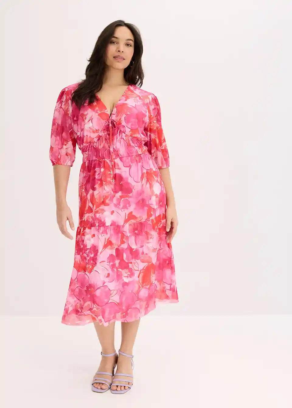 tiskana midi obleka iz mehke mrežaste tkanine z dekorativnim zavezovanjem spredaj pri izrezu